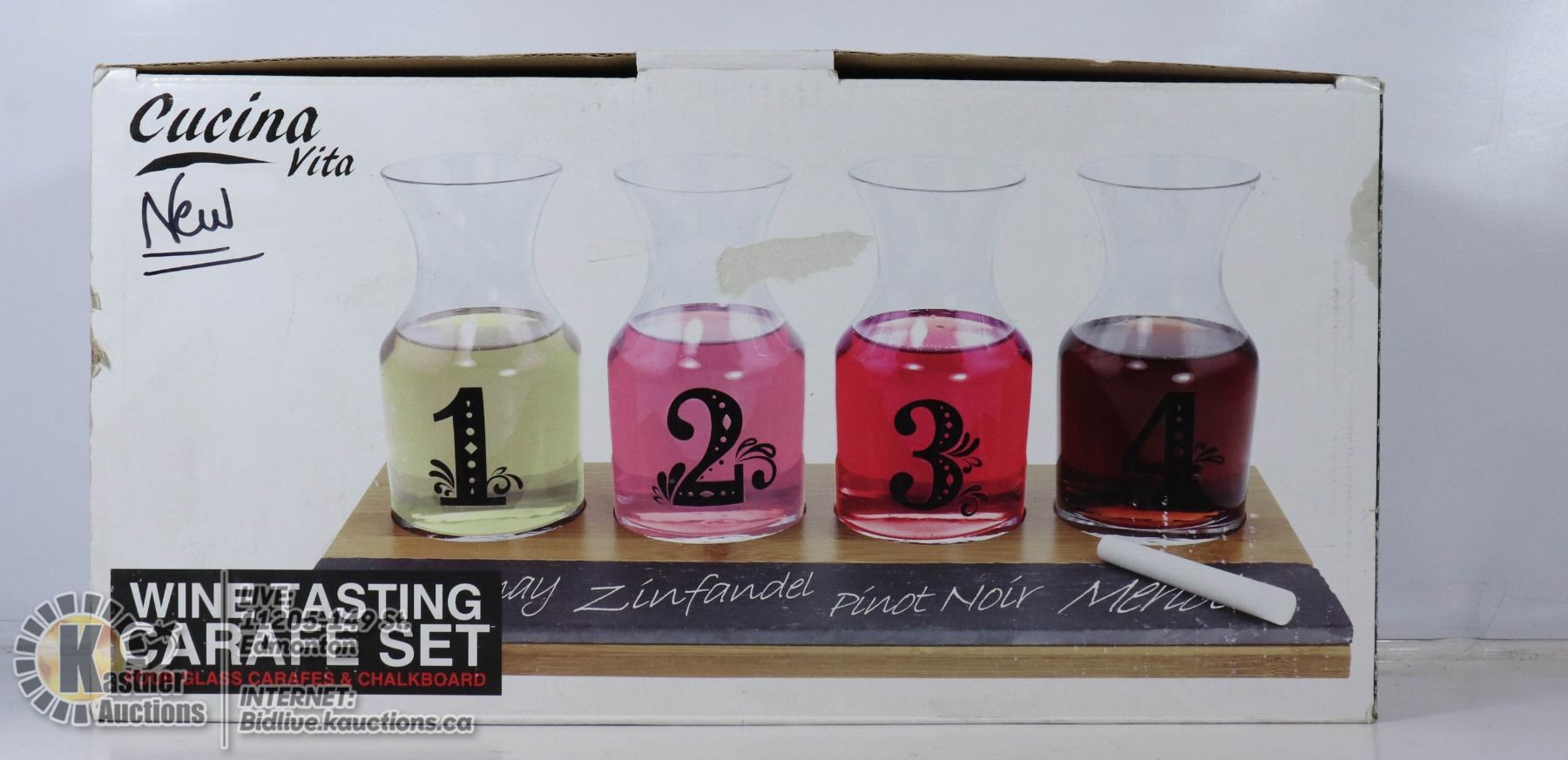 FOUR GLASS CARAFES AND CHALKBOARD SET