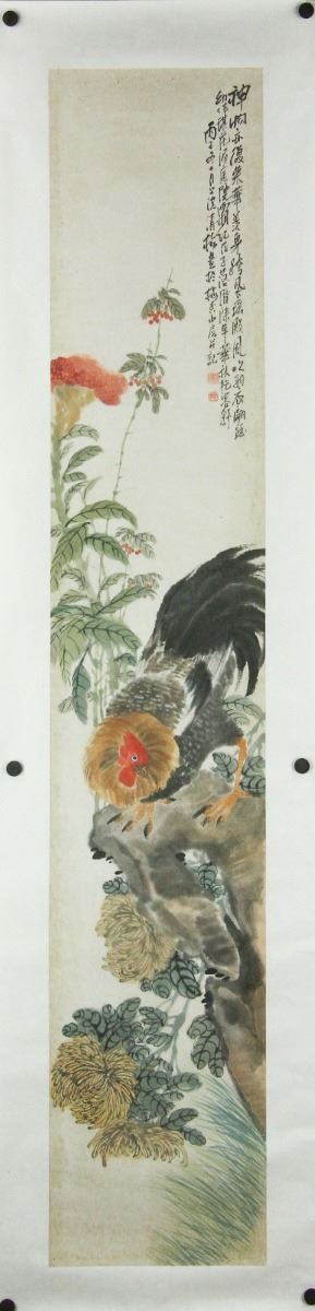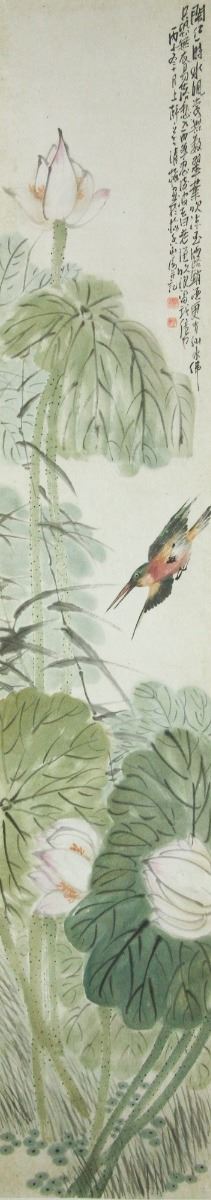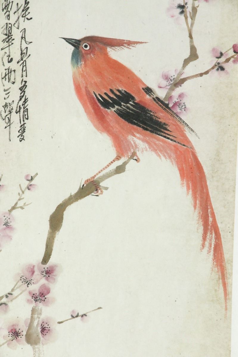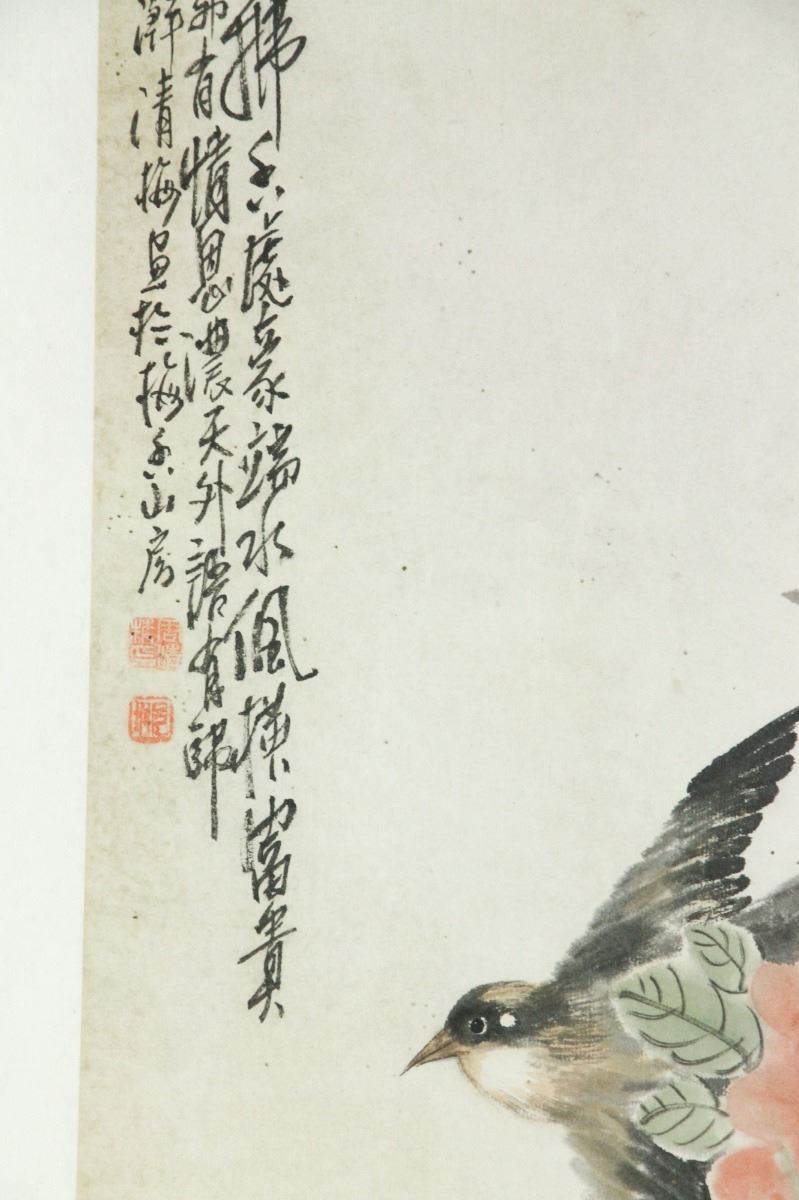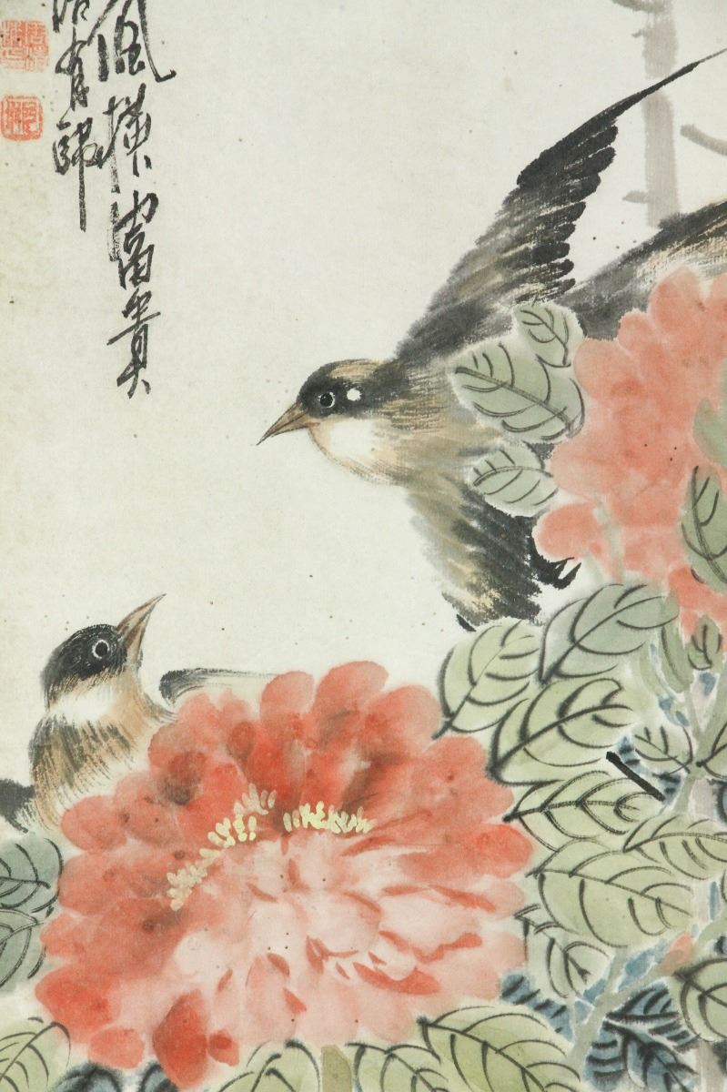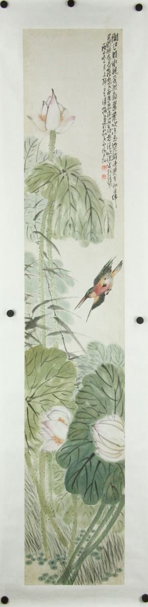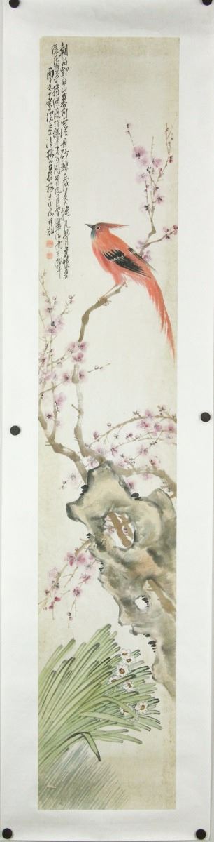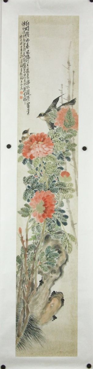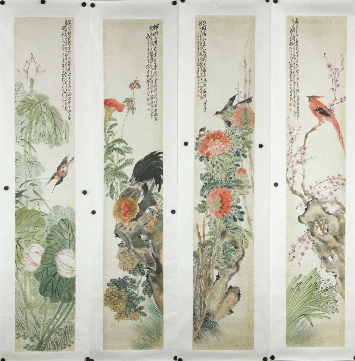Four pieces of flowers and birds paintings; Chinese ink and watercolour on paper; signed Zhou Meiqing and inscribed with two artist seals on each painting; 149.5 cm X 27 cm