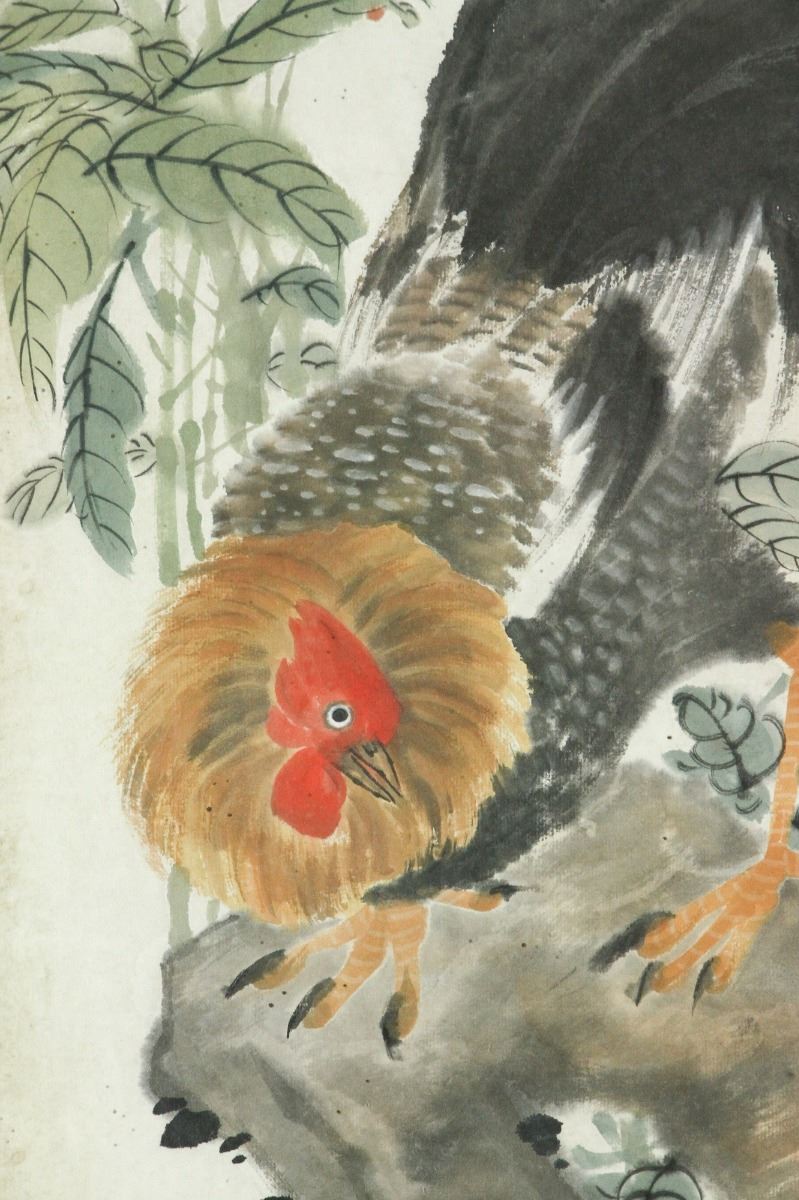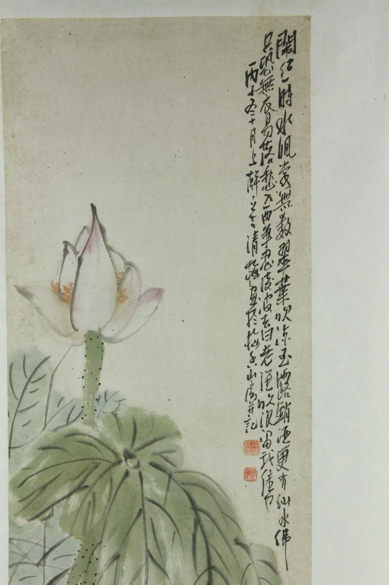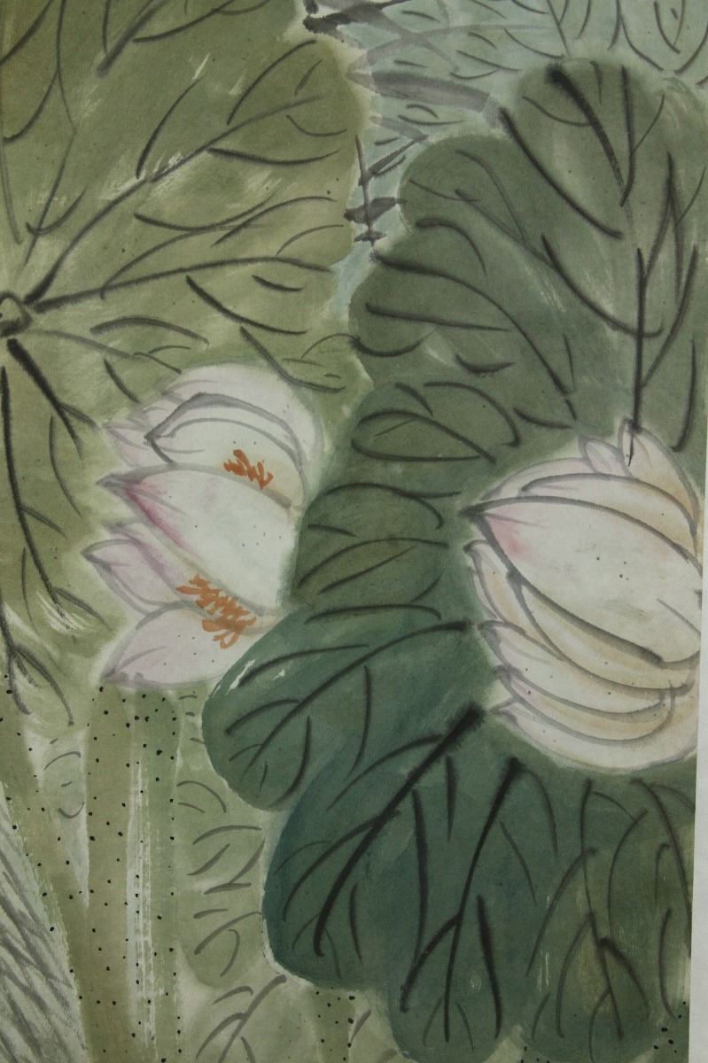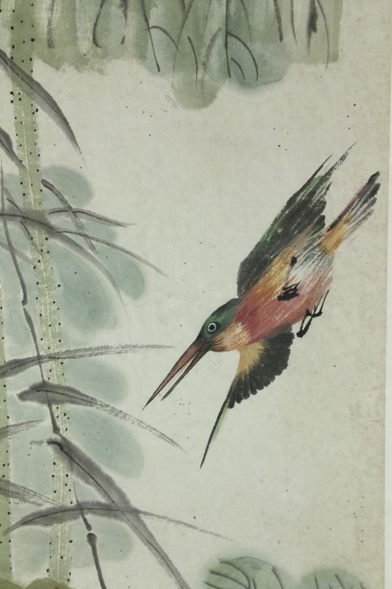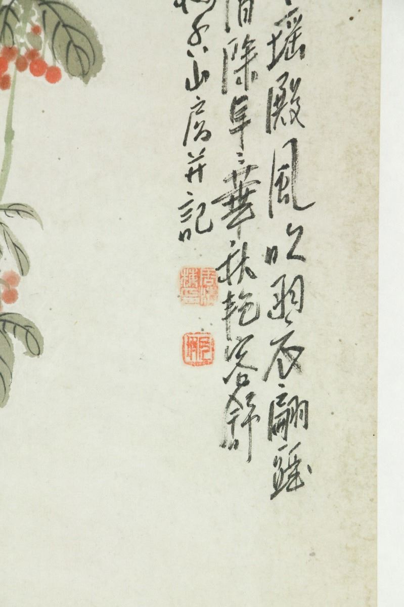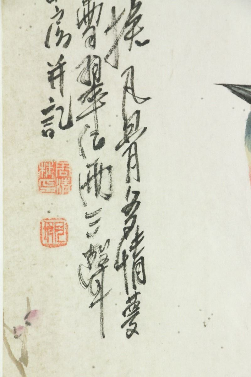 Four pieces of flowers and birds paintings; Chinese ink and watercolour on paper; signed Zhou Meiqing and inscribed with two artist seals on each painting; 149.5 cm X 27 cm