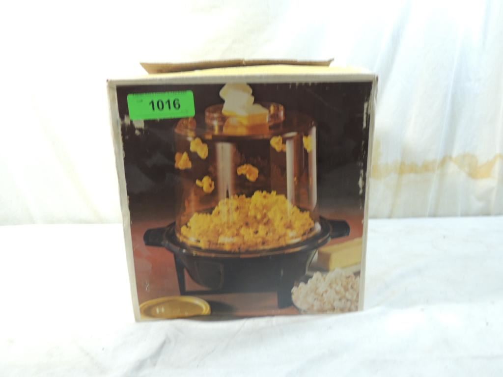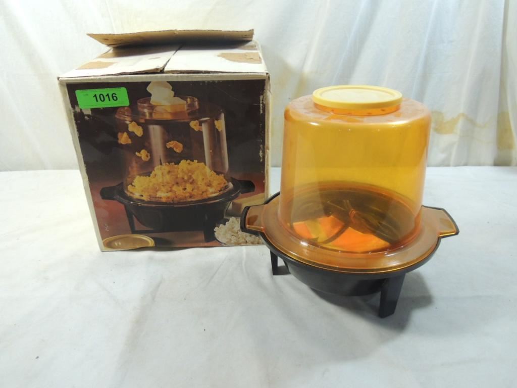 VINTAGE SELF BUTTERING CORN POPPER IN ORIGINAL BOX, POPPER COVER FLIPS OVER TO BECOME A CONVENIENT SERVER, AS SHOWN SEE PHOTO FOR MORE DETAILS.