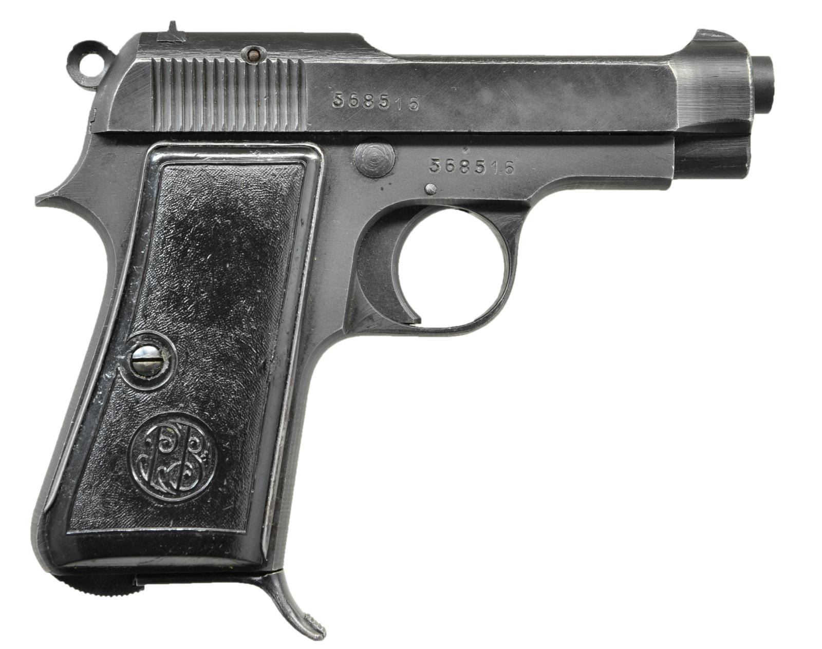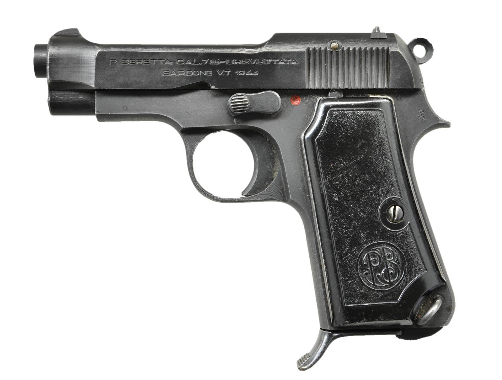 Cal. 7.65mm (32 ACP). S #568516. Matching S # on Bbl. and slide. Bbl. 3 3/8". Left rear of frame is marked w/ an inverted Italian "4UT" (4th Technical Control Unit) stamp. It is believed that these "4UT" marked pistols were largely issued to the German army and a smaller number possibly issued to the Japanese. Left side of slide has standard Beretta markings w/ 1944 date. PB marked black plastic grips. MAGS: 1-8 Rd. blued and unmarked. CONDITION: grips show light handling wear. Metal retains 90% original parkerized finish w/ scattered light silvering. Very good bore. (22-3569/MJC). CURIO. $500-700.