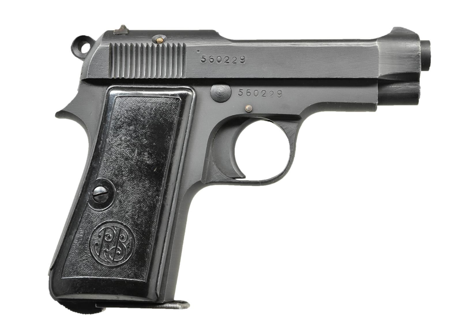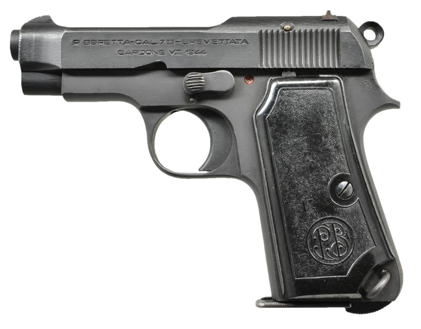 Cal. 7.65mm (32 ACP). S #560229. Matching S # on slide and Bbl. Bbl 3 3/8". Left rear of frame marked w/ Italian "4UT" marking (4th Technical Control Unit). It is believed the bulk of these 4UT marked guns ended up in German service w/ a lesser number ending up in Japanese service. Left side of slide marked w/ Beretta markings and 1944 date. Black plastic grips w/ PB logo. MAGS: 1-8 rd. unmarked. CONDITION: grips show some scratches and light handling wear. Metal retains 95% original parkerized finish w/ a couple small spots of pitting flaws. Near excellent bore. (22-3572/MJC). CURIO. $500-700.