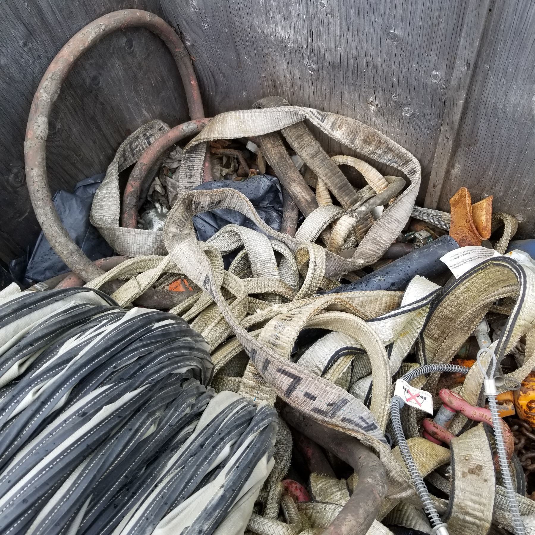 4X4 CRATE STRAPS, RATCHETS 1 TONNE CHAIN FALL HEATER HOSE, SLINGS ,MISC, JACK