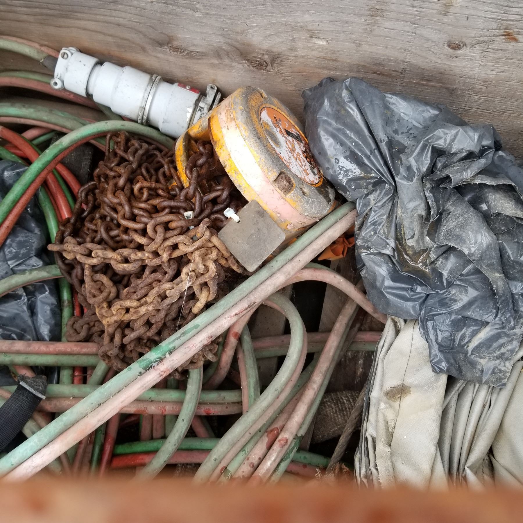 4X4 CRATE, STRAPS, RATCHETS, OXY ACCETALENE HOSES 1 TONNE CHAINFALL, HEATER HOSE, SLINGS ,MISC