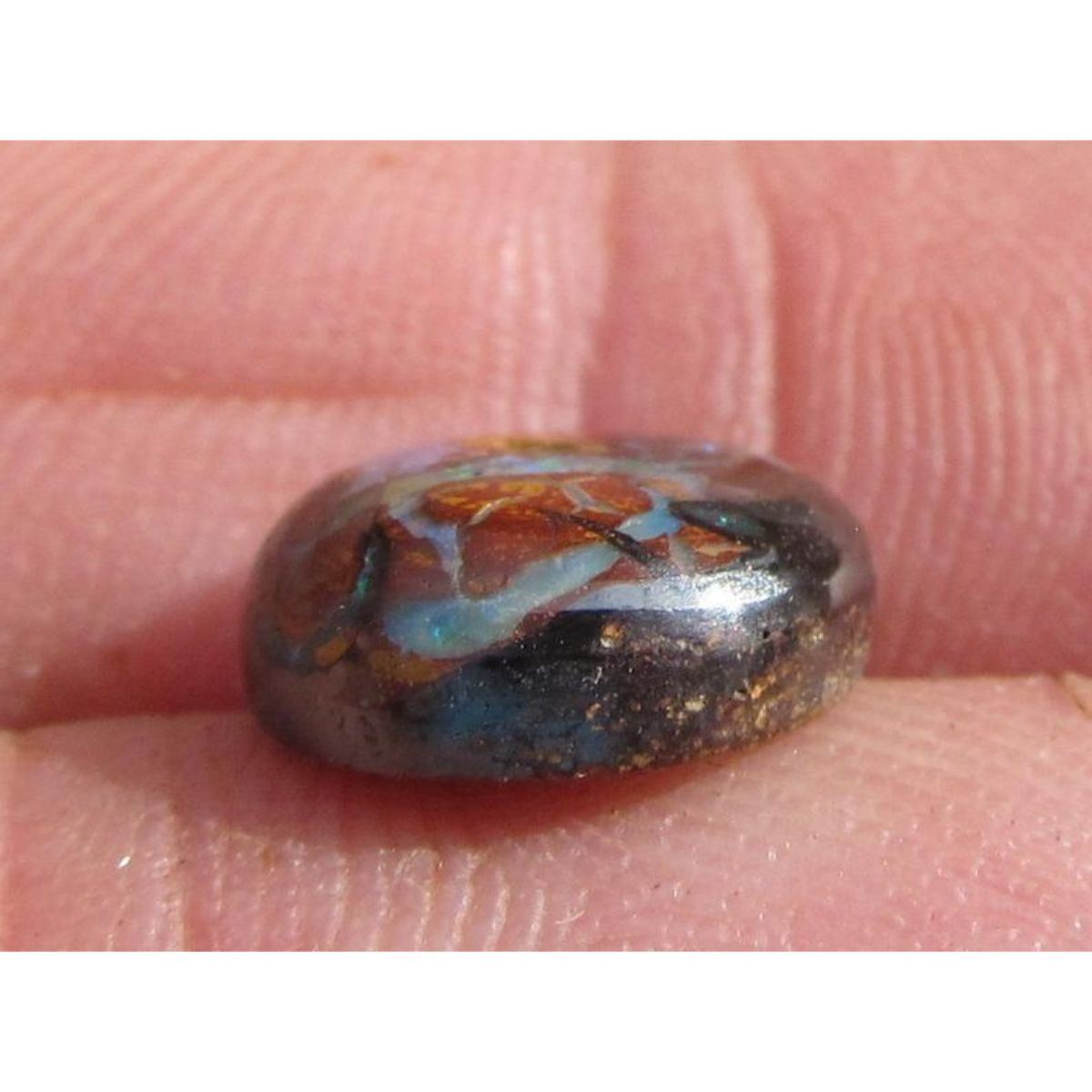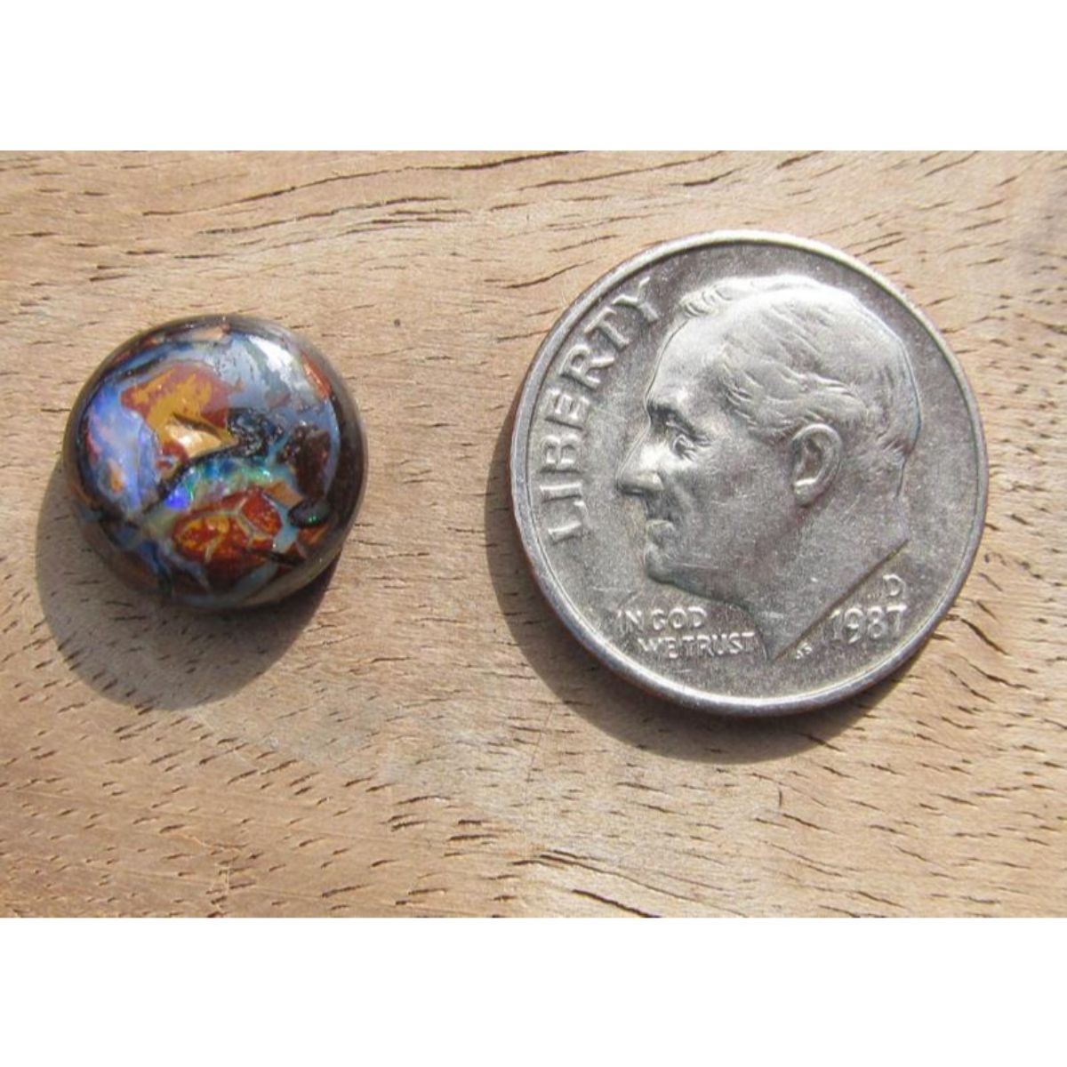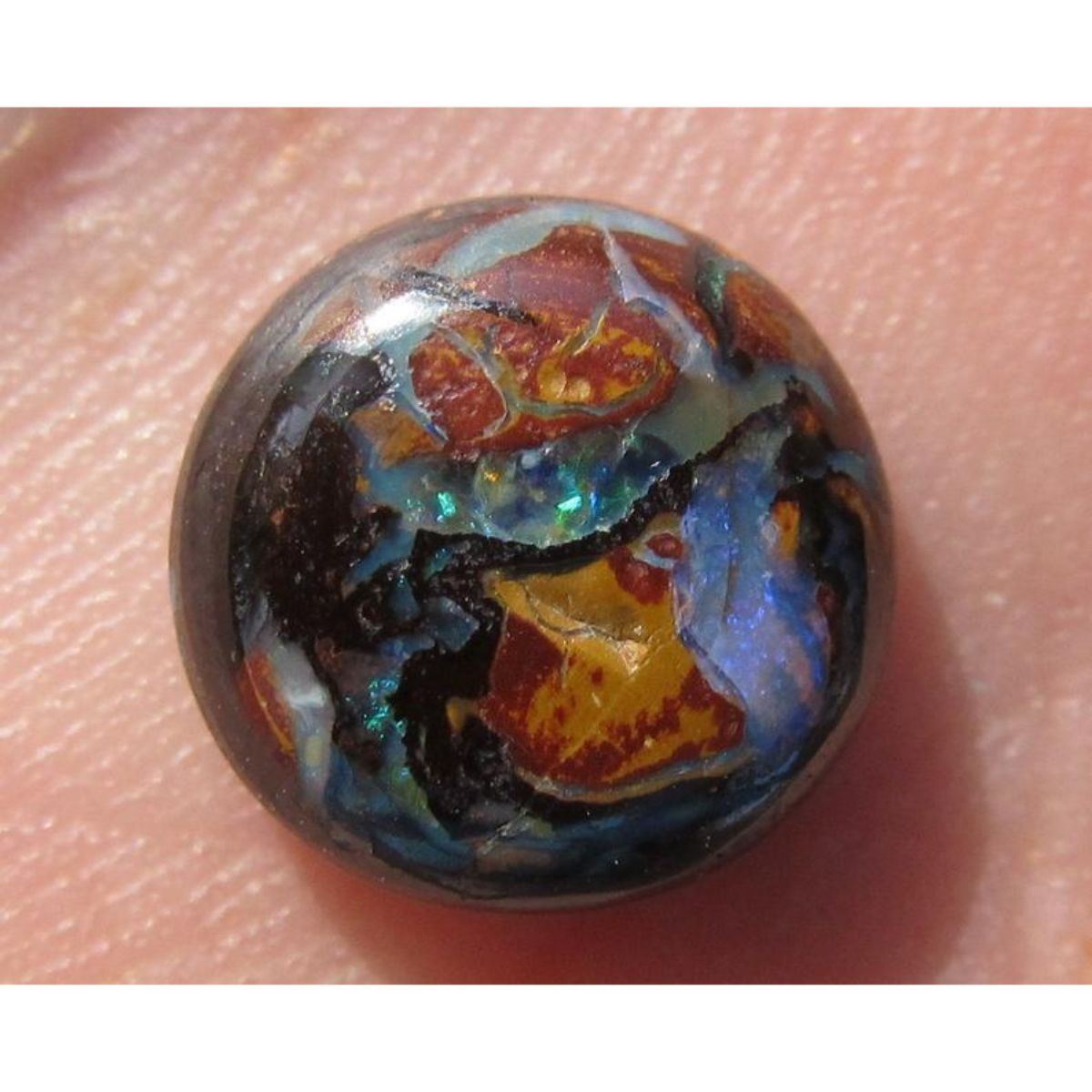 Beautiful 4ct Australian Koroit Boulder Opal, round polished cabochon gemstone, color spot with pits. Perfect ring setting stone with fantastic color. Origin: Koroit Field; Queensland; Australia Appx. Size: 10.5 mm - 4 mm Thick Appx. Weight: 4.0 ct. Â