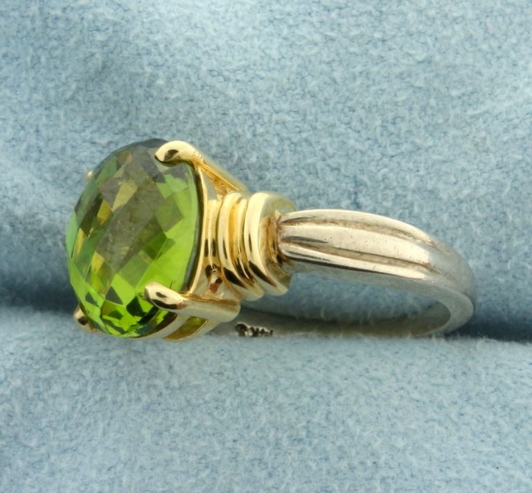In 14k yellow and white gold. 11x9mm natural oval peridot with fancy checkerboard cut. Size 6 1/4. 6.0g.