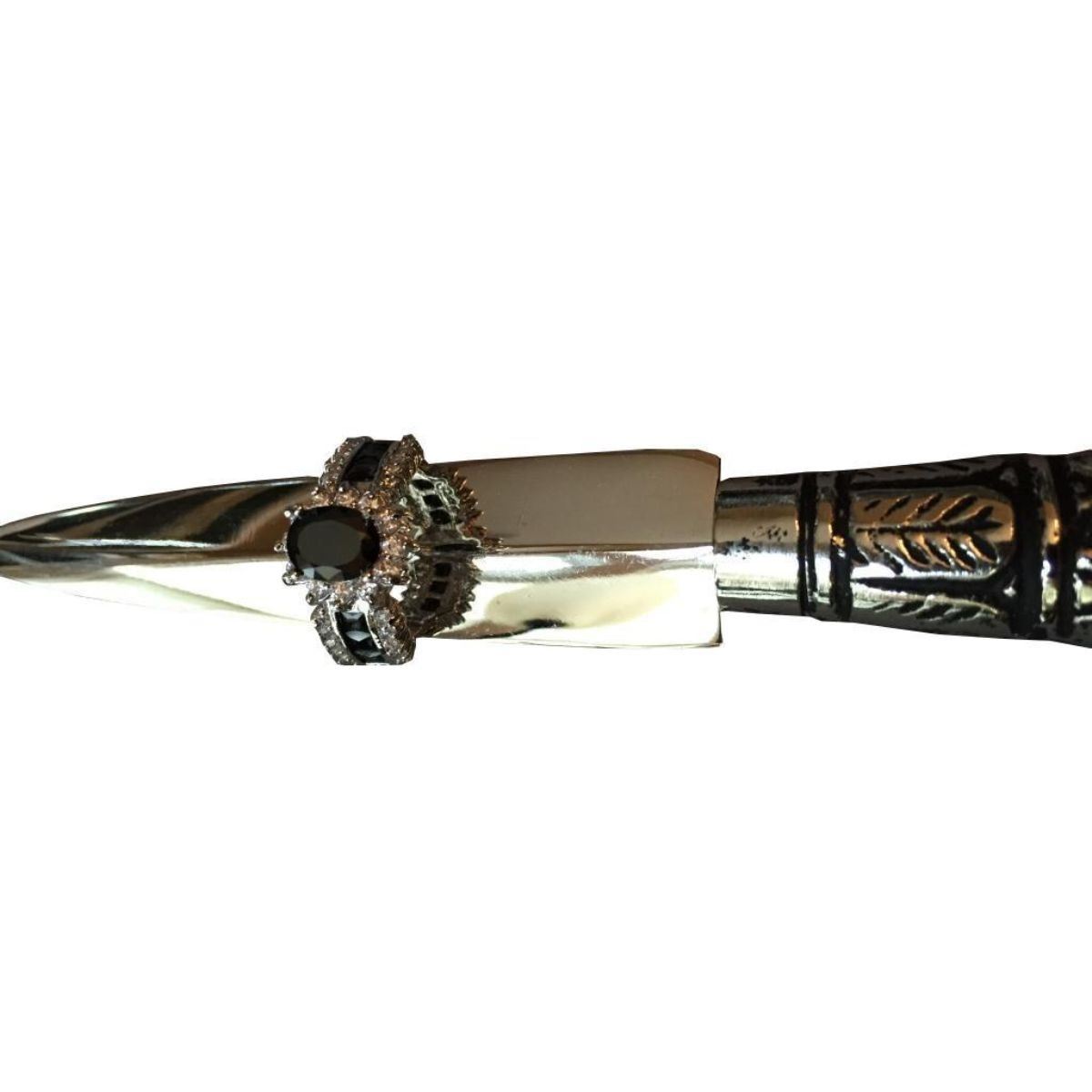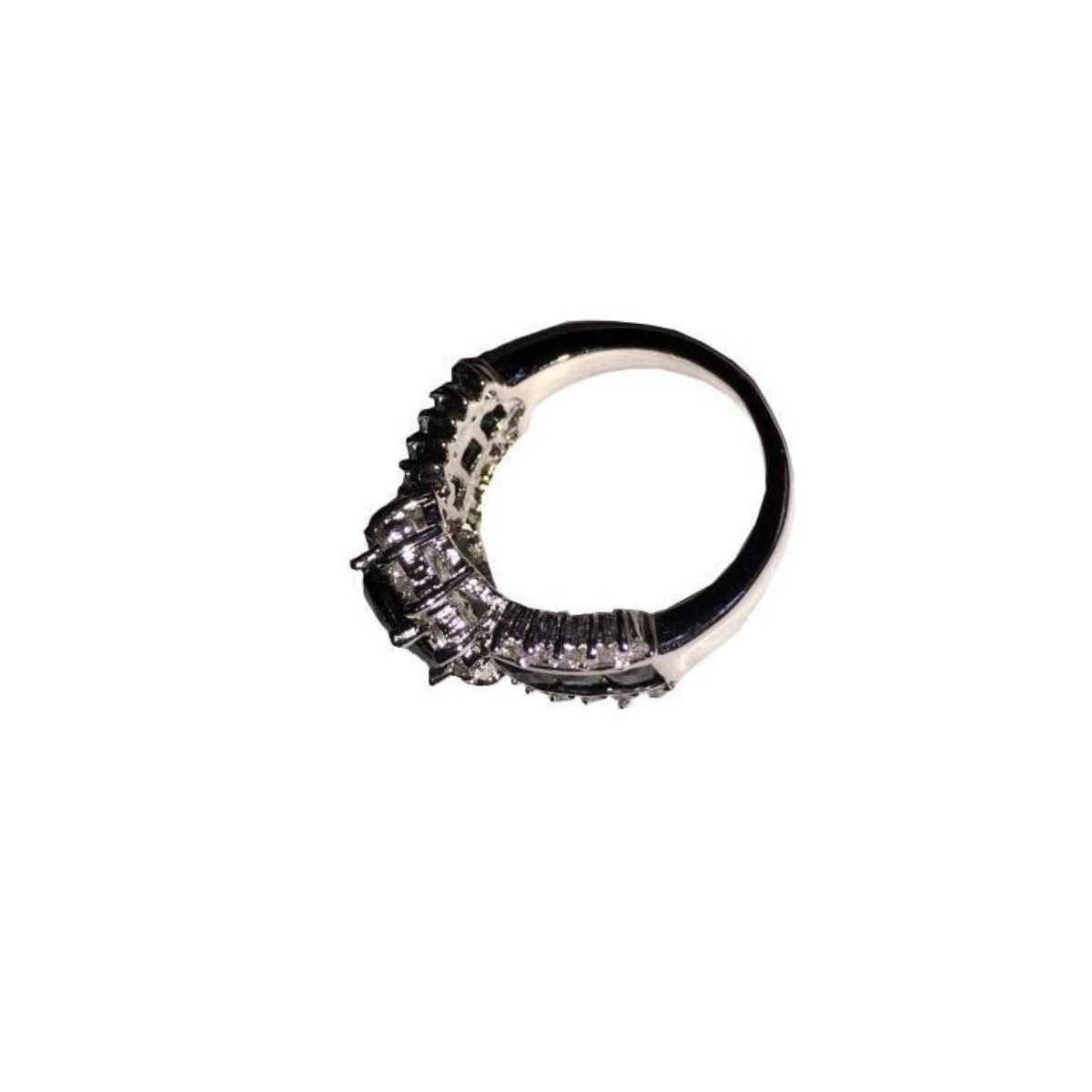 4ct oval faceted * lab-created black sapphire center stone, flanked by 6 square cut * lab-created black sapphires, surrounded by clear cz's , in a 10kt white gold filled setting. Size 8 - 8.5