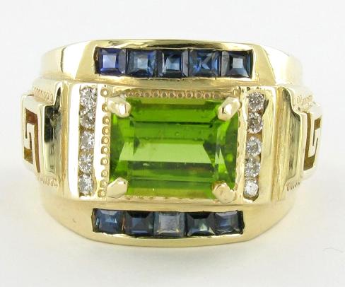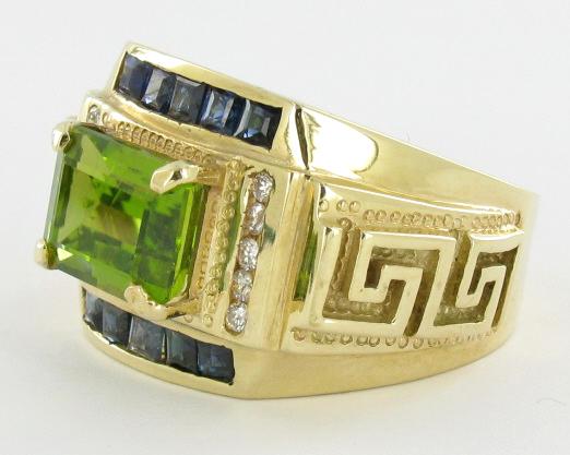 Fabulous new piece with 3.5ct VVS Pakistan Peridot 10 hi grade diamonds and 10 square cut blue sapphires; 14 gold 12 gram total weight; $8995 retail; nearly 1/4 ounce gold alone!!!