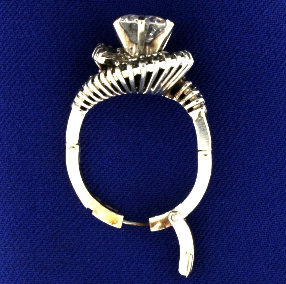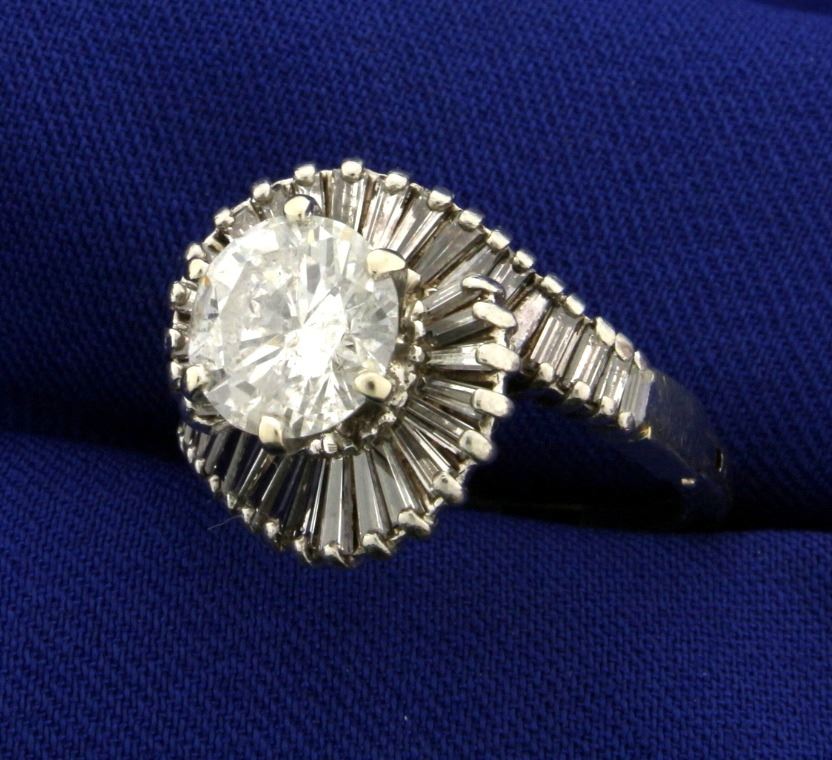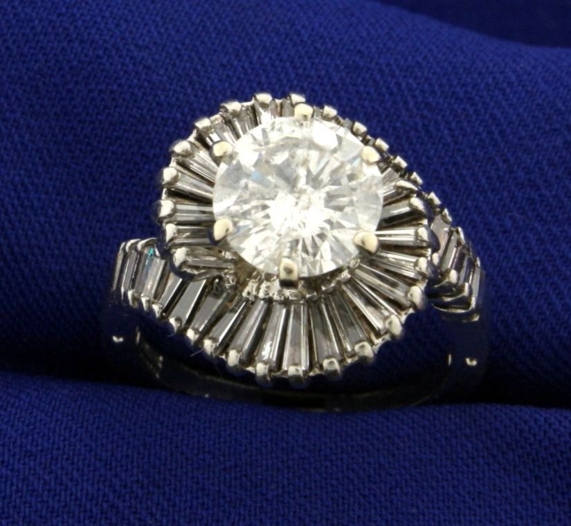 In 14k yellow gold, with a center diamond that is 2ct round high quality diamond. F color/I clarity. Surrounded by 2cts of baguette diamonds with F color/SI clarity. The shank has Arthritic clasp so you can get over knuckle and still fit snugly on finger