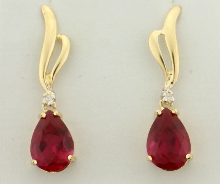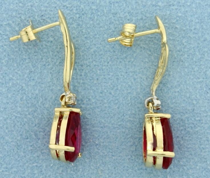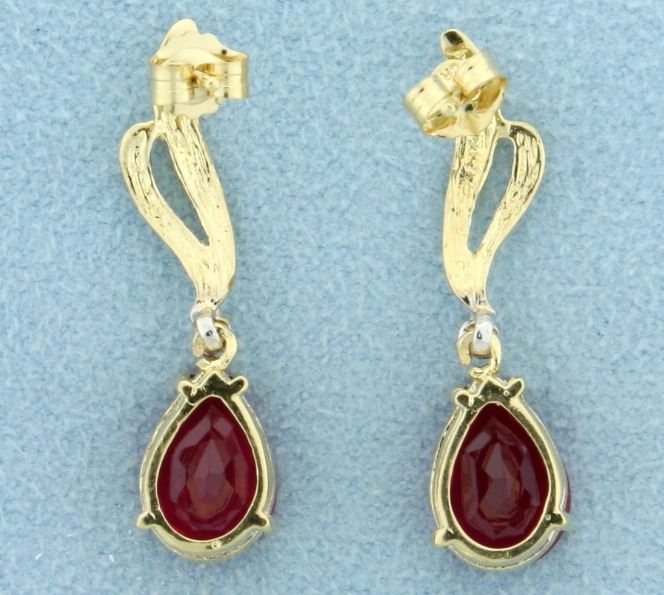 In 14k yellow gold. Each earring contains a natural 10x7mm very high quality pear shaped ruby with bright, vibrant ruby red color with a hint of purple and excellent clarity which makes us believe it is from Sri Lanka. Also contains a .01ct high quality diamond per earring. 1" long, with friction backs. 3.3g.