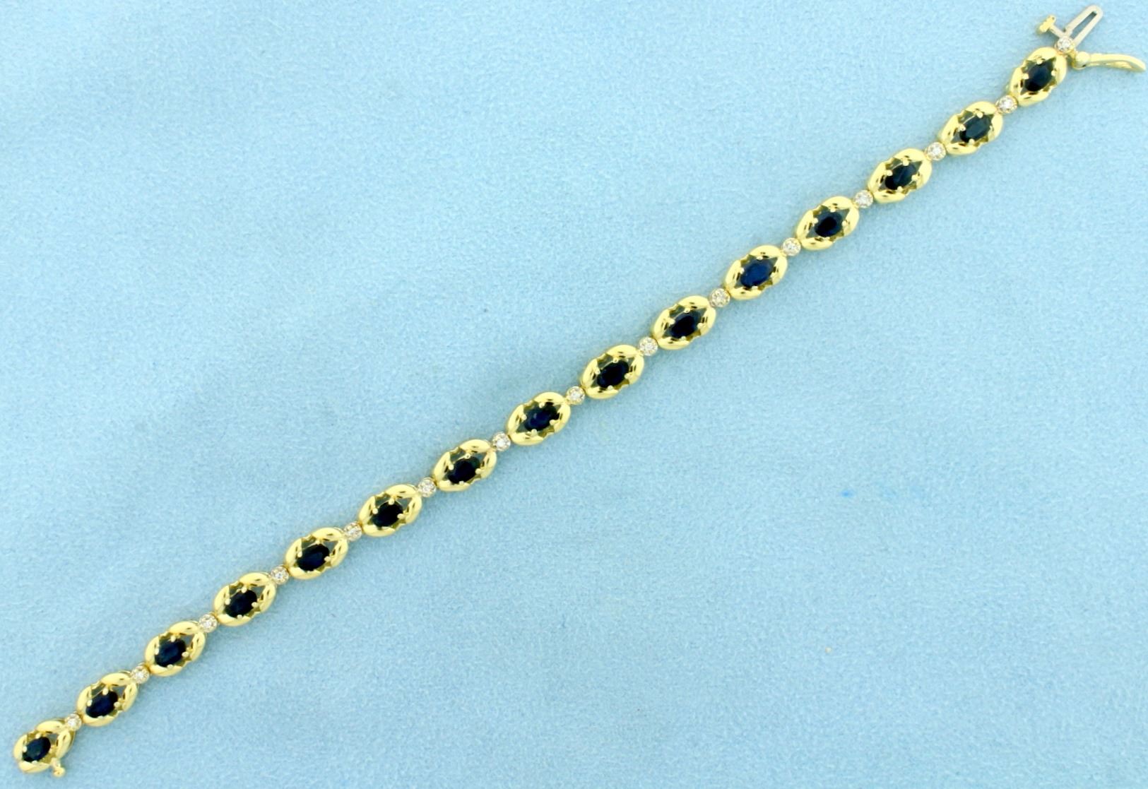 In 14k yellow gold. Contains fifteen natural 5x3mm oval cut sapphire gemstones with deep blue color and excellent clarity. Also contains fifteen high quality .01ct round brilliant diamonds. 7" long, with safety clasp. 10.7g.
