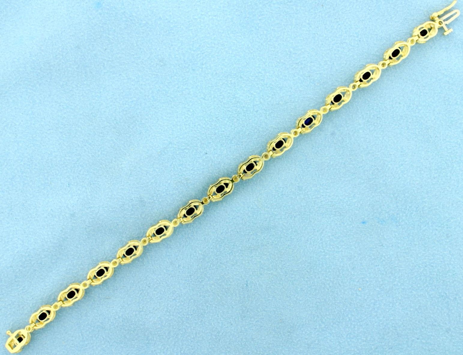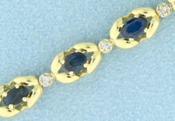 In 14k yellow gold. Contains fifteen natural 5x3mm oval cut sapphire gemstones with deep blue color and excellent clarity. Also contains fifteen high quality .01ct round brilliant diamonds. 7" long, with safety clasp. 10.7g.