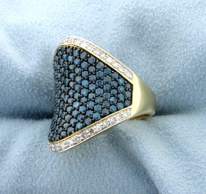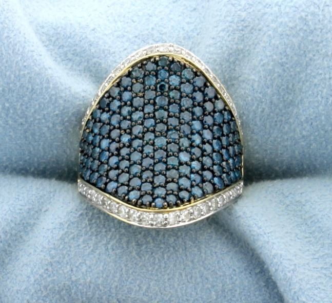 14K yellow gold, this ring contains approximately 1ct total weight of white diamonds and approximately 3ct total weight of blue diamonds, diamonds are SI clarity. Size 8 1/4 6.3g
