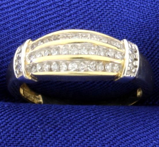 In 10K yellow gold, the ring contains .4ct total weight of full cut .01ct diamonds. Size 7 2.5g