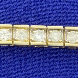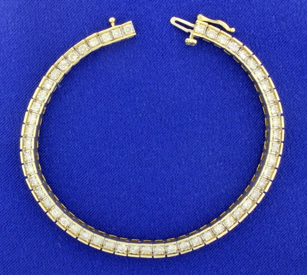 In 14K yellow gold, the bracelet contains fifty four .08ct diamonds that are I color/ SI to I clarity. It is 7 3/8 inches long and has a safety clasp. 15.3g