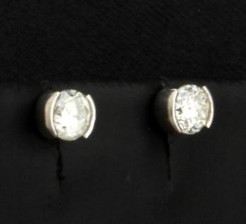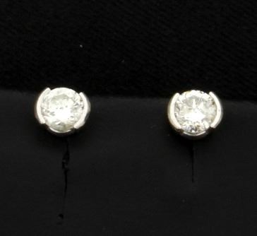 In 14K white gold, the diamonds are in a bezel setting. Diamonds are I1 clarity/I color, they face up bright with lots of sparkle. Comes with friction backs. .7g