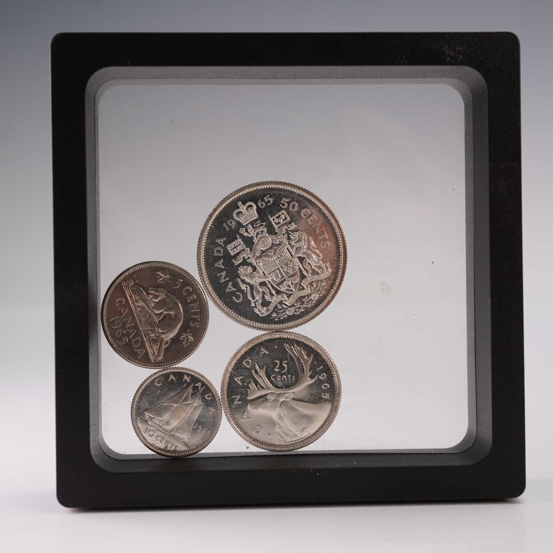 A group of four Canadian coins from 1965 including the 5 cents, 10 cents, 25 cents, and 50 cents denominations. Each obverse bears the portrait of Queen Elizabeth II with inscription ELIZABETH II D G REGINA. The reverses feature traditional Canadian designs: the beaver on the 5 cents, the Bluenose schooner on the 10 cents, the caribou on the 25 cents, and the Canadian coat of arms on the 50 cents. Struck in Canada, these examples reflect the classic mid-20th-century coinage style and national symbols. Composition includes silver content typical of pre-1968 Canadian coinage, with varying percentages depending on the denomination.