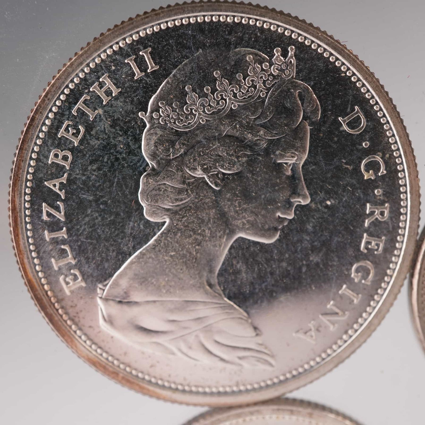 A group of four Canadian coins from 1965 including the 5 cents, 10 cents, 25 cents, and 50 cents denominations. Each obverse bears the portrait of Queen Elizabeth II with inscription ELIZABETH II D G REGINA. The reverses feature traditional Canadian designs: the beaver on the 5 cents, the Bluenose schooner on the 10 cents, the caribou on the 25 cents, and the Canadian coat of arms on the 50 cents. Struck in Canada, these examples reflect the classic mid-20th-century coinage style and national symbols. Composition includes silver content typical of pre-1968 Canadian coinage, with varying percentages depending on the denomination.