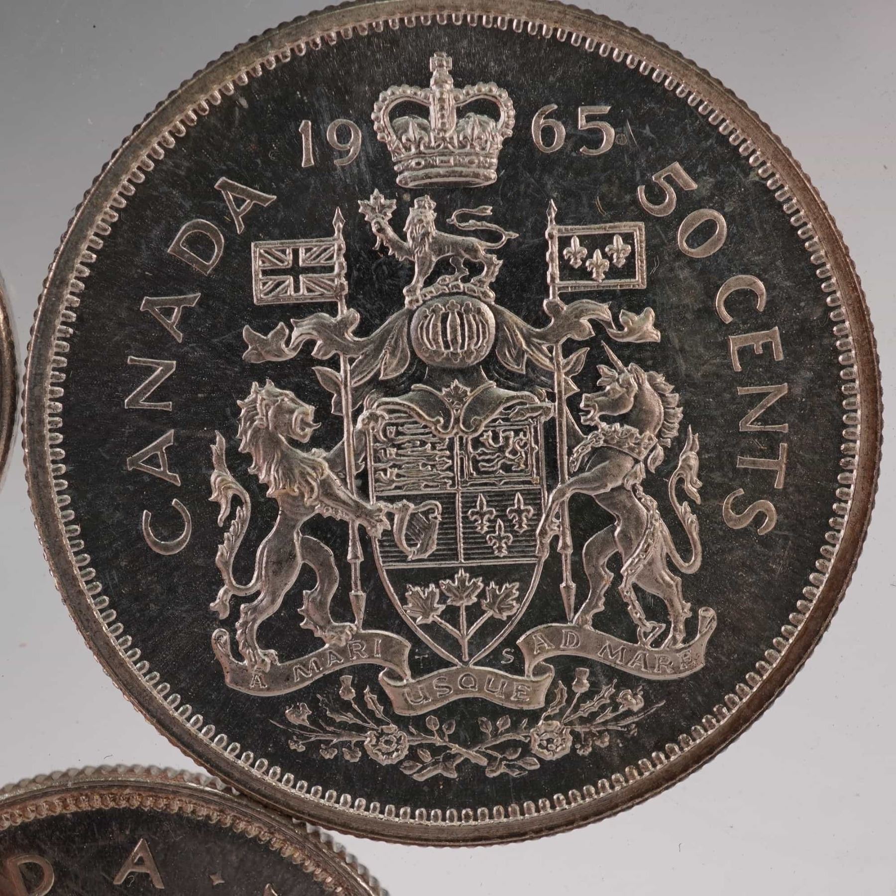 A group of four Canadian coins from 1965 including the 5 cents, 10 cents, 25 cents, and 50 cents denominations. Each obverse bears the portrait of Queen Elizabeth II with inscription ELIZABETH II D G REGINA. The reverses feature traditional Canadian designs: the beaver on the 5 cents, the Bluenose schooner on the 10 cents, the caribou on the 25 cents, and the Canadian coat of arms on the 50 cents. Struck in Canada, these examples reflect the classic mid-20th-century coinage style and national symbols. Composition includes silver content typical of pre-1968 Canadian coinage, with varying percentages depending on the denomination.