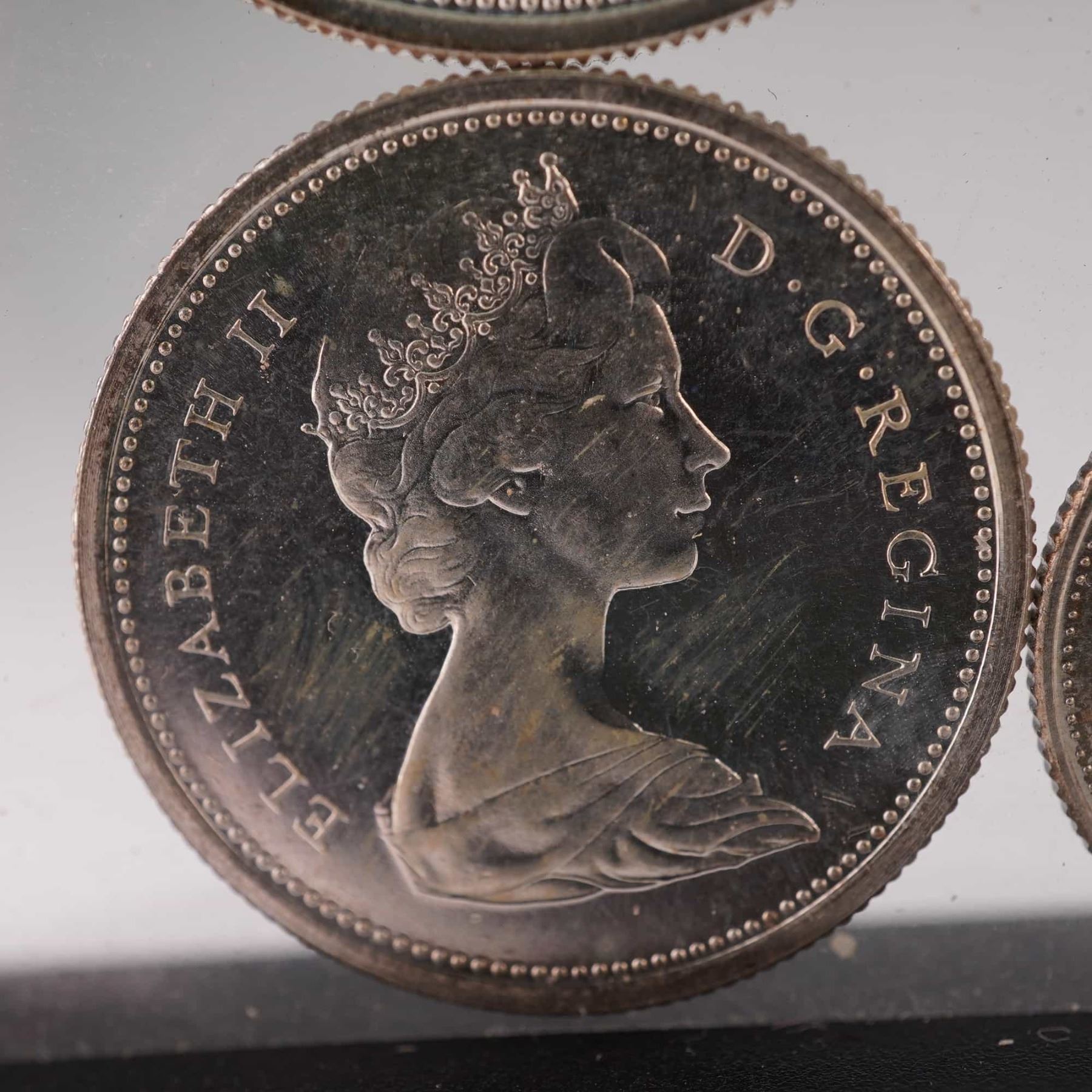 A group of four Canadian coins from 1965 including the 5 cents, 10 cents, 25 cents, and 50 cents denominations. Each obverse bears the portrait of Queen Elizabeth II with inscription ELIZABETH II D G REGINA. The reverses feature traditional Canadian designs: the beaver on the 5 cents, the Bluenose schooner on the 10 cents, the caribou on the 25 cents, and the Canadian coat of arms on the 50 cents. Struck in Canada, these examples reflect the classic mid-20th-century coinage style and national symbols. Composition includes silver content typical of pre-1968 Canadian coinage, with varying percentages depending on the denomination.