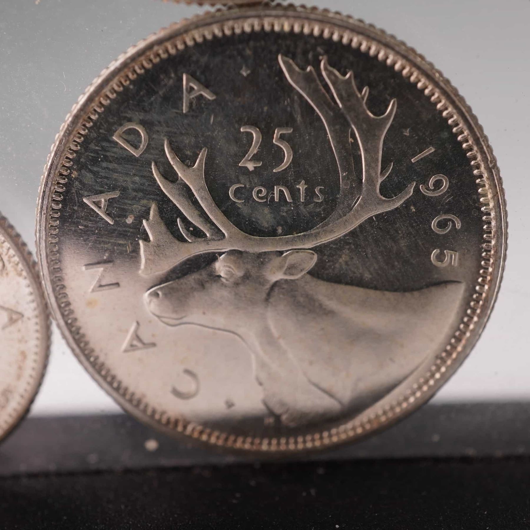 A group of four Canadian coins from 1965 including the 5 cents, 10 cents, 25 cents, and 50 cents denominations. Each obverse bears the portrait of Queen Elizabeth II with inscription ELIZABETH II D G REGINA. The reverses feature traditional Canadian designs: the beaver on the 5 cents, the Bluenose schooner on the 10 cents, the caribou on the 25 cents, and the Canadian coat of arms on the 50 cents. Struck in Canada, these examples reflect the classic mid-20th-century coinage style and national symbols. Composition includes silver content typical of pre-1968 Canadian coinage, with varying percentages depending on the denomination.