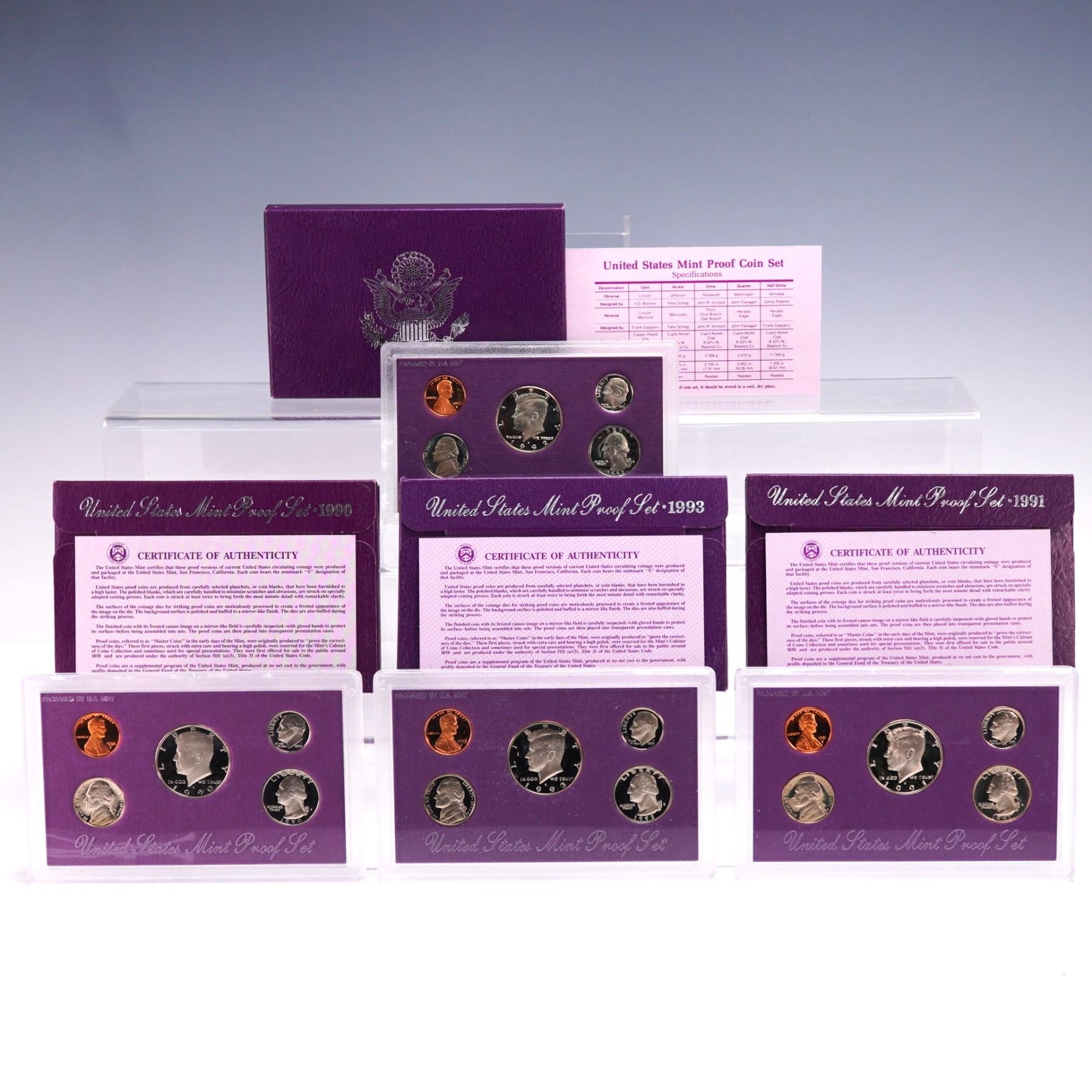 United States Mint Proof Coin Sets issued annually from 1990 through 1993. Each set contains five coins: a Kennedy Half Dollar, a Washington Quarter, a Roosevelt Dime, a Jefferson Nickel, and a Lincoln Cent. All coins were struck at the San Francisco Mint and are designated with the "S" mint mark. The coins are presented in their original U.S. Mint protective plastic cases with a purple background. Each case is inscribed with the words UNITED STATES MINT PROOF SET and includes the obverse view of the five proof coins, showcasing the high-contrast frosted designs against mirror-polished fields. The reverse sides of the coins are visible on the opposite side of the case, each featuring its respective reverse design. Accompanying each set is the original certificate of authenticity (COA) issued by the U.S. Mint, verifying the coins' specifications and mint origin. The sets are housed in their original purple outer sleeves embossed with the Great Seal of the United States. A U.S. Mint box: 5.5"L x 3.5"W x 0.25"H.
