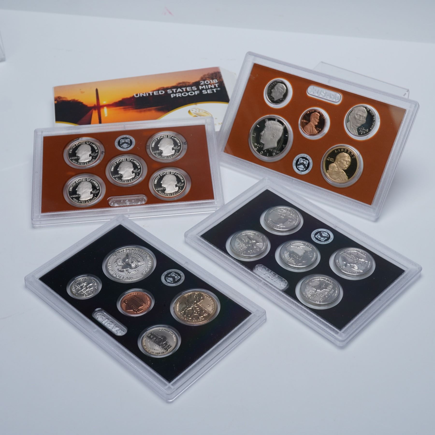 All coins struck at the San Francisco Mint. The standard proof set contains 10 coins housed in two plastic cases and includes the original box. The reverse proof set also contains 10 coins in two plastic cases, but is offered without the original box. Both sets include the Lincoln cent, Jefferson nickel, Roosevelt dime, Kennedy half dollar, Sacagawea dollar, and the five America the Beautiful Washington quarters issued for 2018.