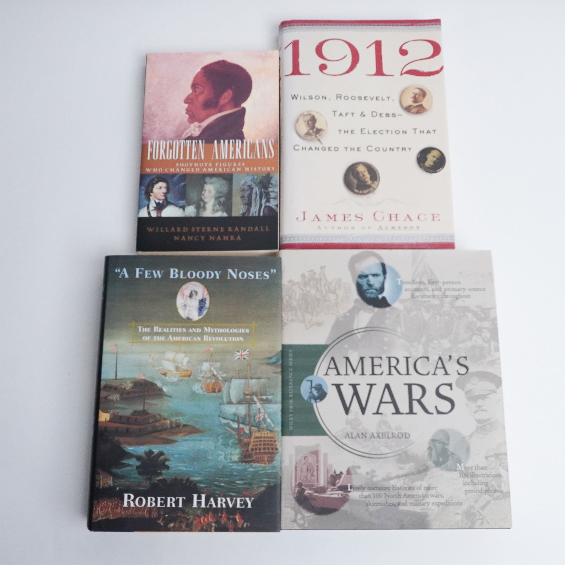 This set of four hardcover books explores key events and figures in American history, politics, and military conflicts. Americas Wars by Alan Axelrod provides a comprehensive overview of over 100 North American wars, featuring historical context and detailed illustrations. A Few Bloody Noses: The Realities and Mythologies of the American Revolution by Robert Harvey examines the American Revolution from both British and American perspectives, challenging common narratives. 1912: Wilson, Roosevelt, Taft & Debs – The Election That Changed the Country by James Chace delves into the pivotal 1912 presidential election and its lasting impact on American politics. Forgotten Americans: Footnote Figures Who Changed American History by Willard Sterne Randall and Nancy Nahra highlights lesser-known but influential individuals who helped shape the nations history. Each book is in good condition with intact dust jackets, making this collection ideal for history enthusiasts, collectors, or scholars. Largest book measures 9.5"H.