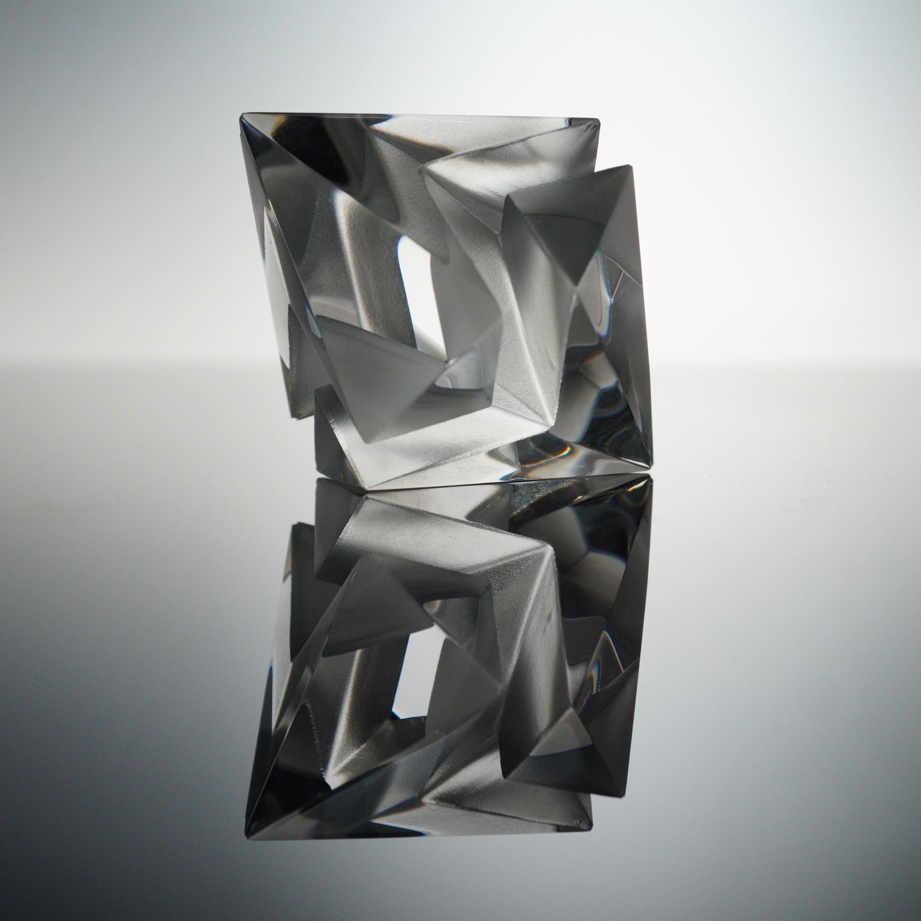 A striking collection of four contemporary art glass paperweights, including one tall faceted obelisk form marked with the swan hallmark, alongside a multifaceted prism cube with vivid iridescent tones, a geometric clear crystal form, and a brilliant teardrop faceted piece reflecting rainbow hues. Together they present a captivating interplay of light, color, and form, ideal for display or modern decor. One paperweight is marked Swarovski.