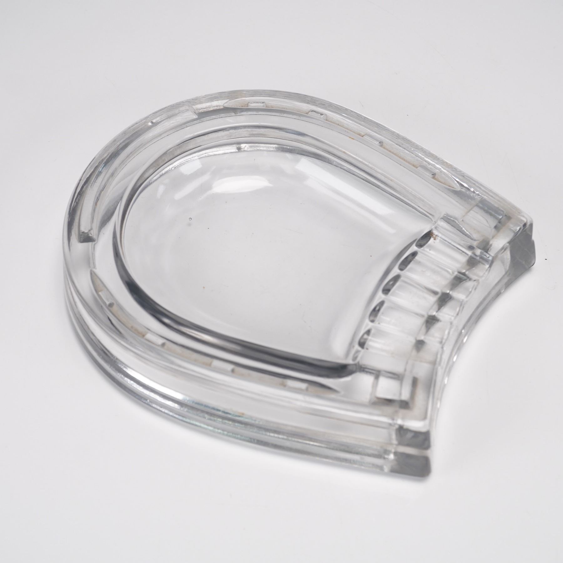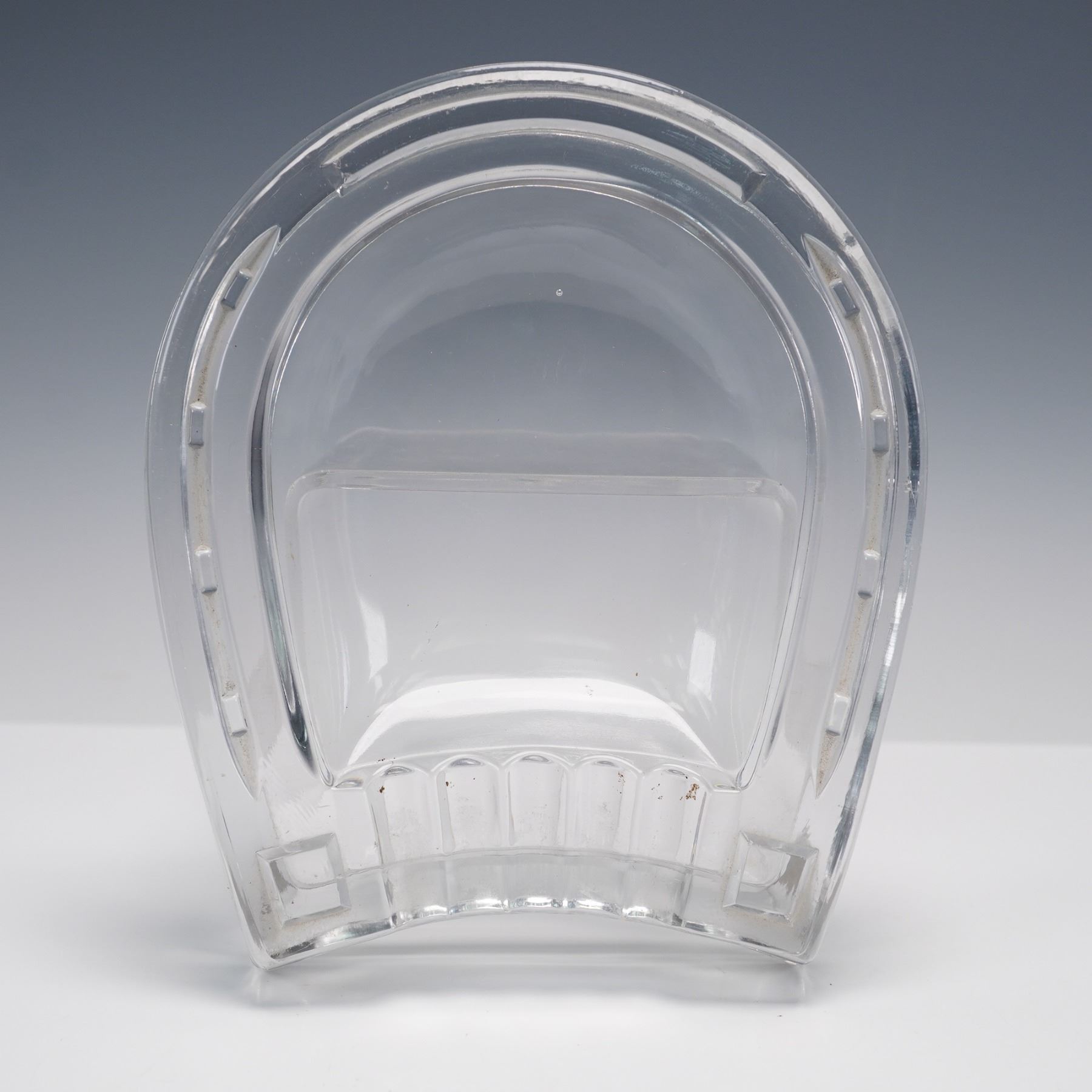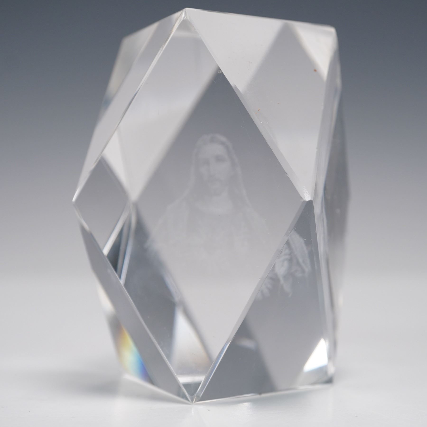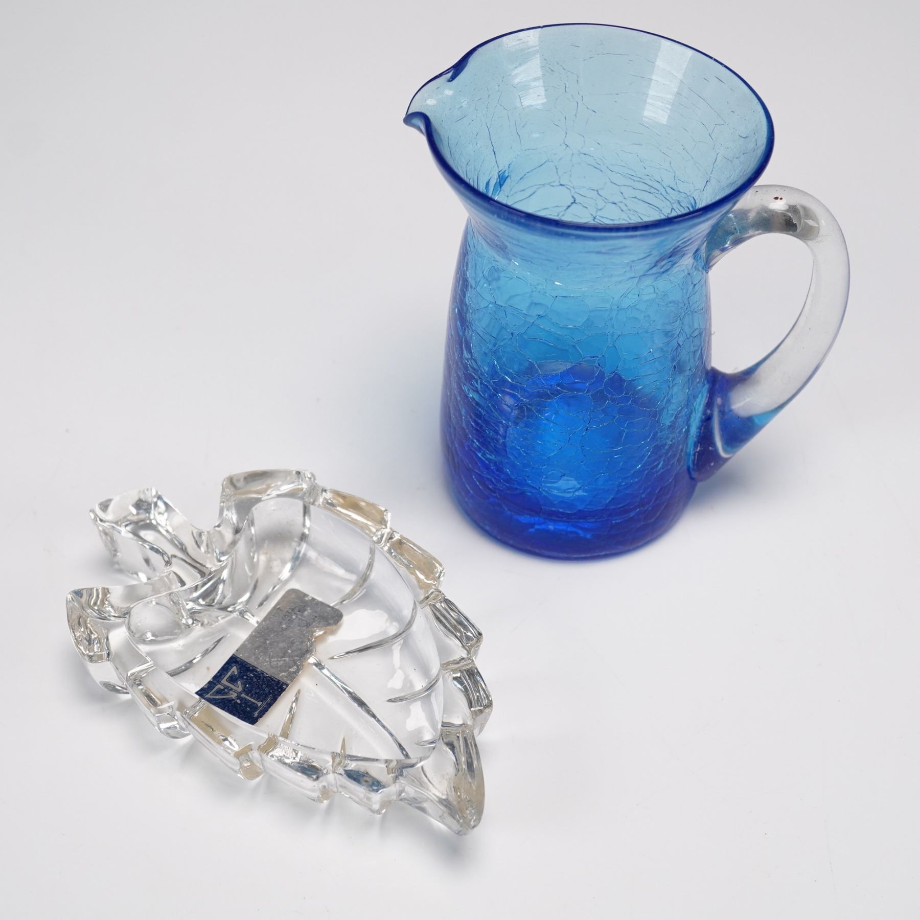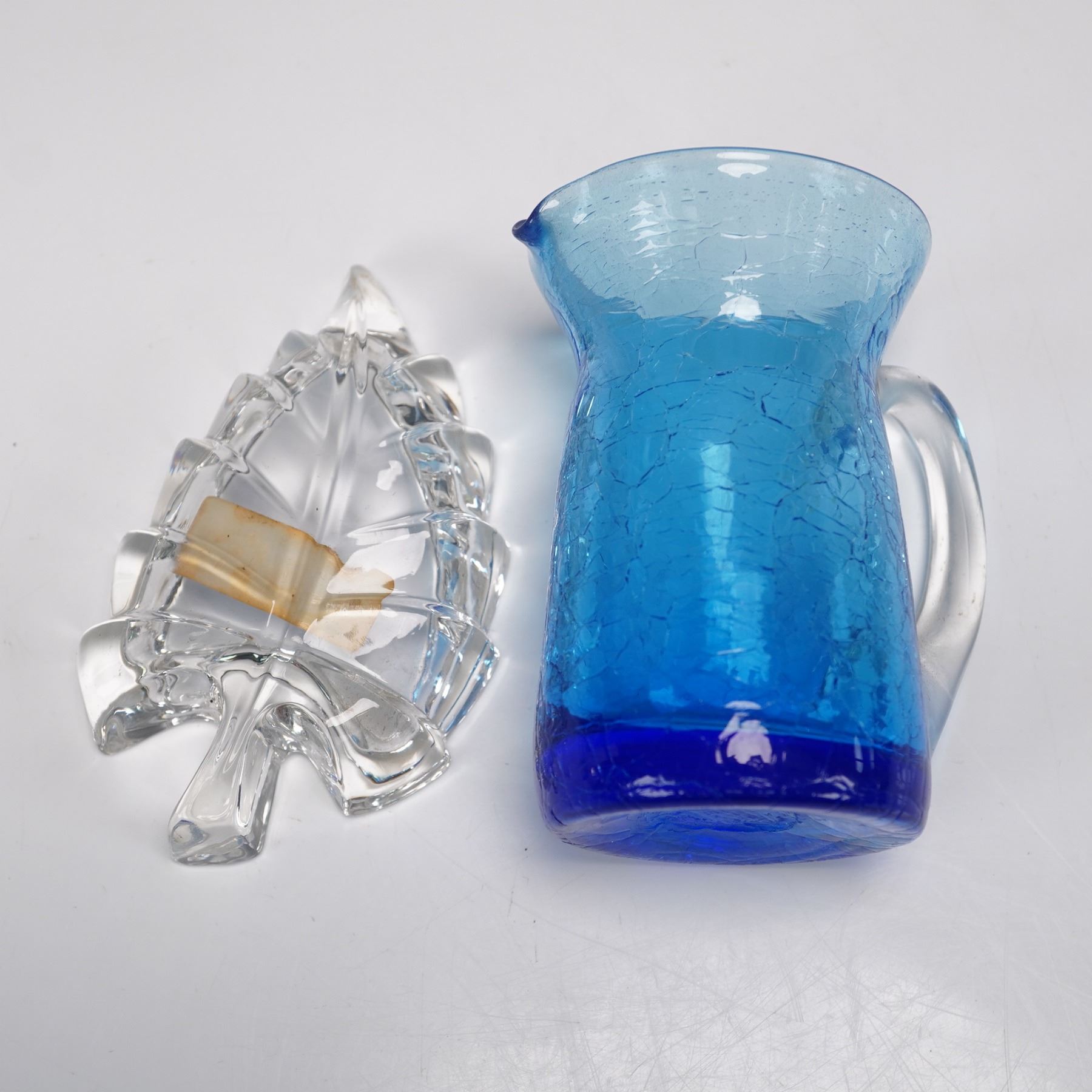 Lot includes a multi-faceted cut crystal prism featuring an internal 3D laser image of Jesus Christ, a clear glass horseshoe-shaped ashtray, a blue crackle glass miniature pitcher with clear handle, and a leaf-shaped dish bearing a label that reads "Crystal Clear Industries, Hand Cut Lead Crystal, Made in Yugoslavia." Each piece showcases distinct craftsmanship and materials.