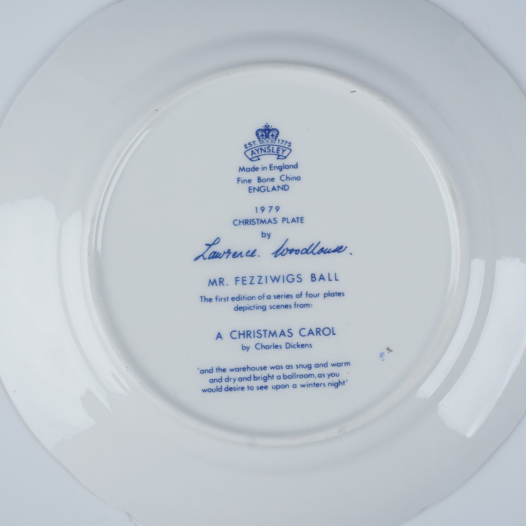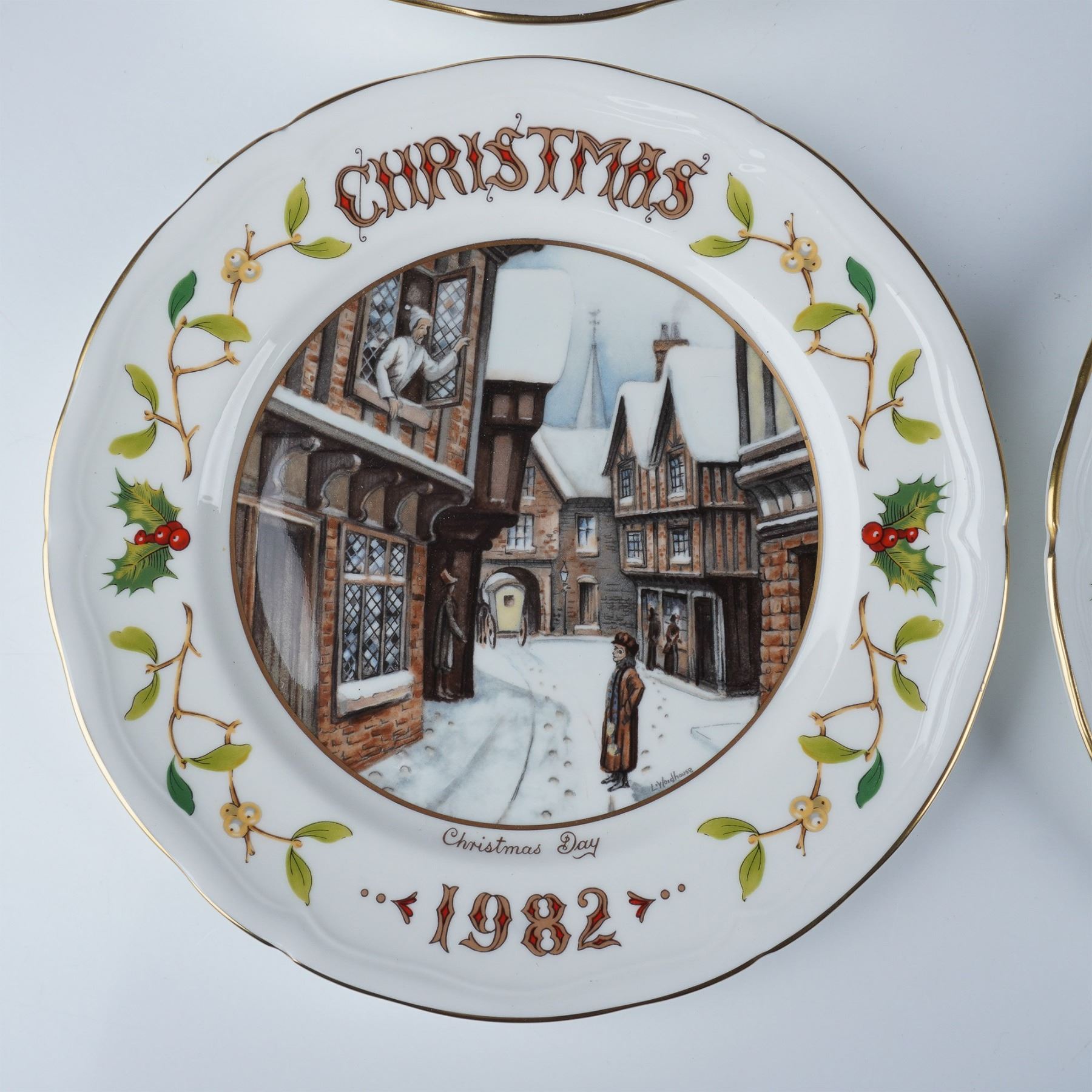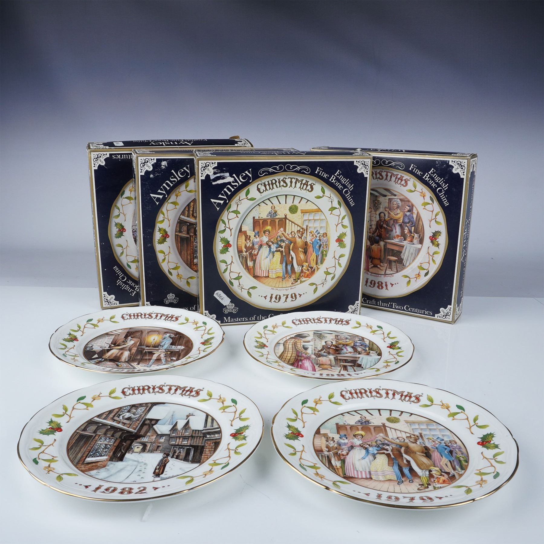 Aynsley English fine bone china Christmas plate collection featuring four plates from the years 1979, 1980, 1981, and 1982. Each plate is part of the Masters of the Craft thro Two Centuries series, celebrating traditional English scenes with intricate designs and vibrant colors. This collectible set comes with its original boxes, showcasing the craftsmanship and holiday spirit that Aynsley is renowned for. Boxes are intact with minor signs of shelf wear.