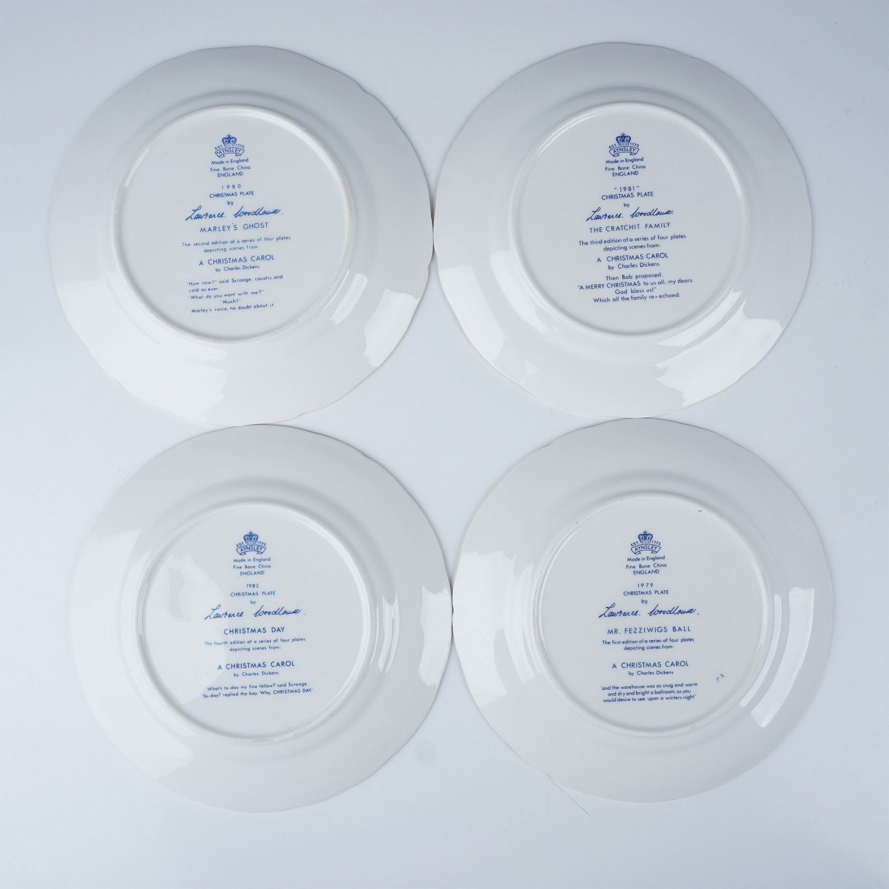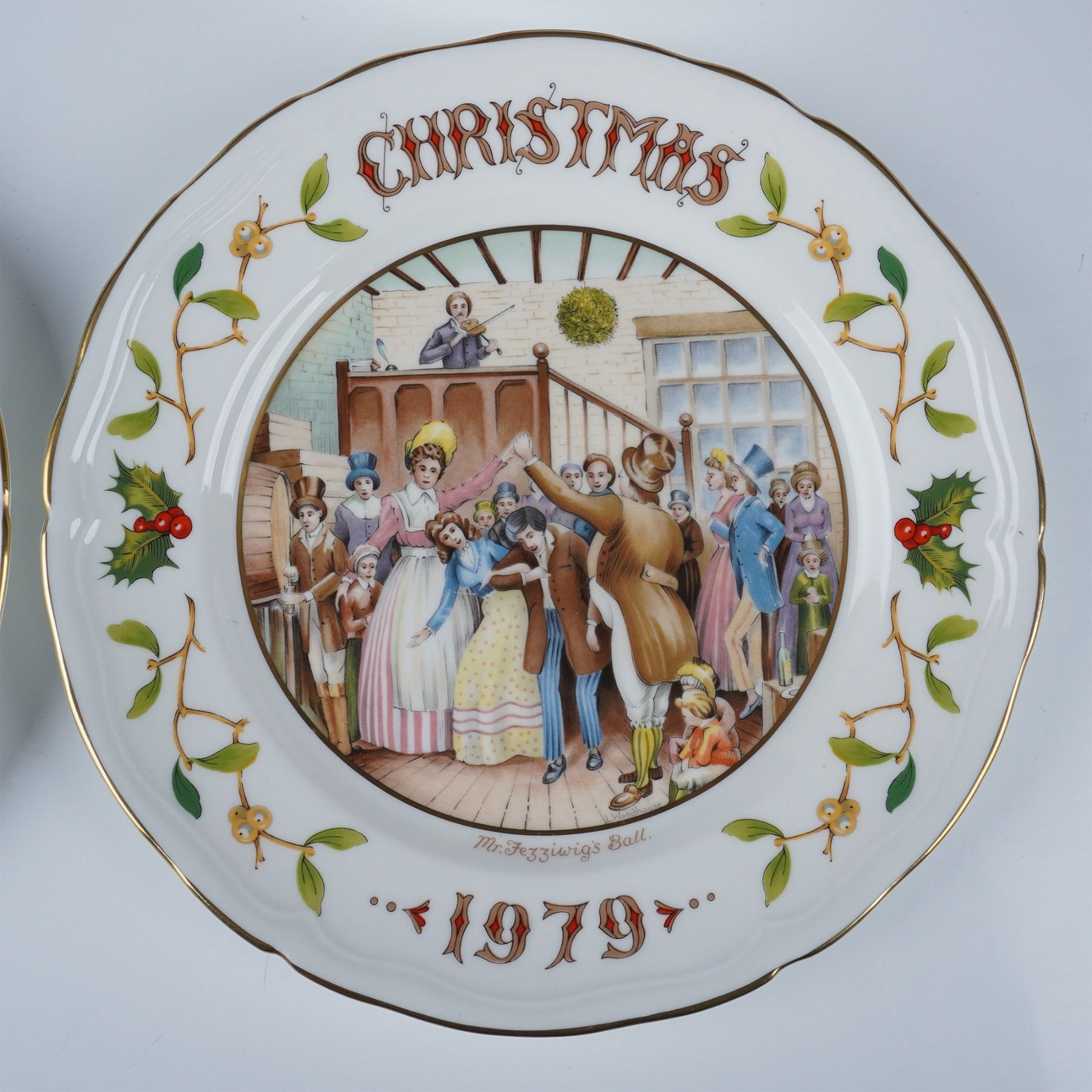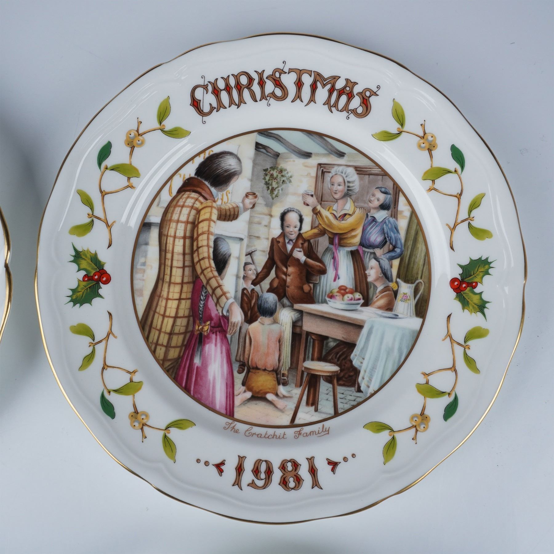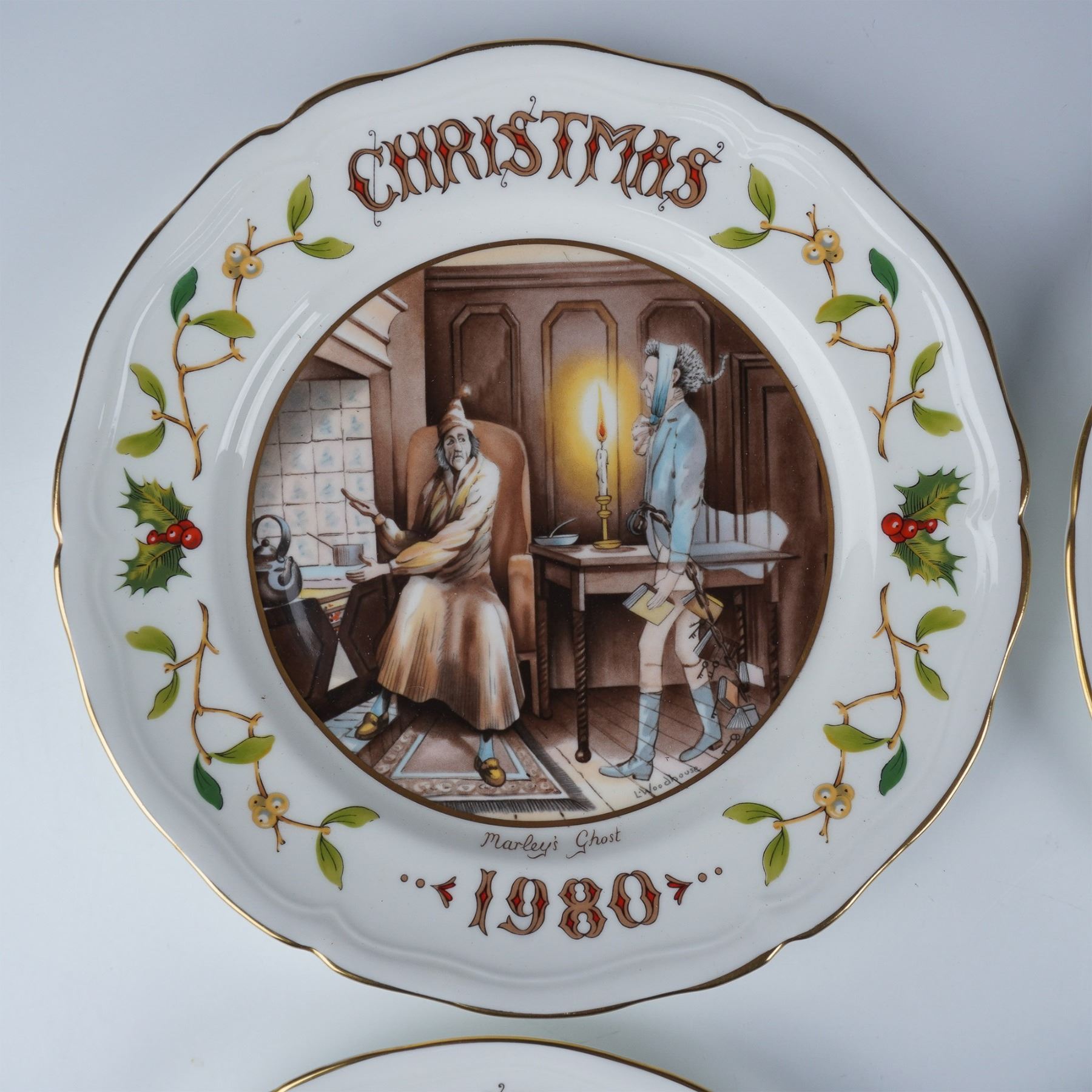 Aynsley English fine bone china Christmas plate collection featuring four plates from the years 1979, 1980, 1981, and 1982. Each plate is part of the Masters of the Craft thro Two Centuries series, celebrating traditional English scenes with intricate designs and vibrant colors. This collectible set comes with its original boxes, showcasing the craftsmanship and holiday spirit that Aynsley is renowned for. Boxes are intact with minor signs of shelf wear.