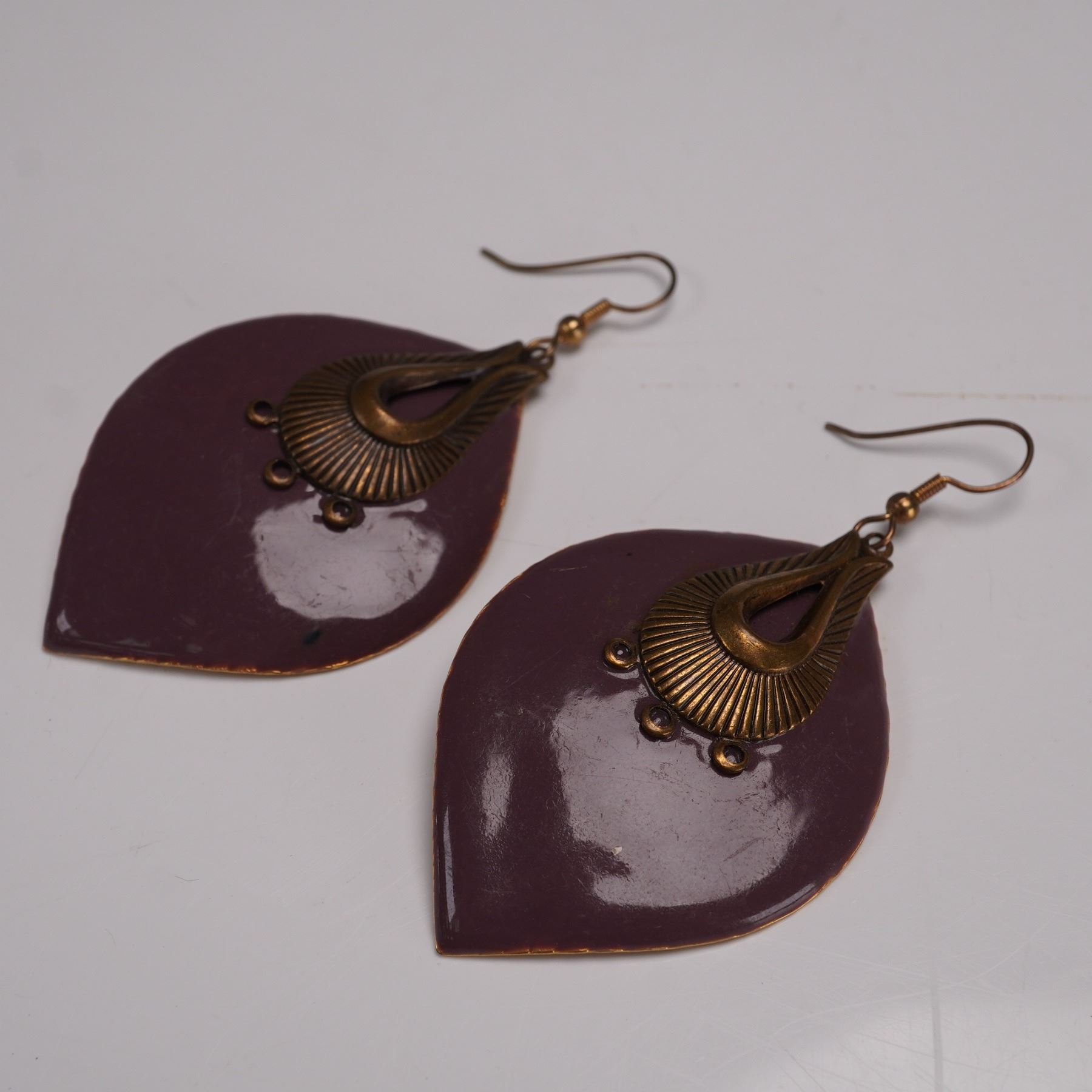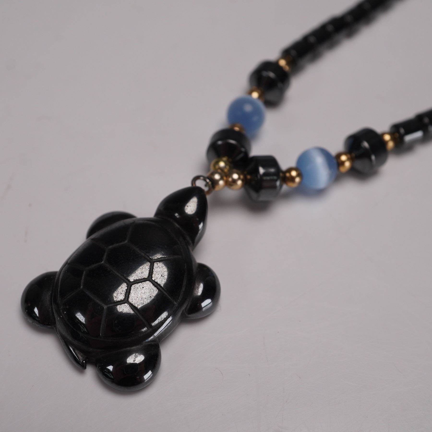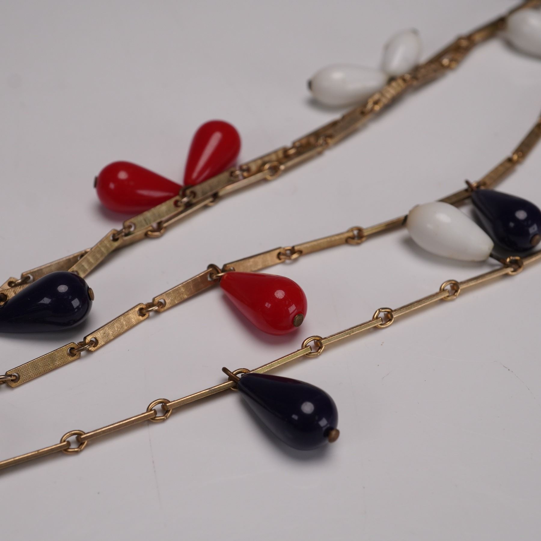 Group of four assorted costume jewelry pieces, including a black beaded necklace featuring a carved hematite-style turtle pendant with blue and gold-tone accent beads and a twist-barrel clasp; a triple-strand necklace composed of vintage red, white, and blue teardrop beads on brass-tone chains; and a pair of stylized earrings with large plum-colored enameled drops accented by ornate bronze-tone filigree. A unique mix of whimsical, bold, and vintage-inspired styles.