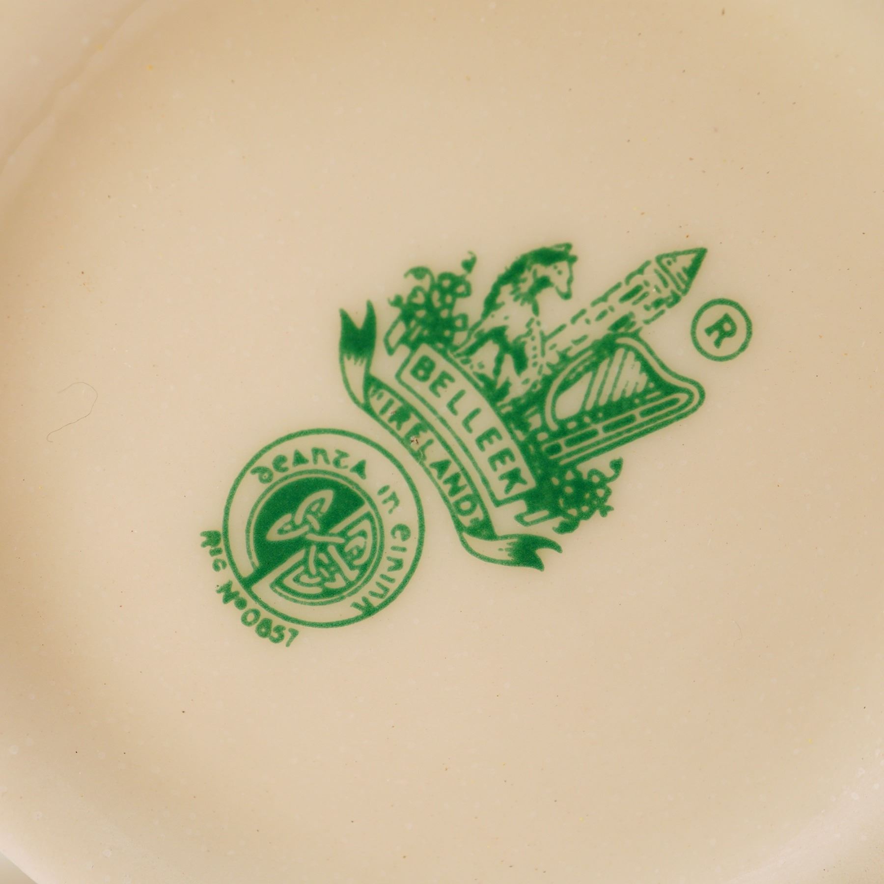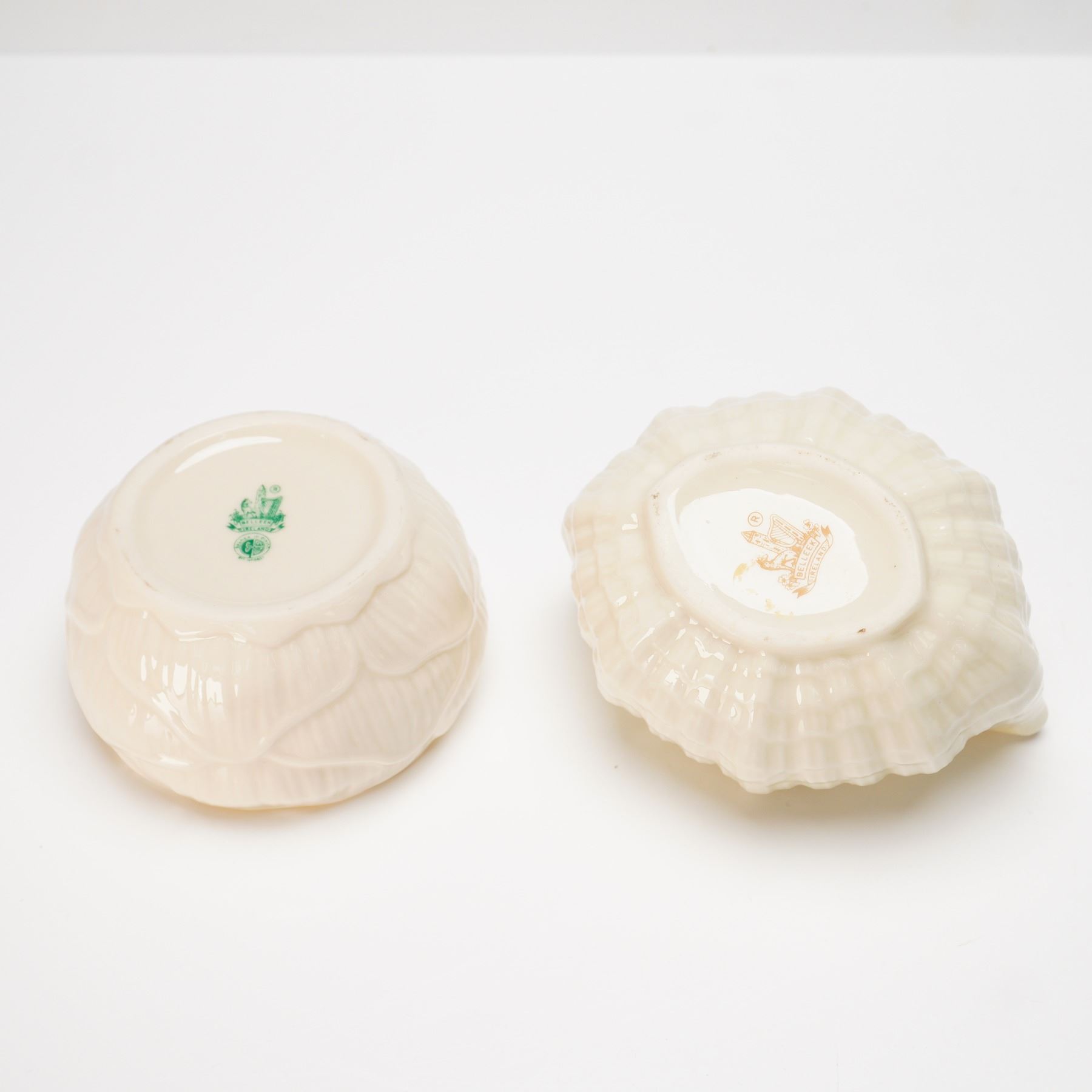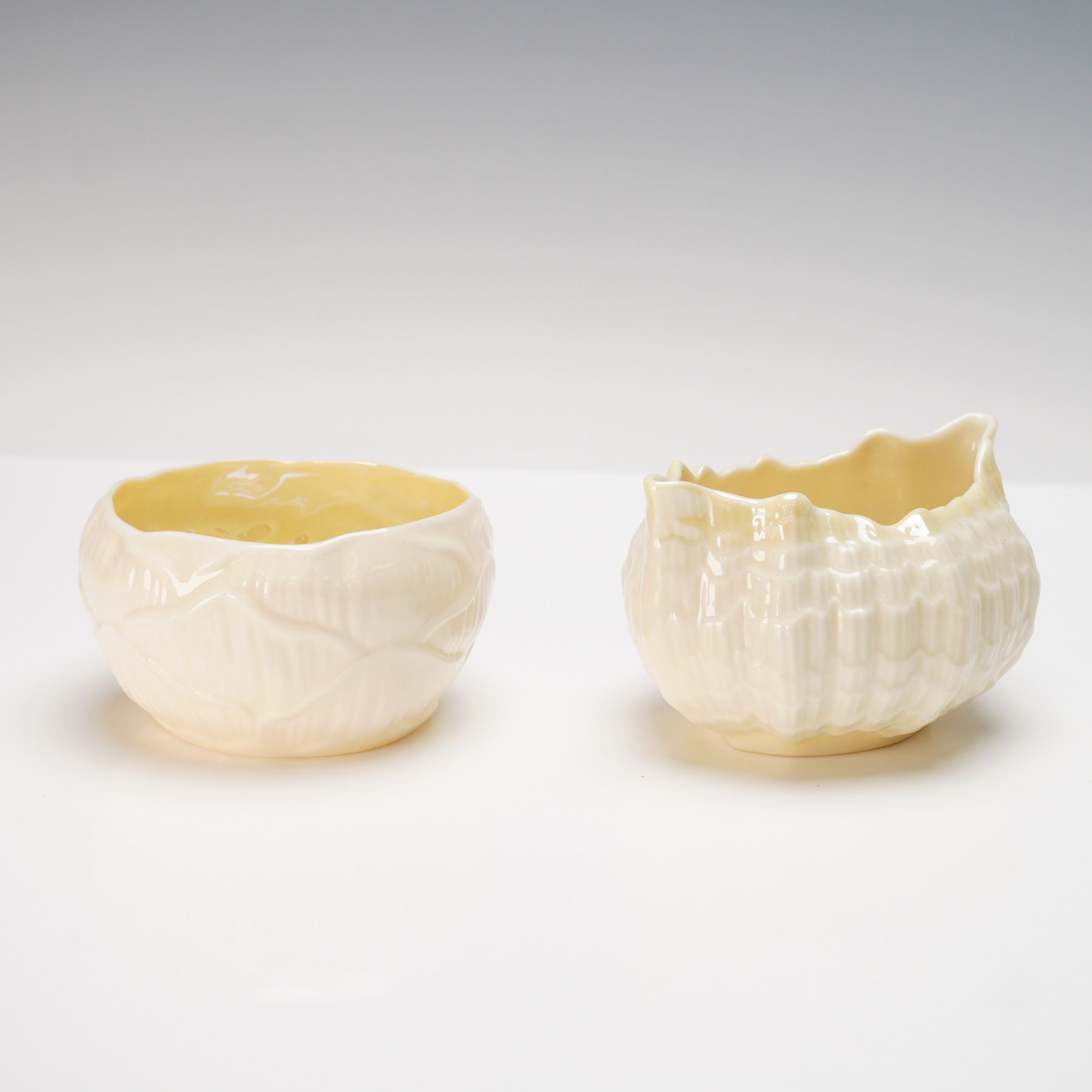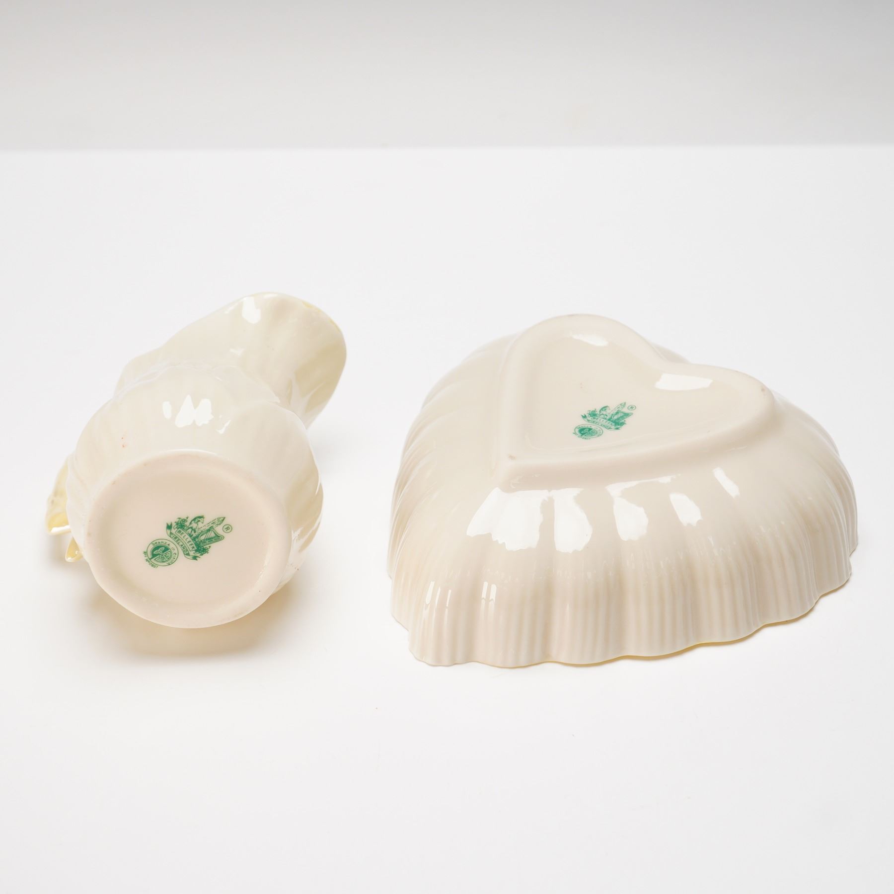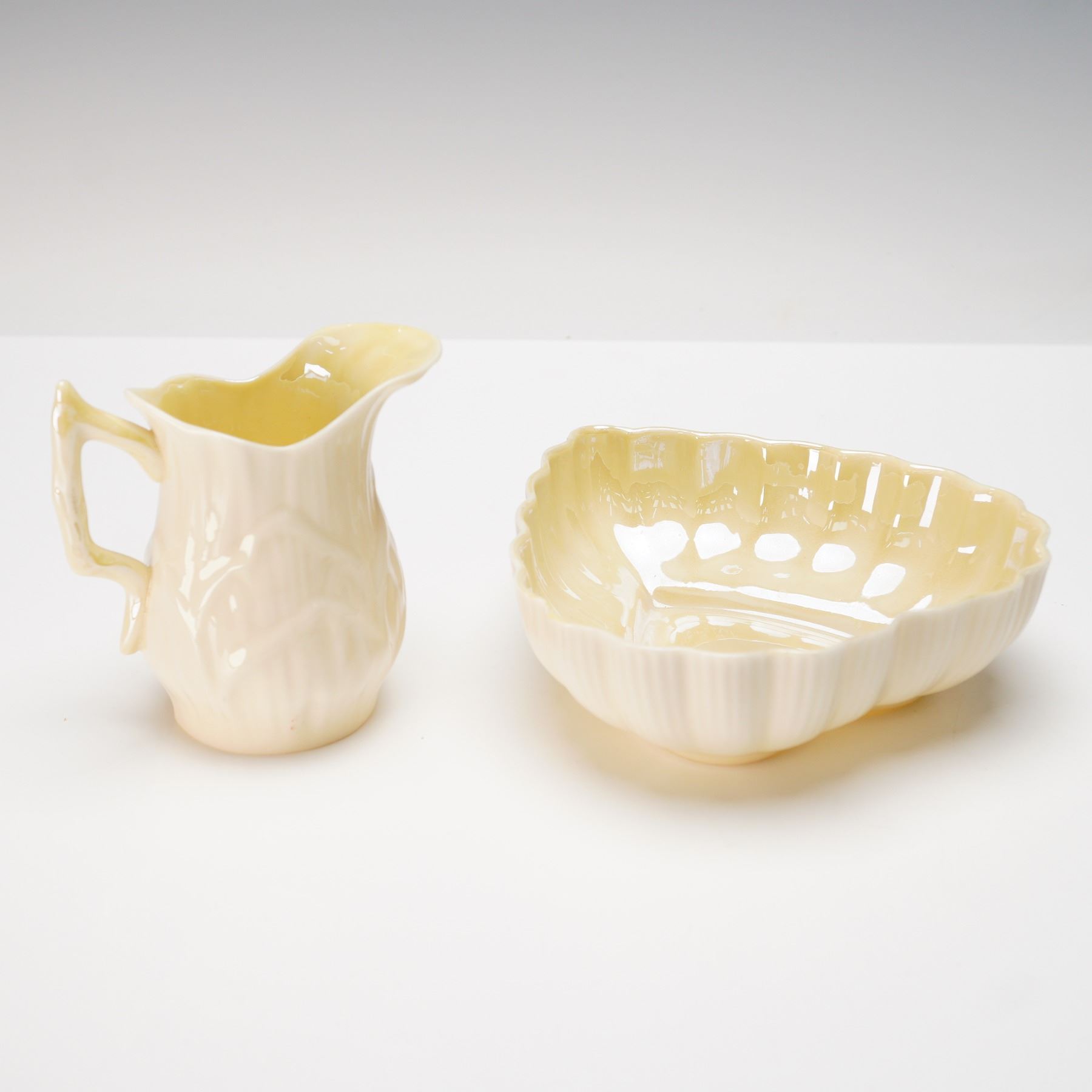 A grouping of Belleek Irish porcelain in cream with yellow interiors, comprising a small bowl, a woven texture bowl, a cream jug, and a heart shaped dish. Each piece features Belleek's fine translucency and delicate molded detail. Each piece bears the Belleek backstamp. A versatile lot that showcases the craftsmanship and variety of Belleek porcelain forms.