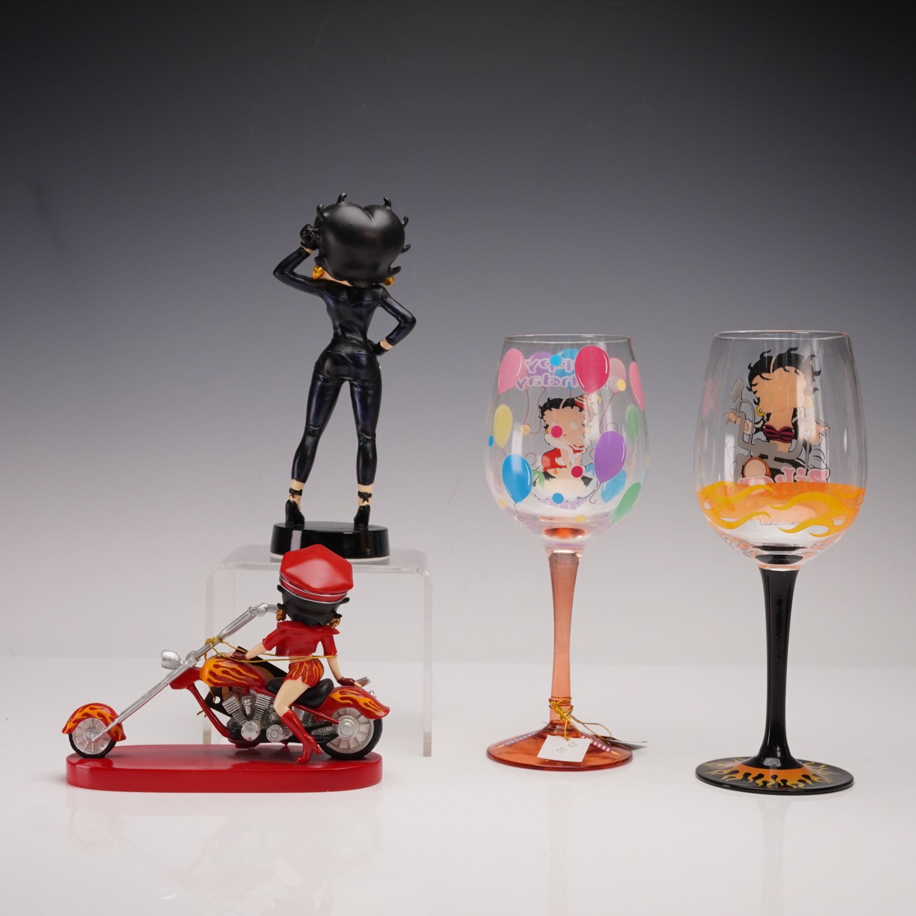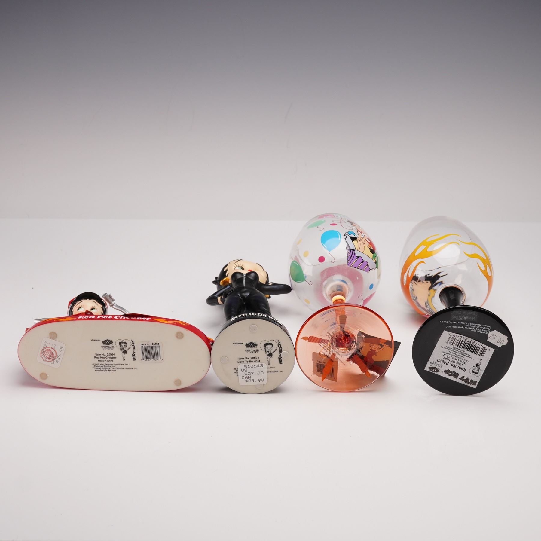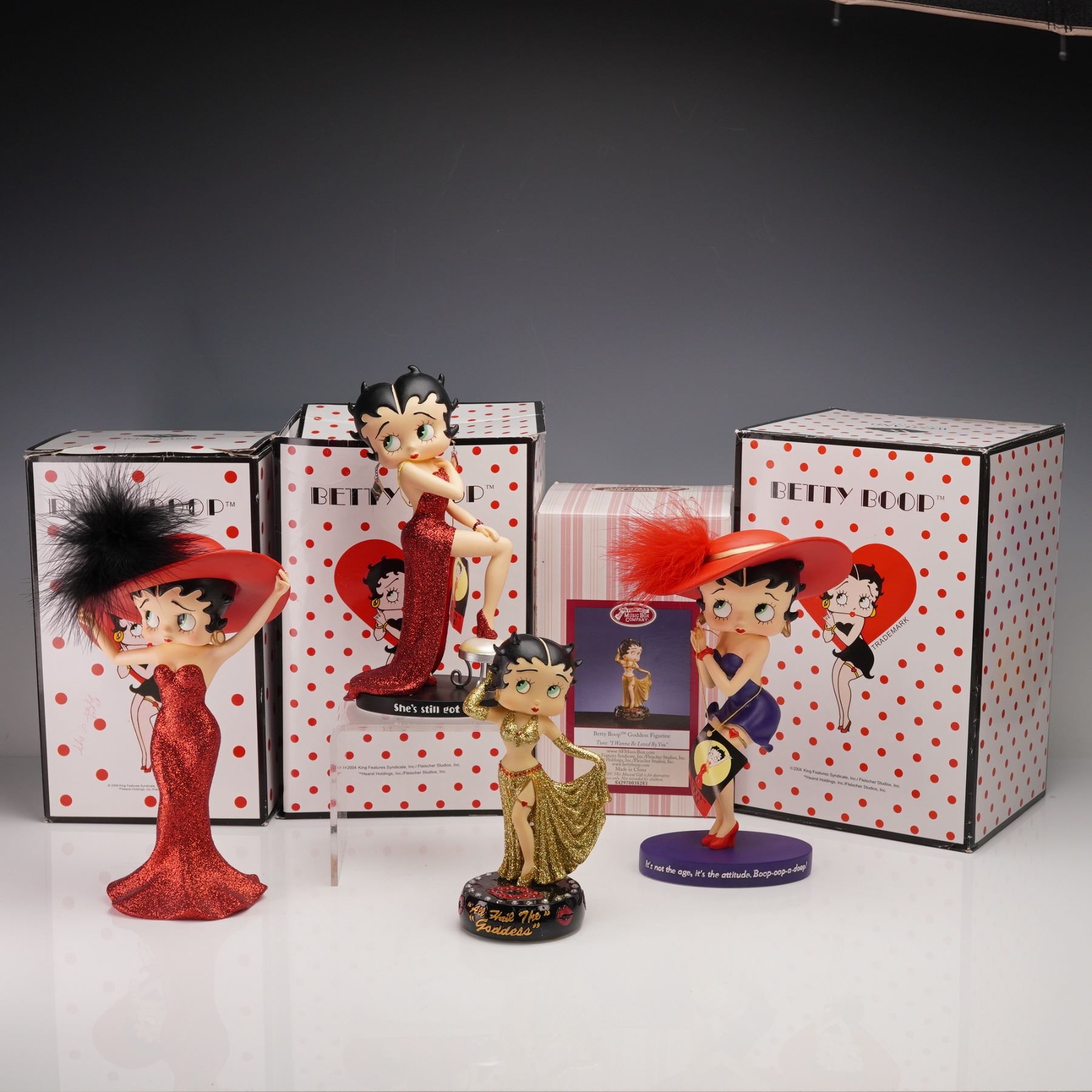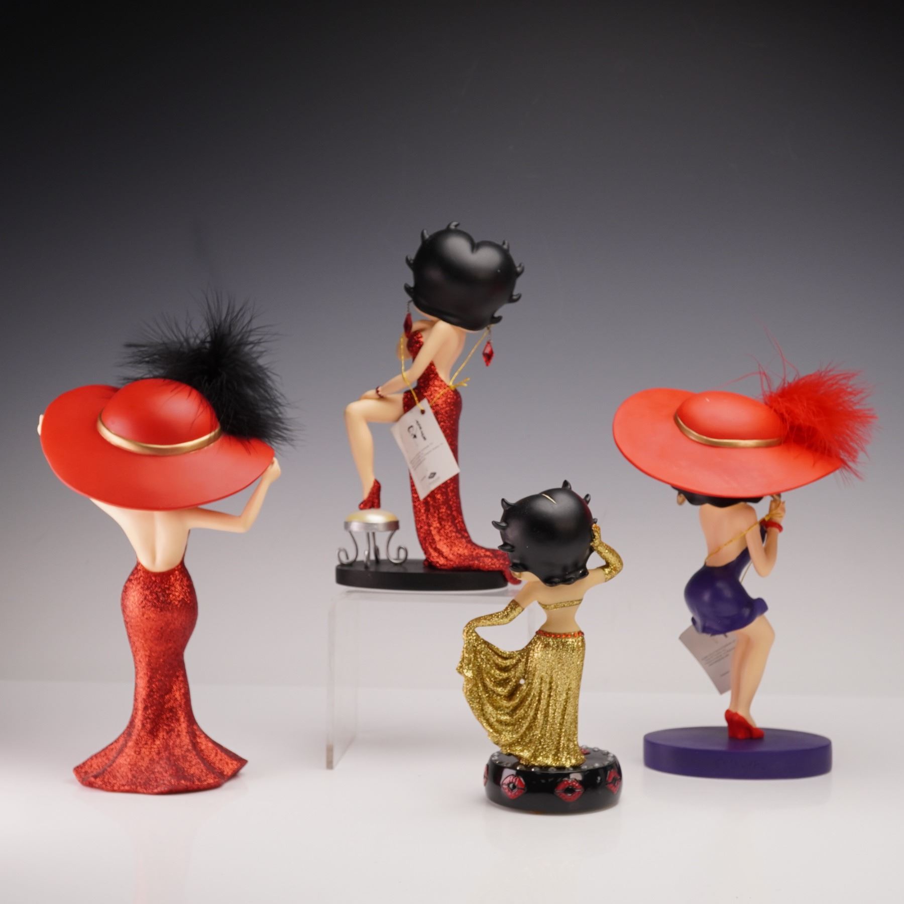 Collection of four licensed Betty Boop display pieces including two feathered hat glamour figurines in red and purple ensembles, a red glitter gown figure on a pedestal base marked She's still got it, It's Not the Age and a gold evening dress figure on a wind-up music box base. Vivid hand-painted finishes with glitter accents capture the classic pin-up style; several retain original boxes as shown.