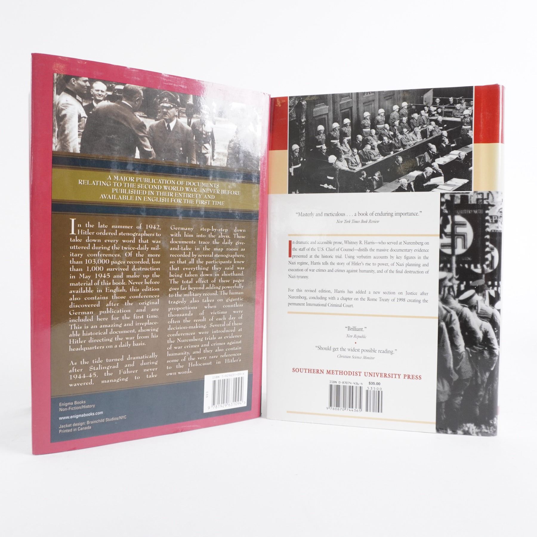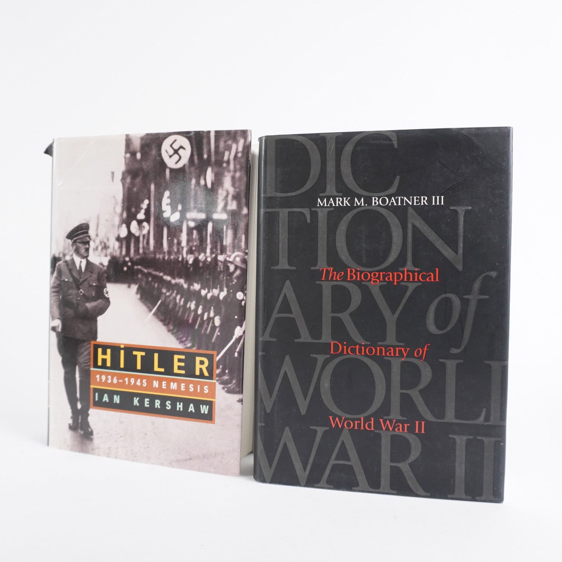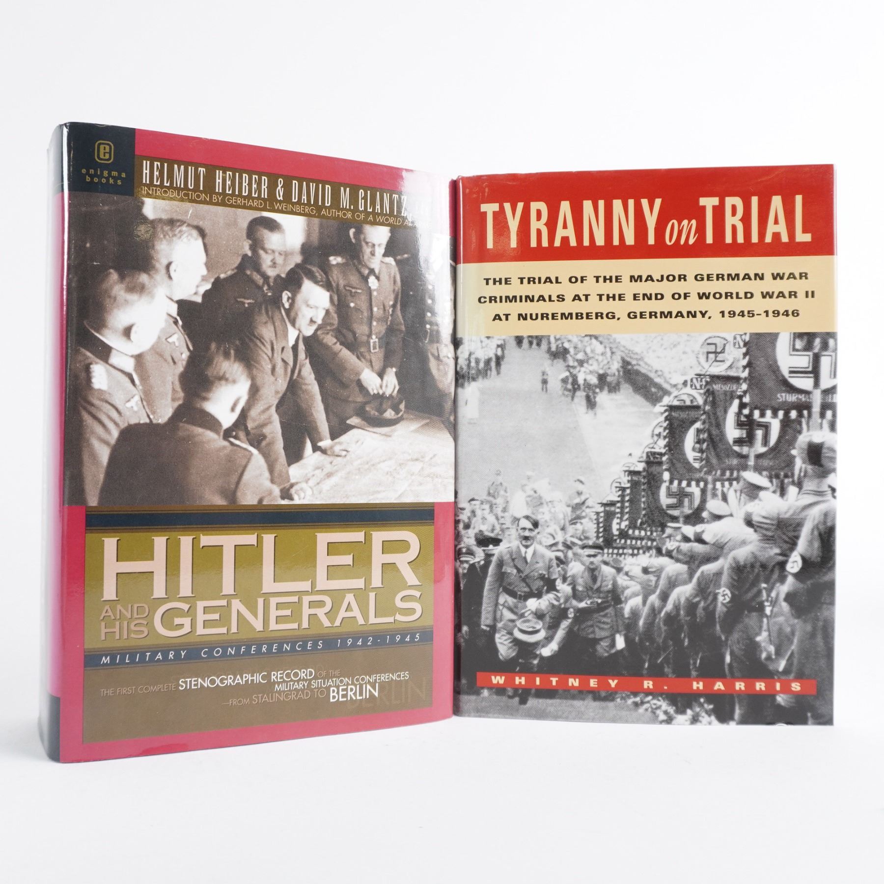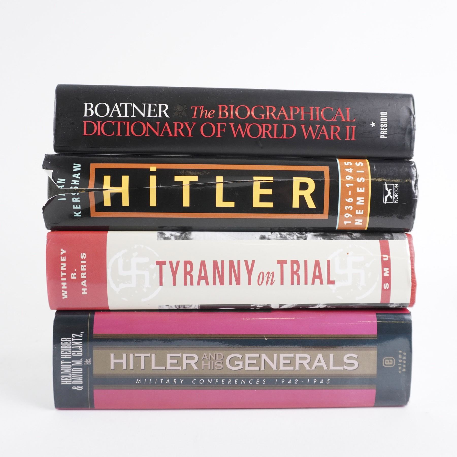This collection of four hardcover books provides an in-depth examination of World War II leadership, Nazi military strategy, and post-war justice. Hitler and His Generals: Military Conferences 1942-1945 offers a detailed record of high-level discussions shaping Germany’s war effort. Hitler: 1936-1945 Nemesis by Ian Kershaw provides a critical biography of the dictator’s final years. Tyranny on Trial by Whitney R. Harris chronicles the Nuremberg Trials and the pursuit of justice against Nazi leaders. The Biographical Dictionary of World War II by Mark M. Boatner presents key figures who shaped the conflict. A must-have set for military historians, scholars, and collectors. Largest book measures 9.25"H.