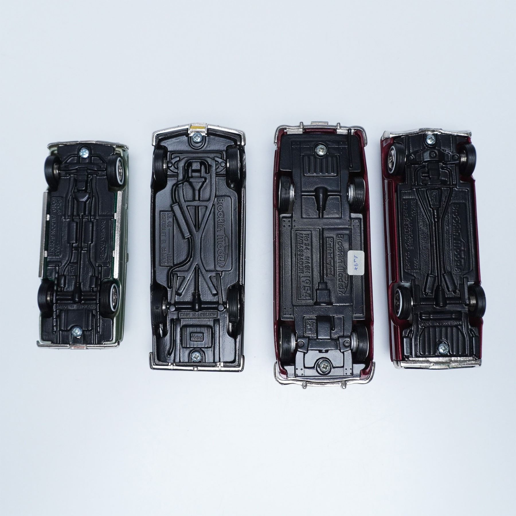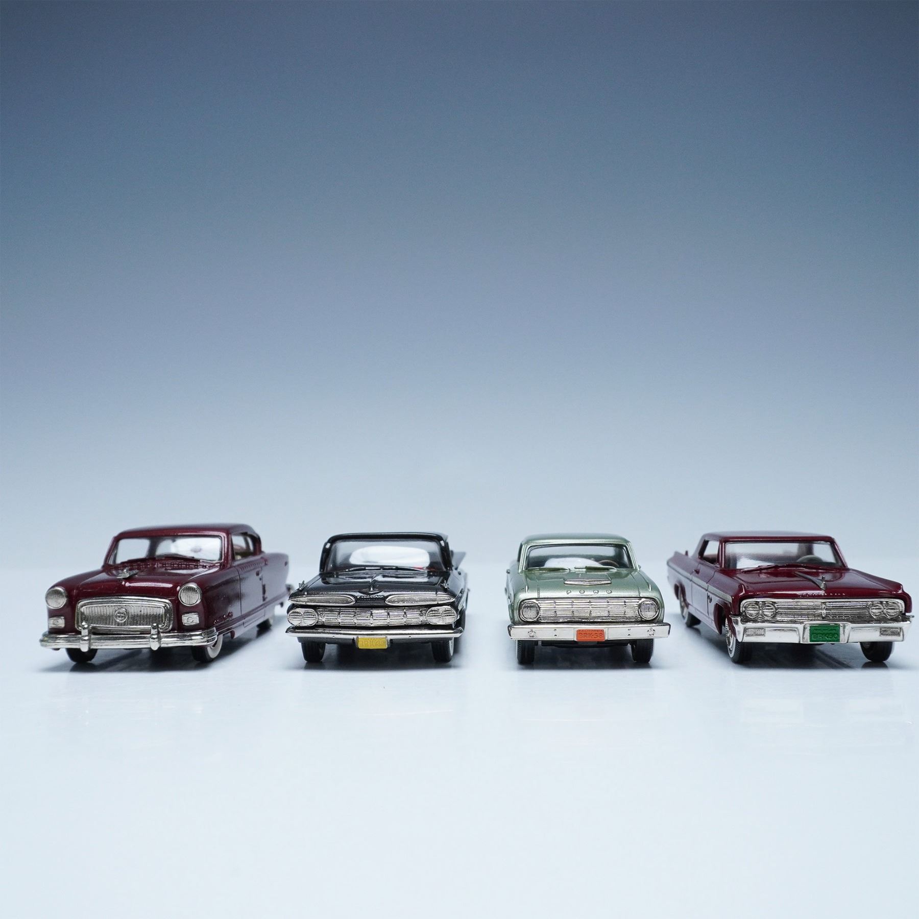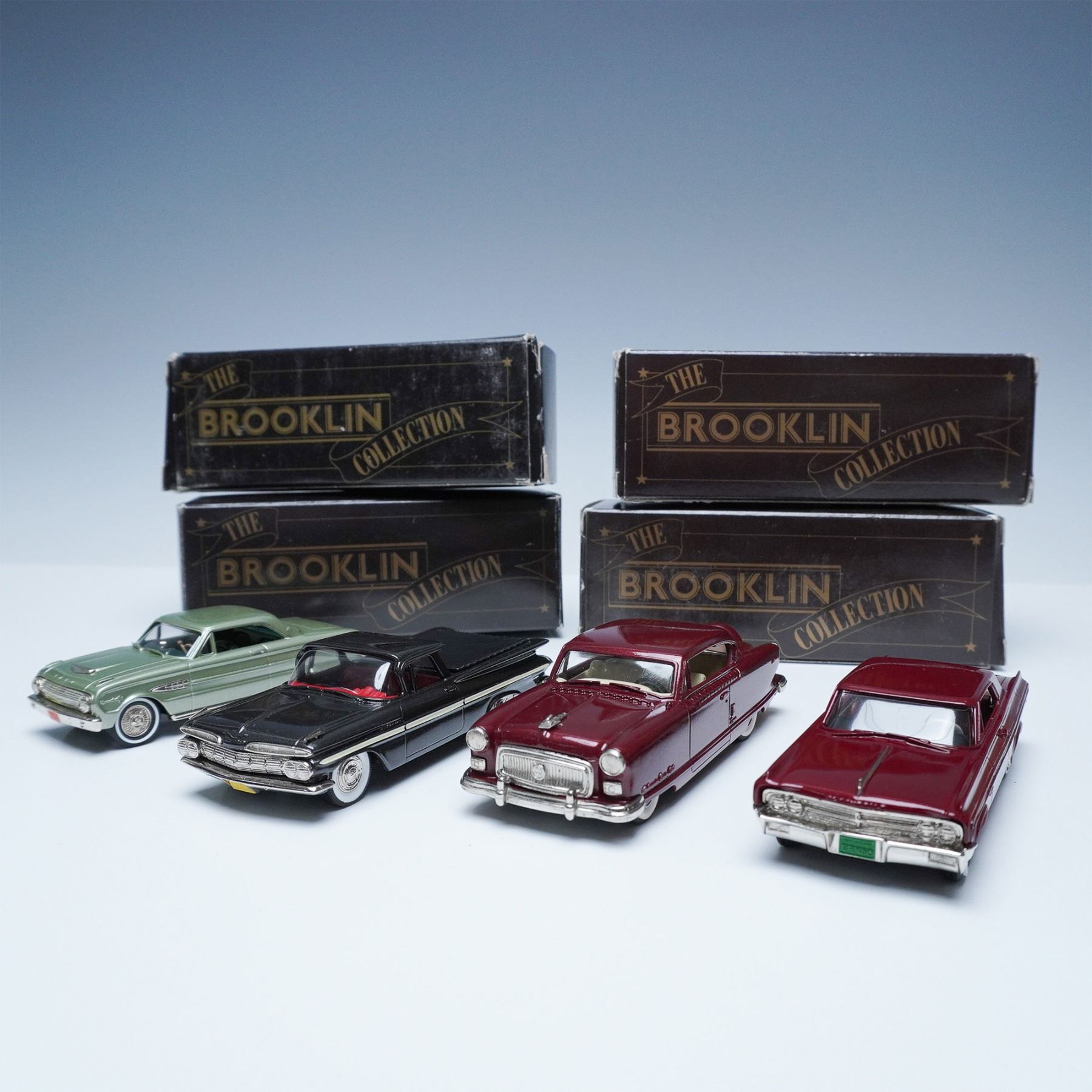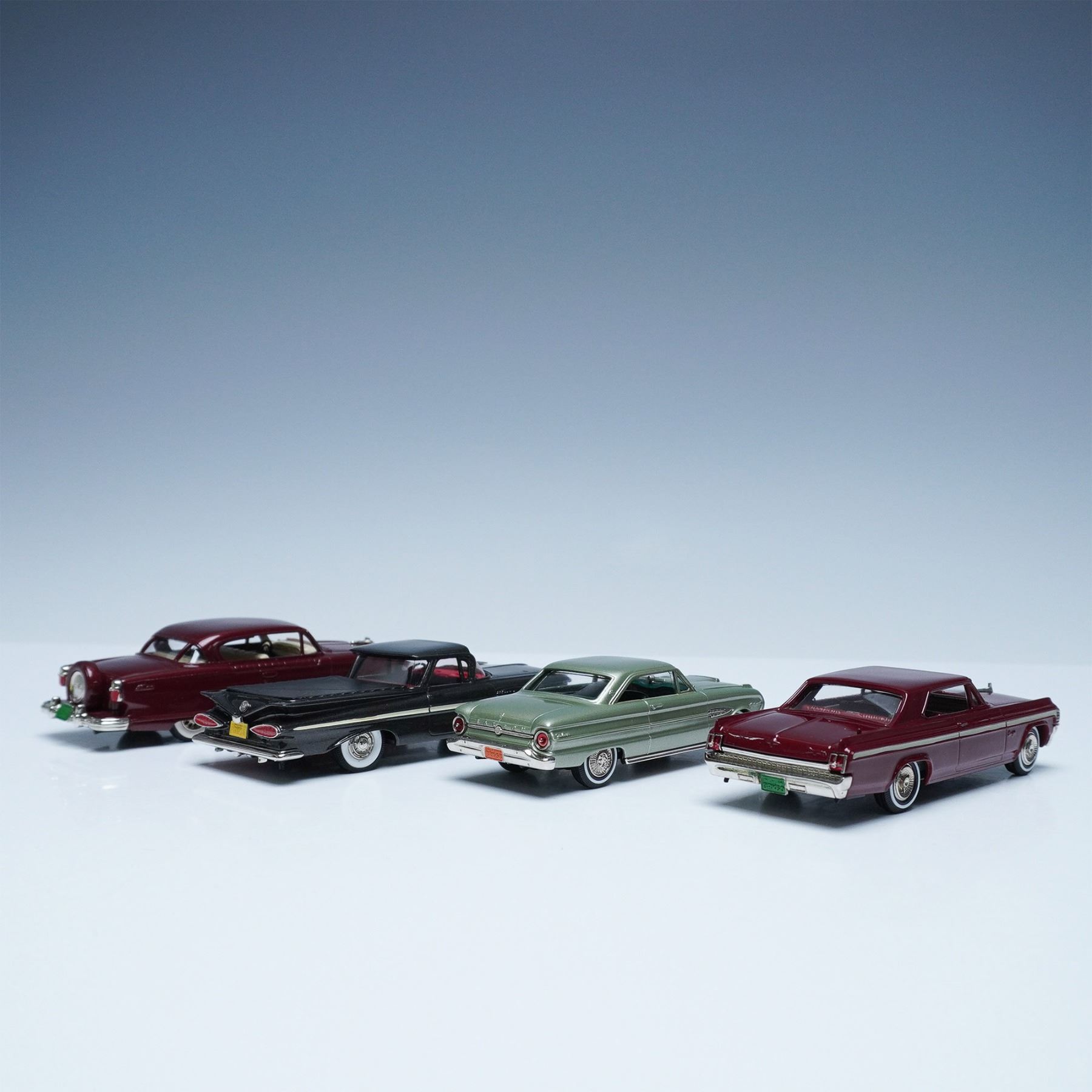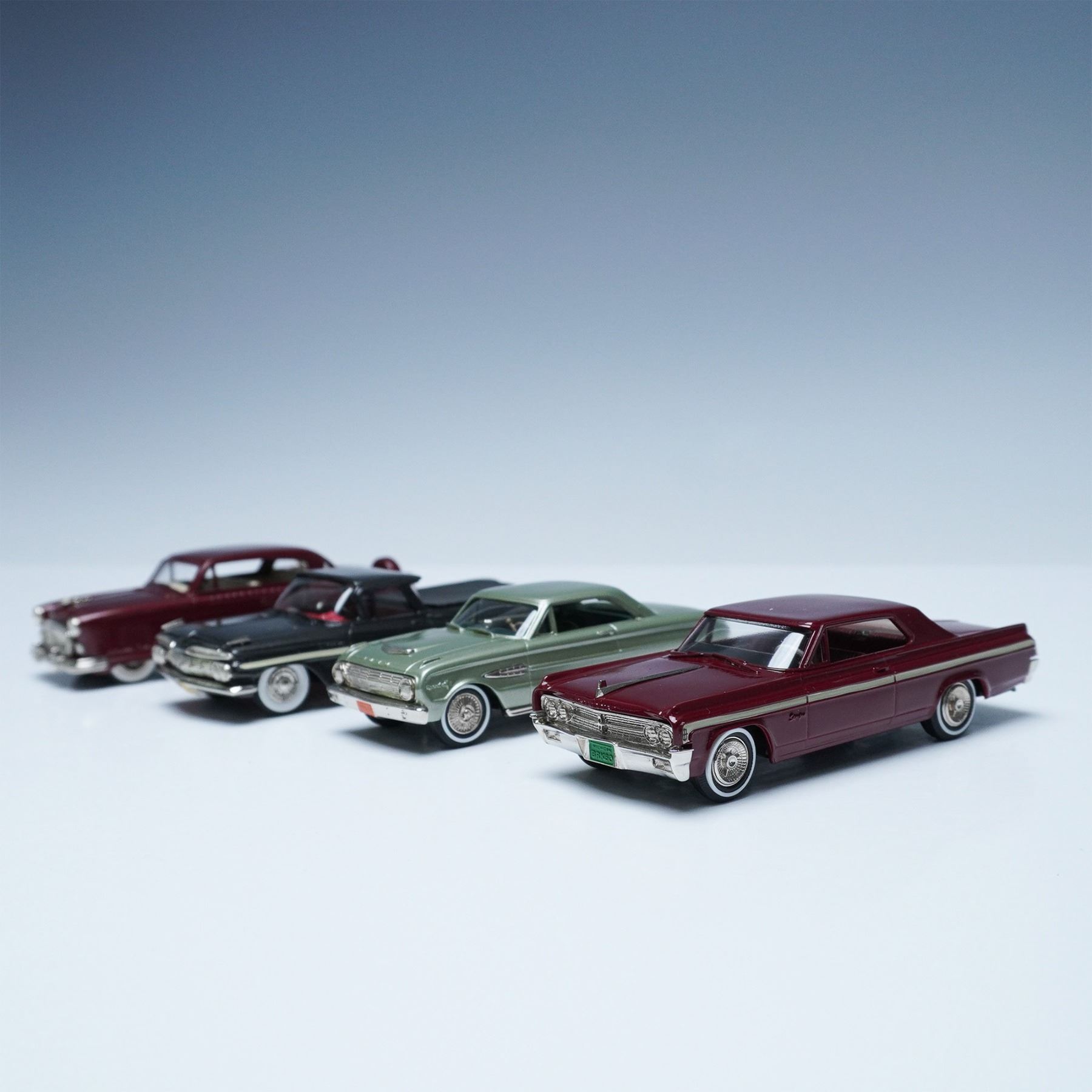 This auction lot features a set of four high-quality 1:43 scale diecast model cars from Brooklin Models, known for their handcrafted metal replicas of classic American automobiles. This collection includes, a 1963 Oldsmobile Starfire Hardtop Coupe, a 1959 Chevrolet El Camino, a 1963 Ford Falcon, and a 1954 Nash Ambassador Custom. Each model is presented with its original Brooklin Collection packaging. These diecast cars are highly sought after by collectors for their craftsmanship and attention to detail, making this lot an excellent addition for enthusiasts of vintage American automobiles. This item has its original box. Largest measures 5.25"L.