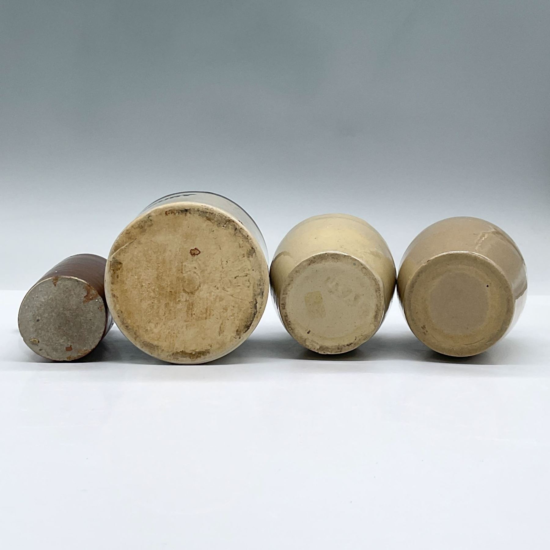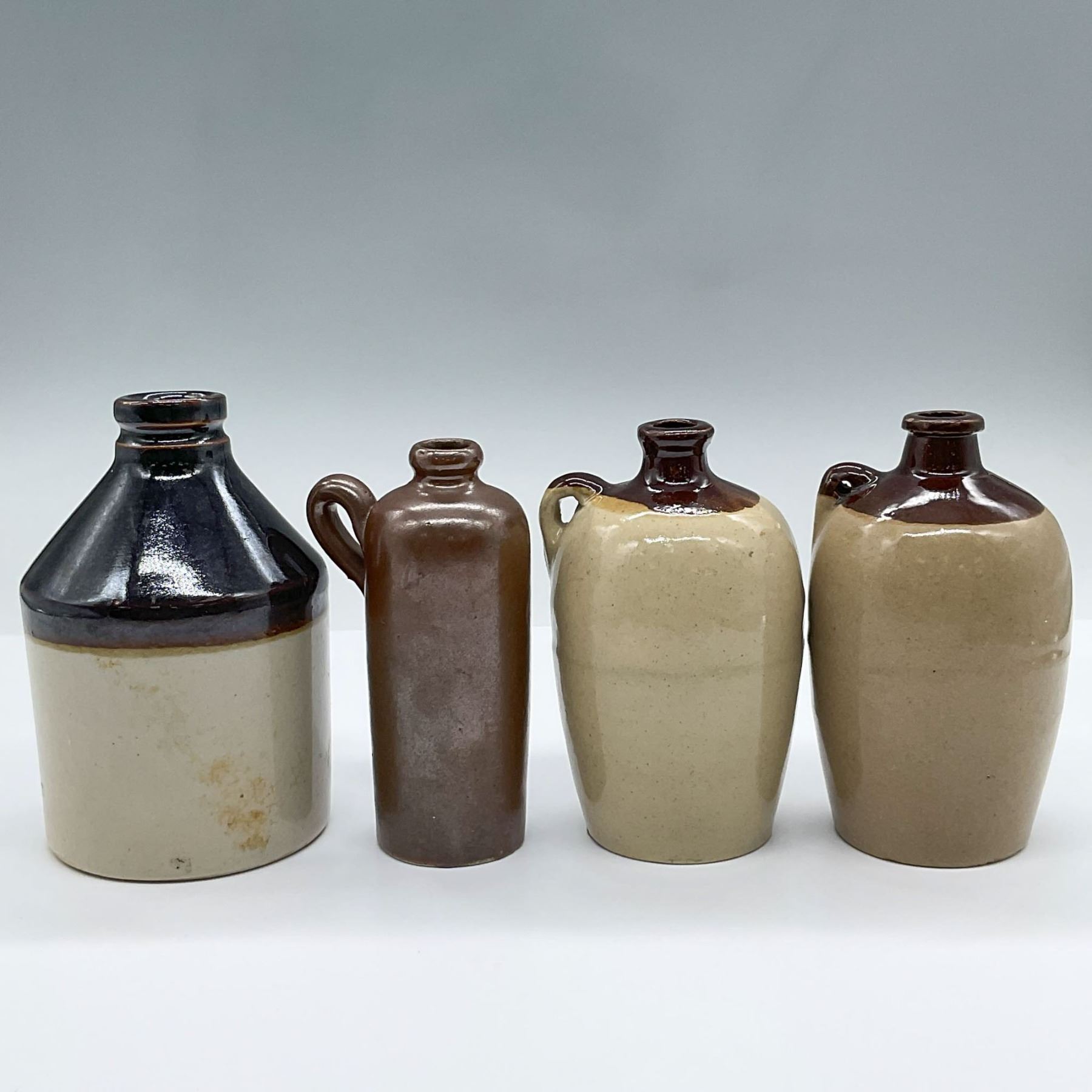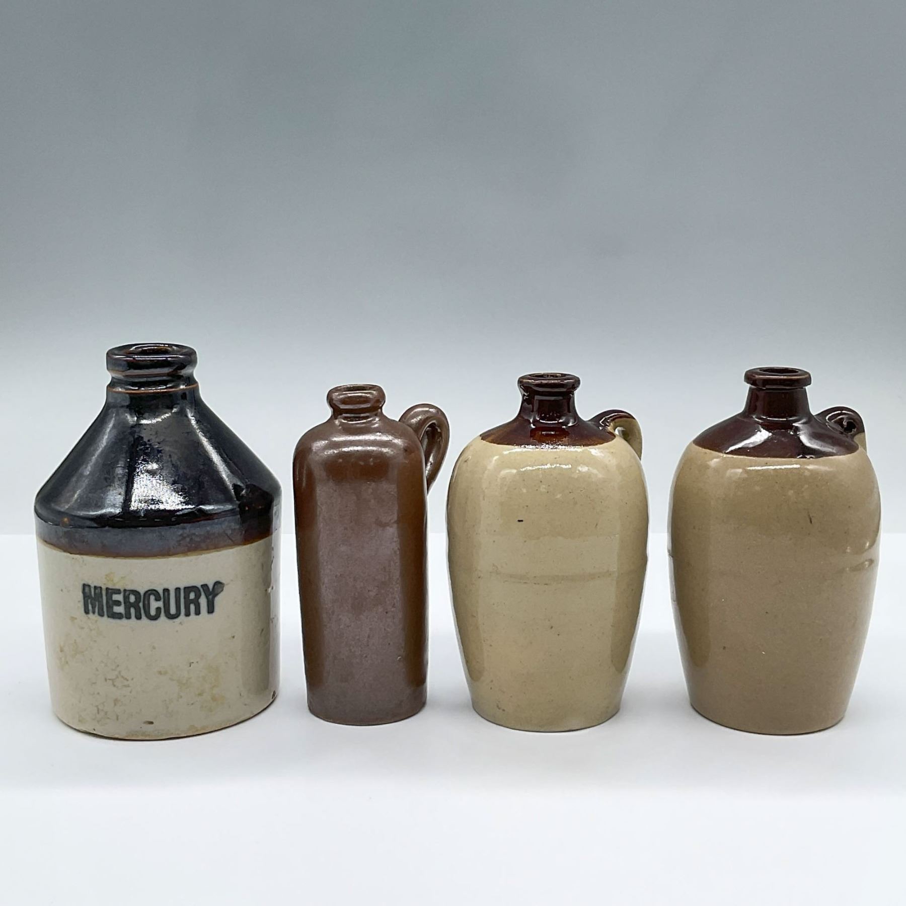 Features four rustic jugs, The sandy beige and brown jug is marked USA. The Mercury jug has a number 5 marking. Largest measures 2.75"L x 2.75"W x 4.75"H