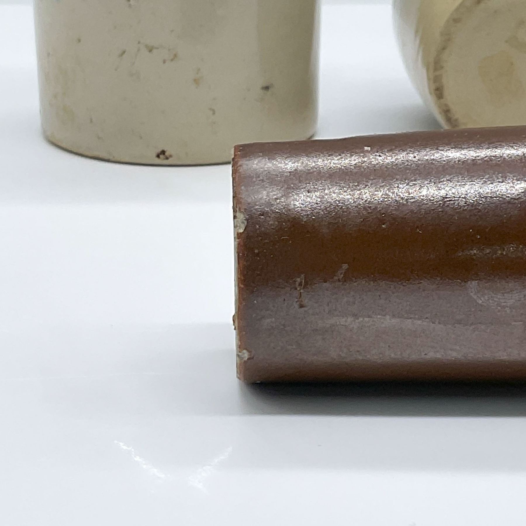 Condition: Age related wear. As is. Some scuff marks and stains on Mercury jug. Small chips at the bottom of small brown jug.