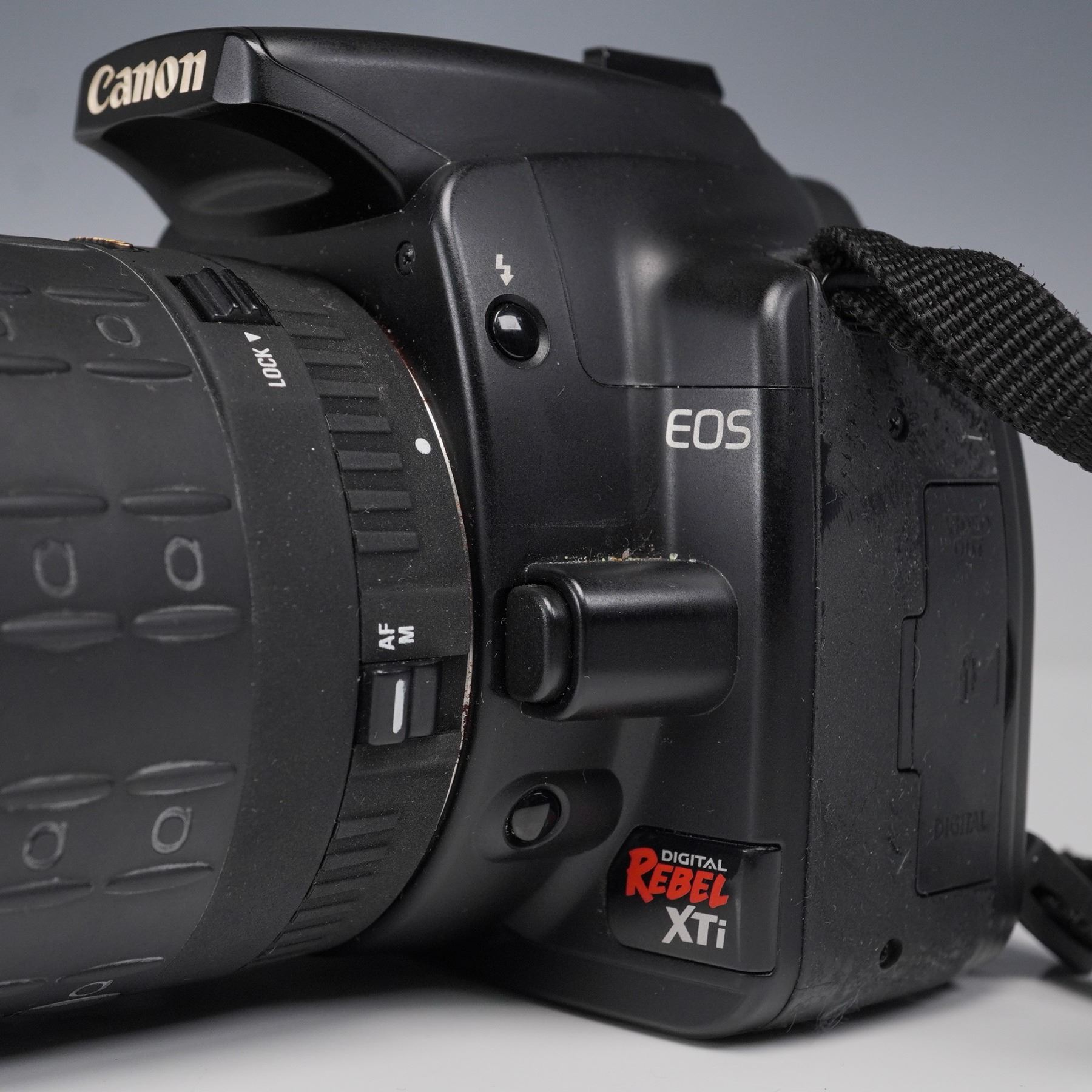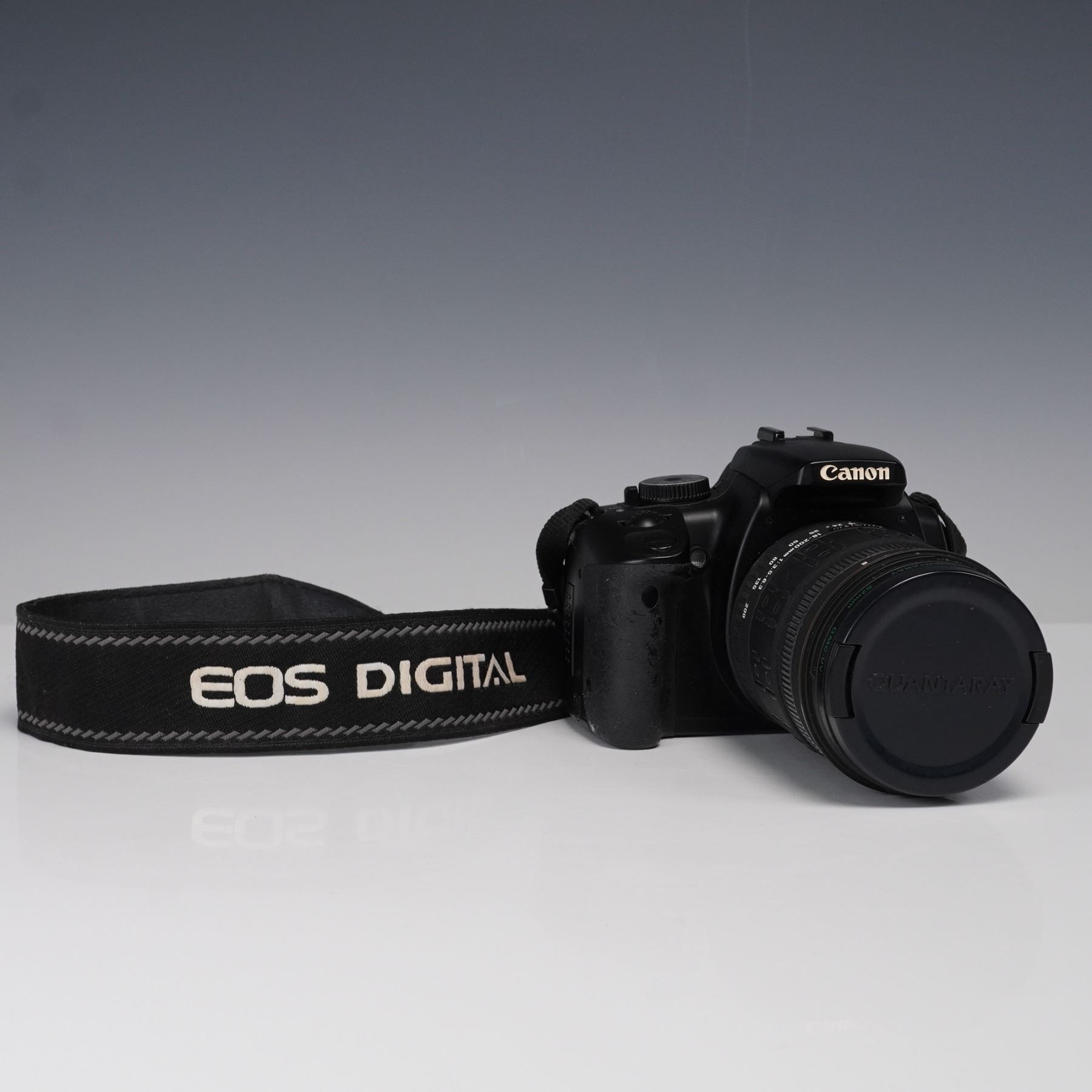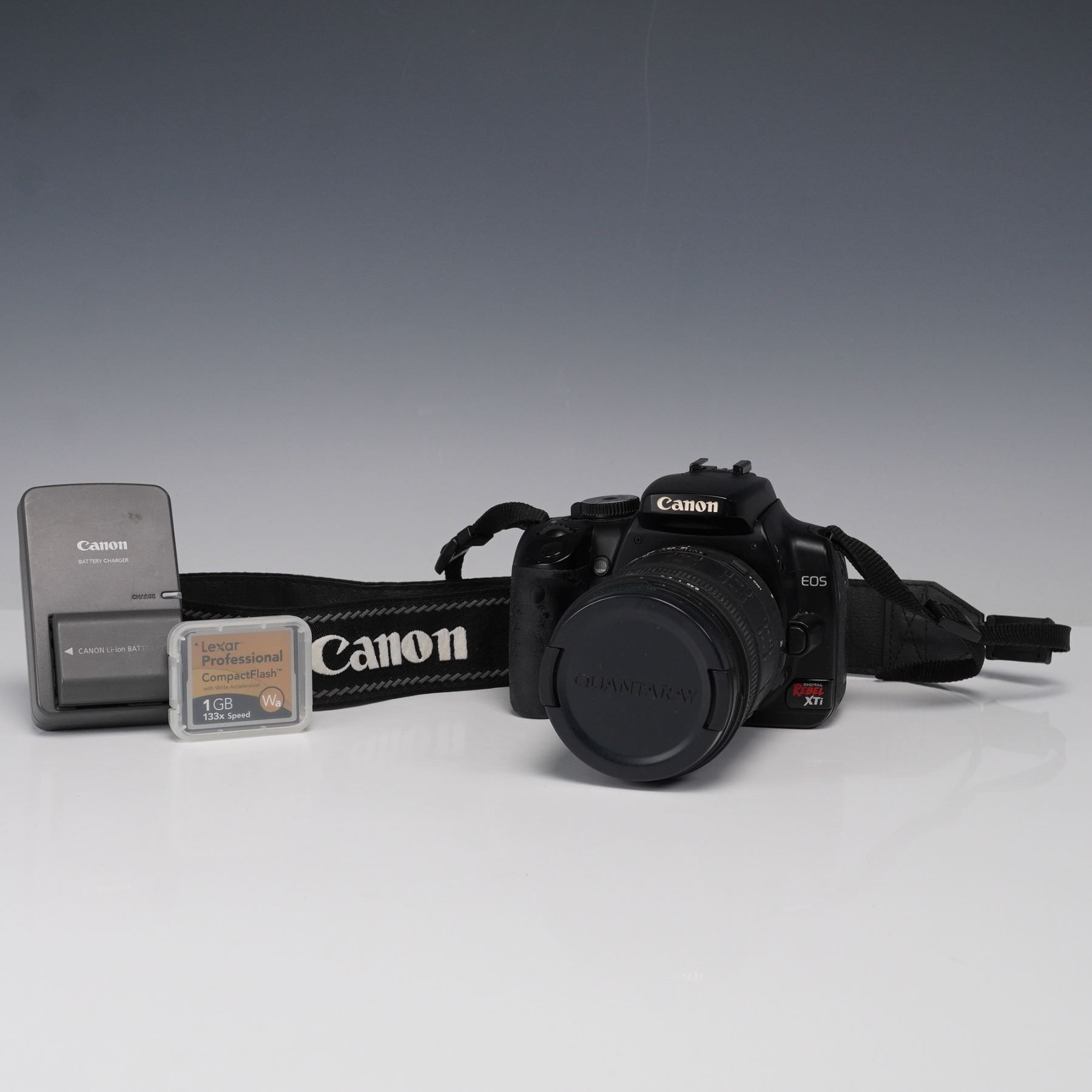 Canon EOS Digital Rebel XTi DSLR camera with Quantaray lens, original Canon neck strap, and battery charger with battery. Includes 1GB Lexar Professional CompactFlash memory card.