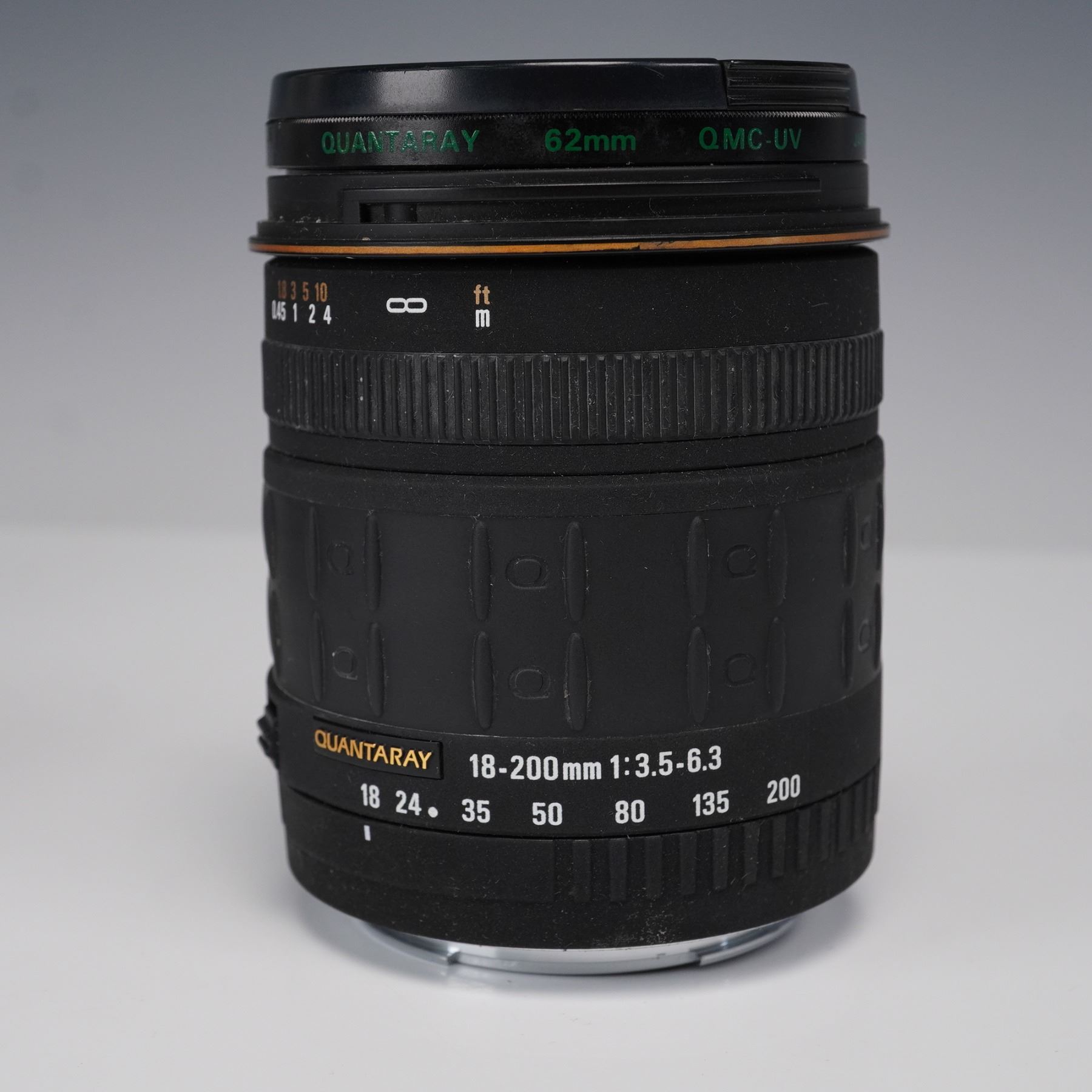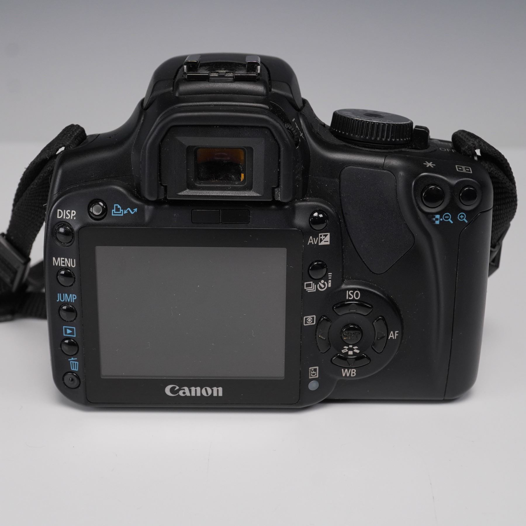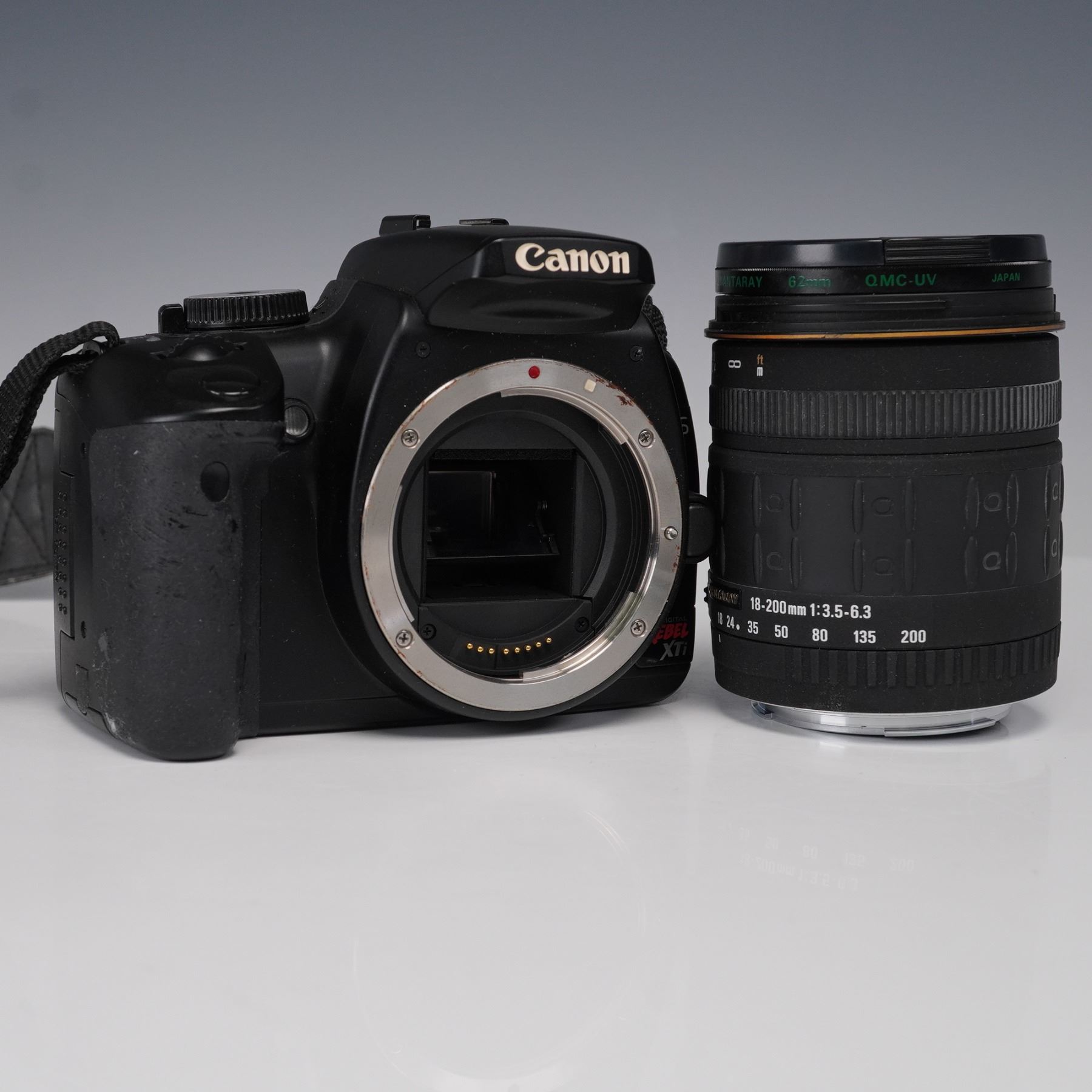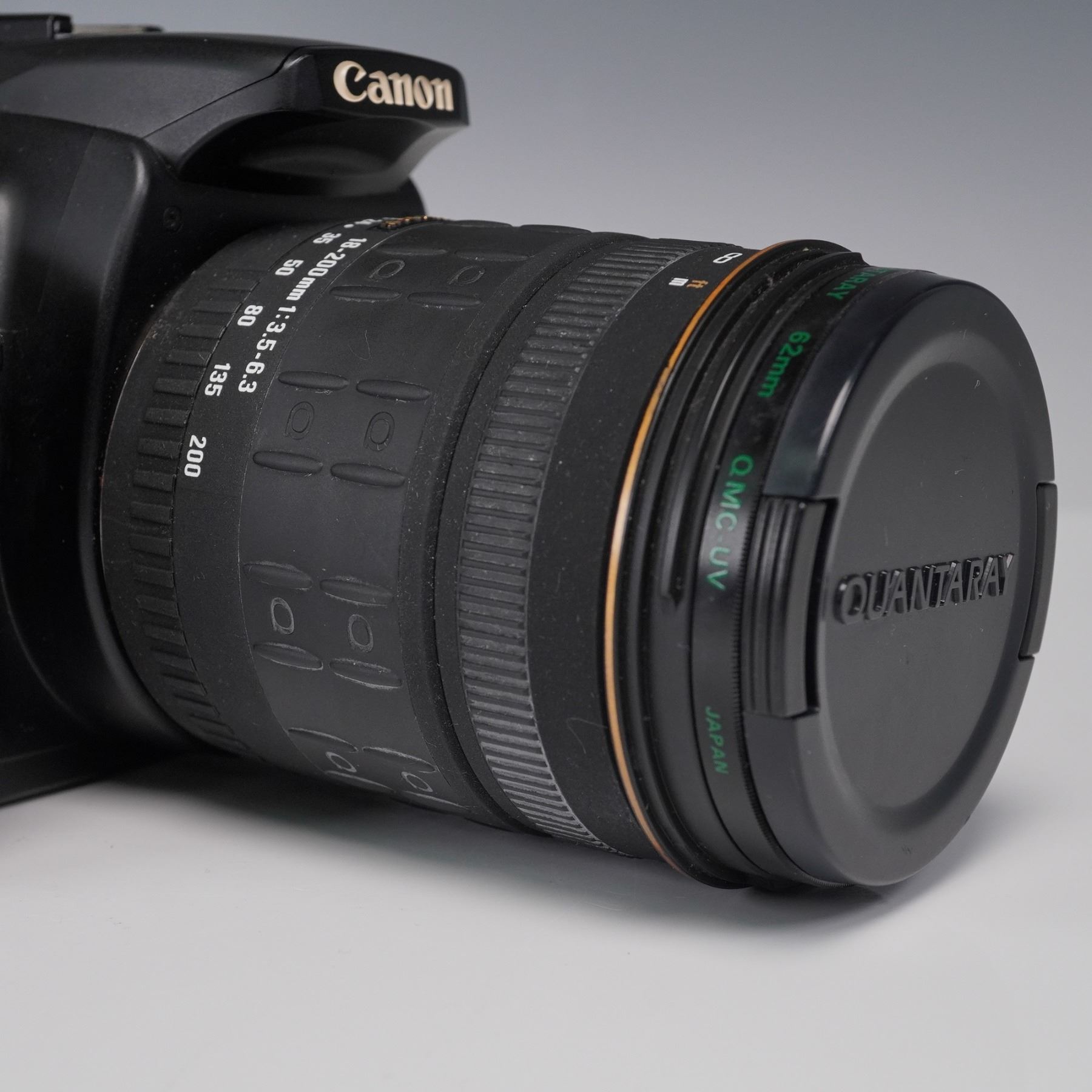 Canon EOS Digital Rebel XTi DSLR camera with Quantaray lens, original Canon neck strap, and battery charger with battery. Includes 1GB Lexar Professional CompactFlash memory card.