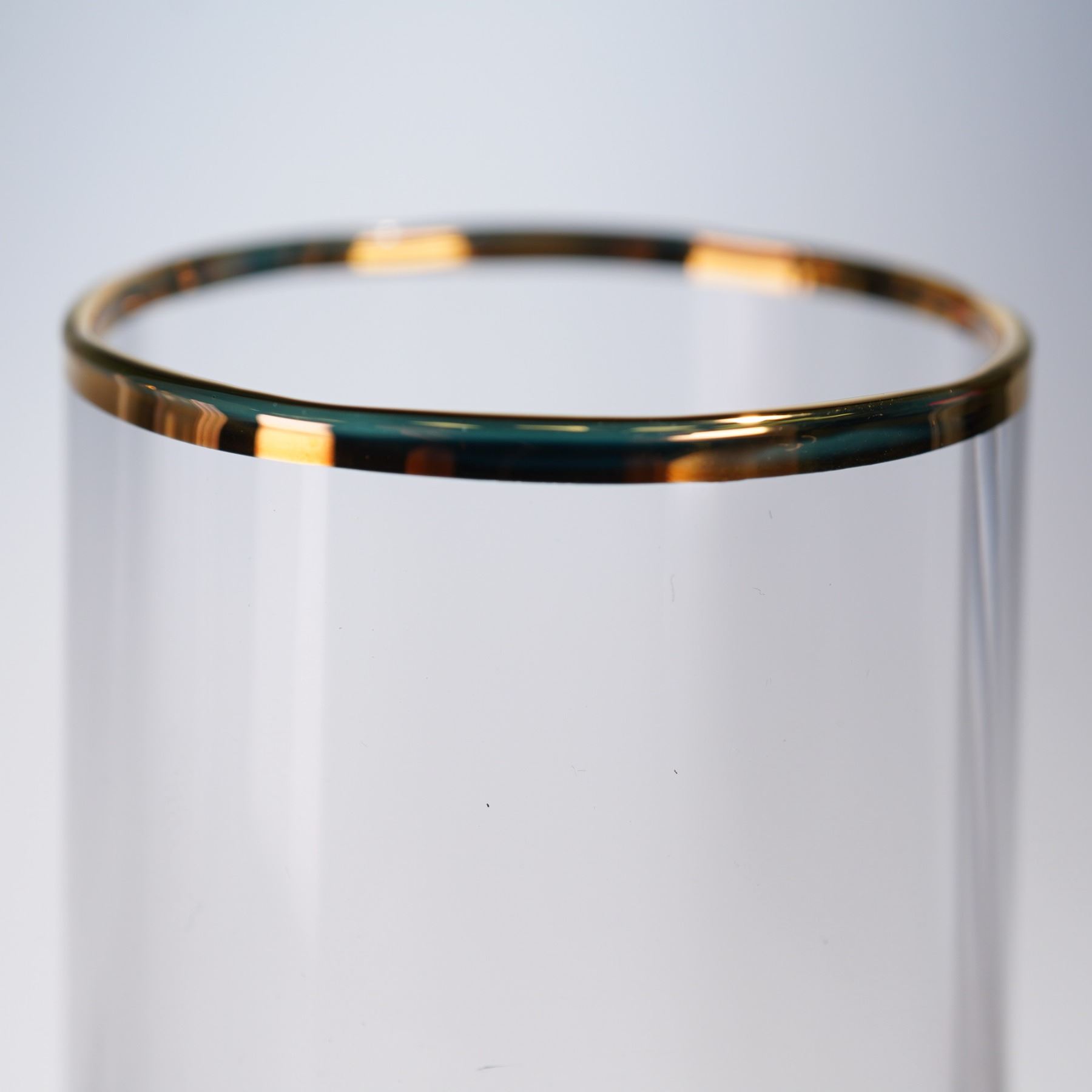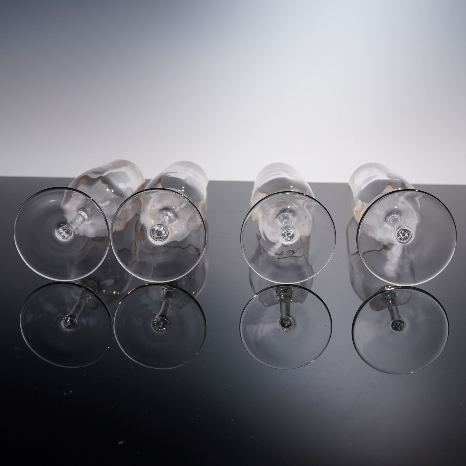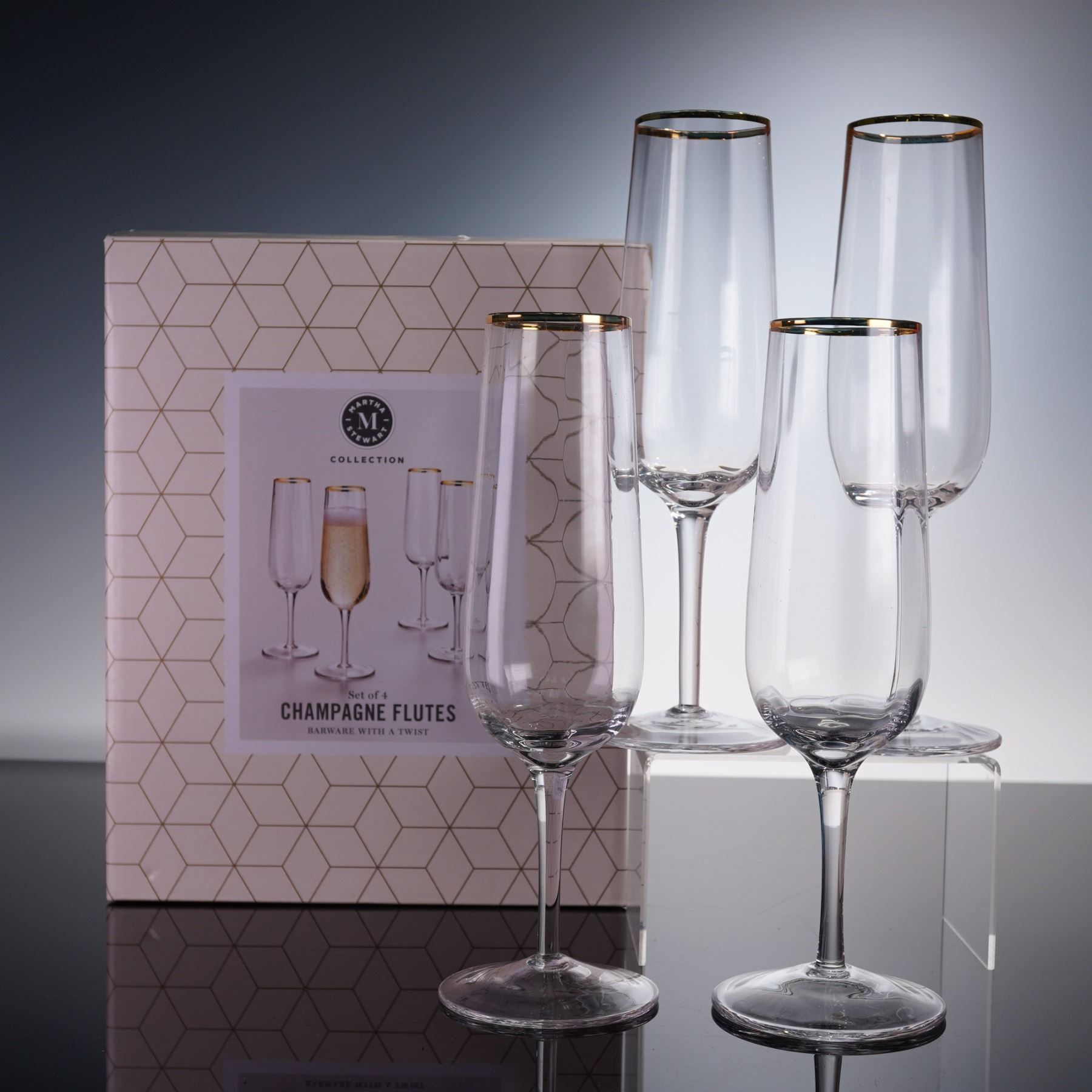 This elegant 4-piece set of champagne flutes from the Martha Stewart Collection features a timeless design with slender, tapered bowls and gleaming gold rims. Perfect for toasting celebrations, these glasses combine modern sophistication with classic charm. The set is presented in its original decorative box, ideal for both storage and gifting. Each flute measures approximately 9"H. Box: 8"L x 10.25"H.
