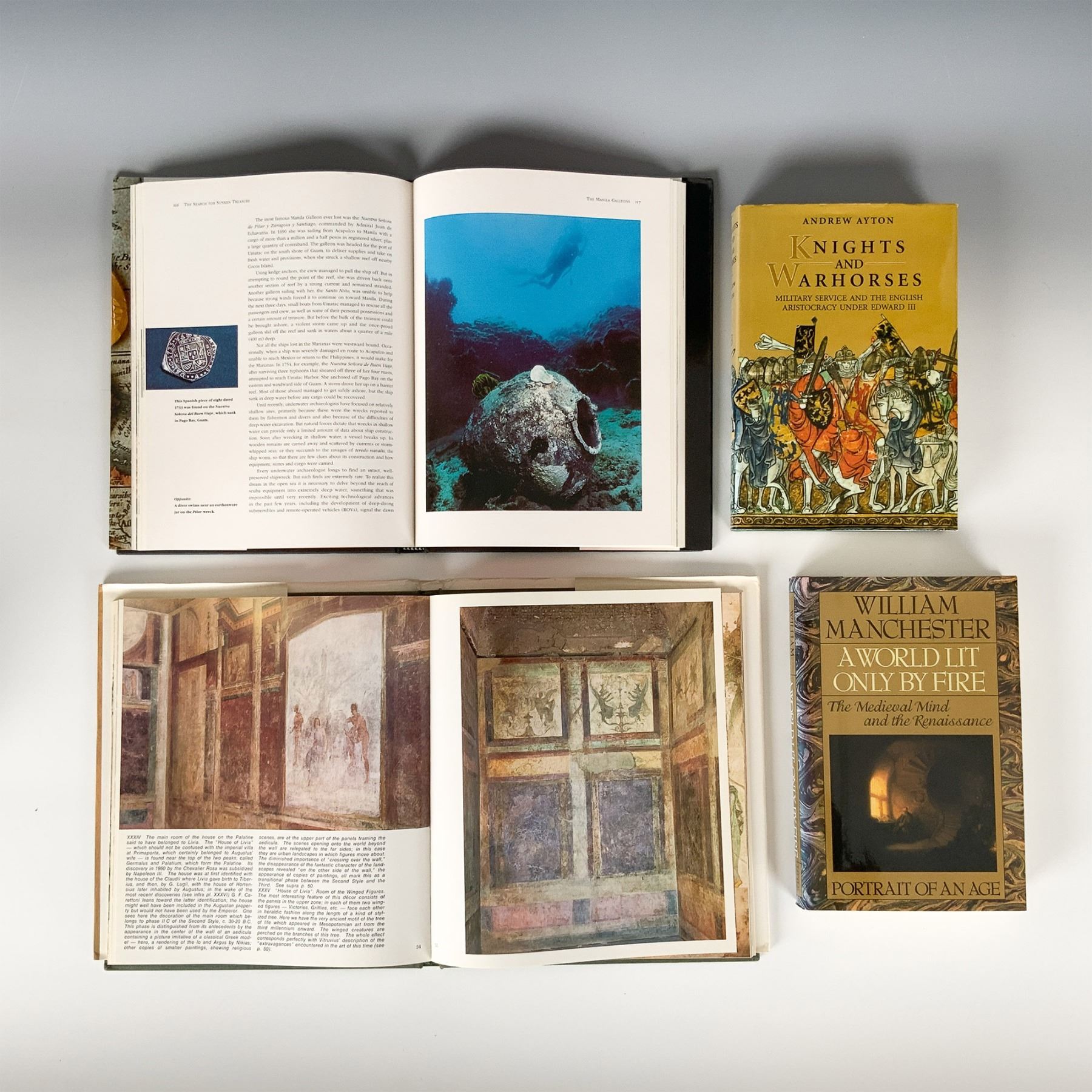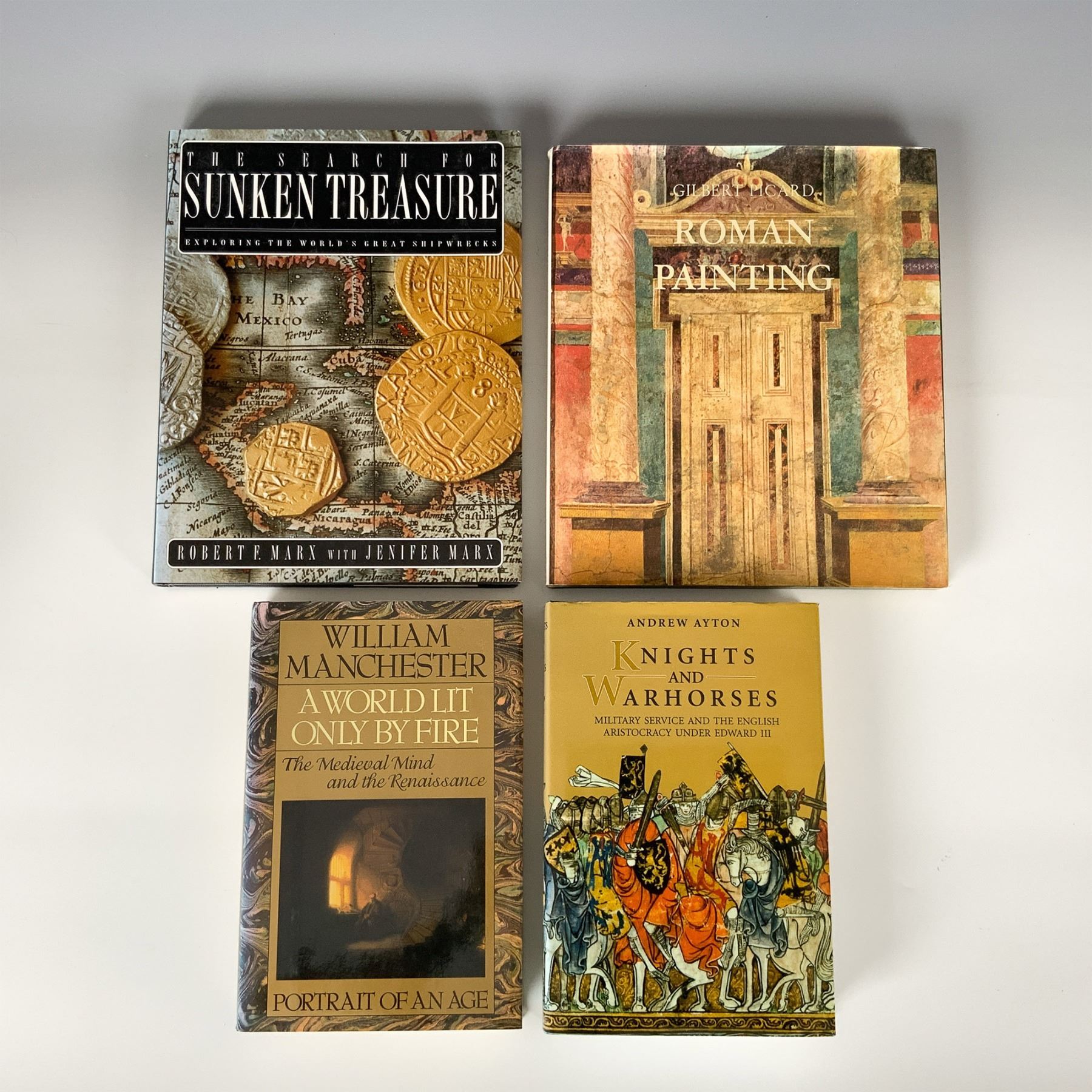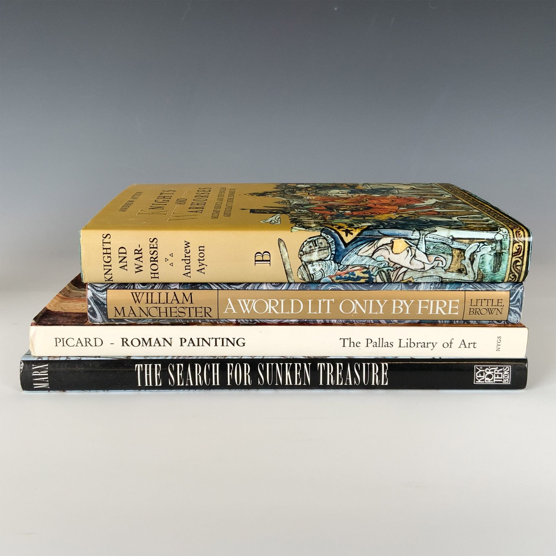 This collection of four hardcover books offers an engaging exploration of history, medieval warfare, art, and underwater discovery. Knights and Warhorses by Andrew Ayton provides an in-depth study of medieval chivalry, armor, and the critical role of warhorses in knightly combat. A World Lit Only by Fire by William Manchester presents a vivid narrative of the Middle Ages' transition into the Renaissance, capturing the era's brutality and intellectual awakening. Roman Painting by Picard, part of The Pallas Library of Art, showcases the beauty and intricacy of Roman frescoes and mural art, providing insight into ancient aesthetics. The Search for Sunken Treasure delves into maritime archaeology, recounting thrilling discoveries of shipwrecks and lost artifacts beneath the ocean’s depths. Largest book measures 11.25"H.