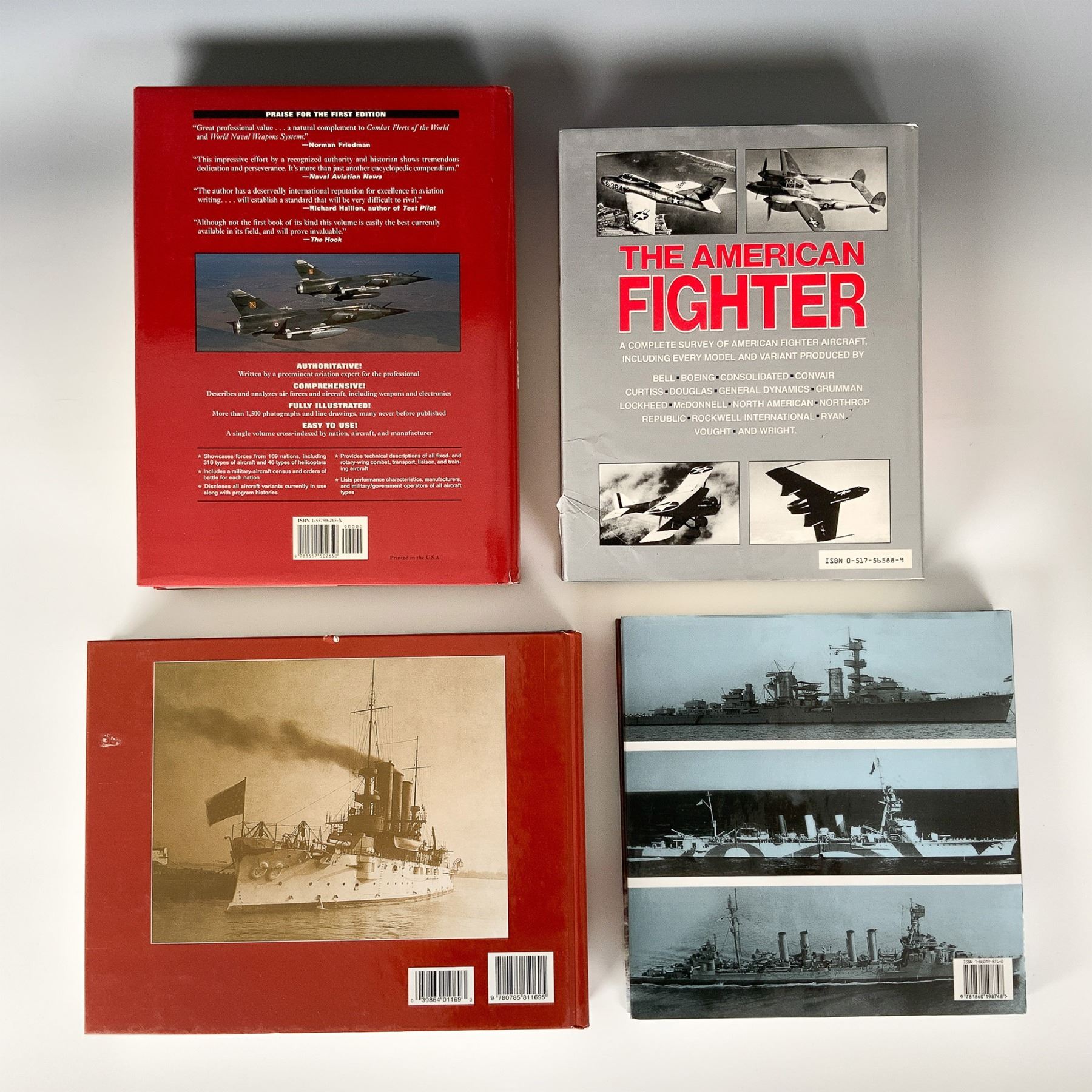 A collection of four hardcover books covering military and aviation history, warships, and fighter aircraft. This lot includes Cruisers of World War Two by M.J. Whitley, a comprehensive guide detailing the design, deployment, and combat history of cruisers used during World War II; The American Fighter by Enzo Angelucci and Peter Bowers, an in-depth reference on American fighter aircraft with technical specifications, design evolution, and historical significance; The Naval Institute Guide to World Military Aviation 1997-1998 by René J. Francillon, an annual publication from the Naval Institute Press covering global military aviation updates and developments; and The History of Warships by Christopher Chant, a historical exploration of naval warfare and warship evolution, published by Chartwell Books Inc. Each book is a valuable resource for military historians, aviation enthusiasts, and collectors. Largest book measures 12.25'H.