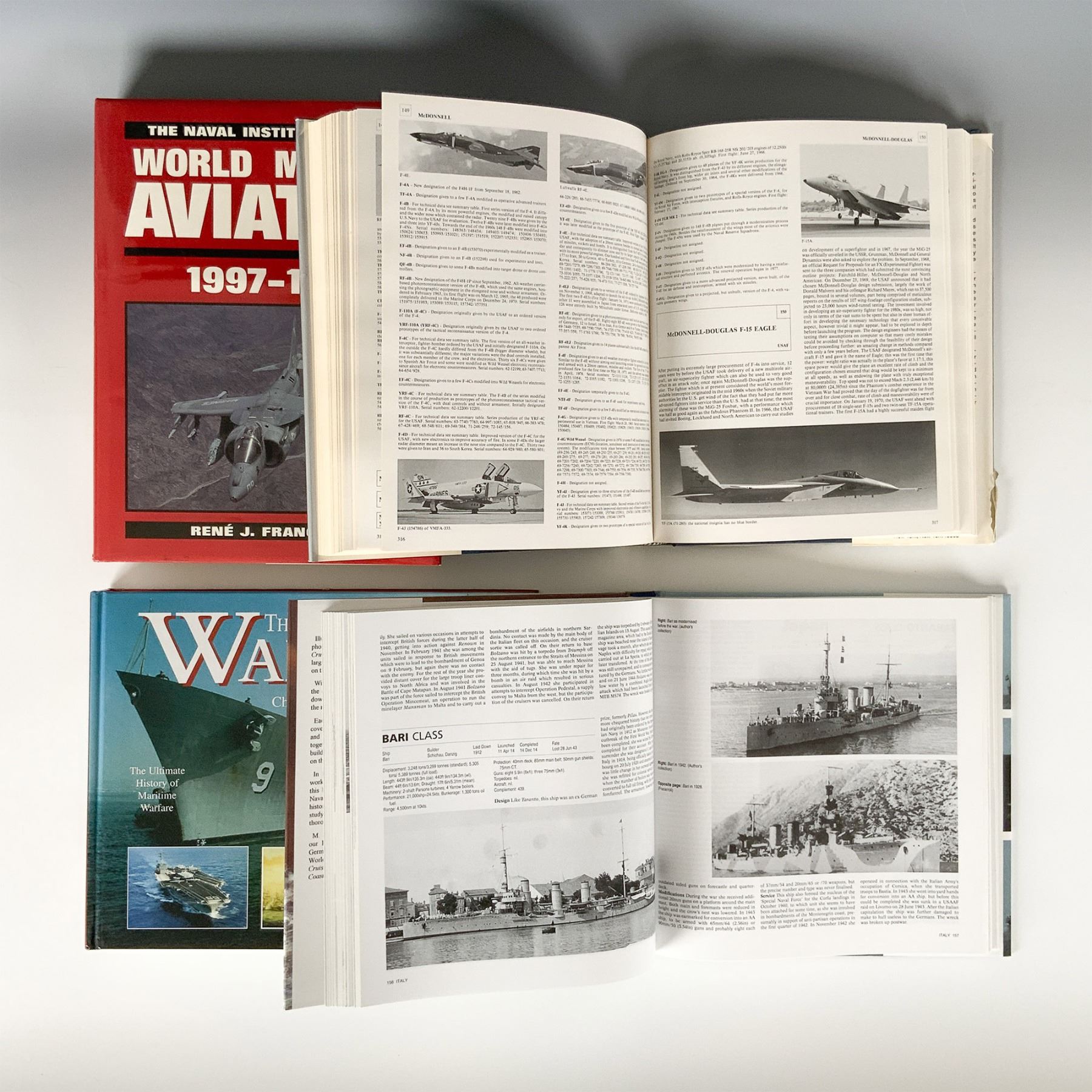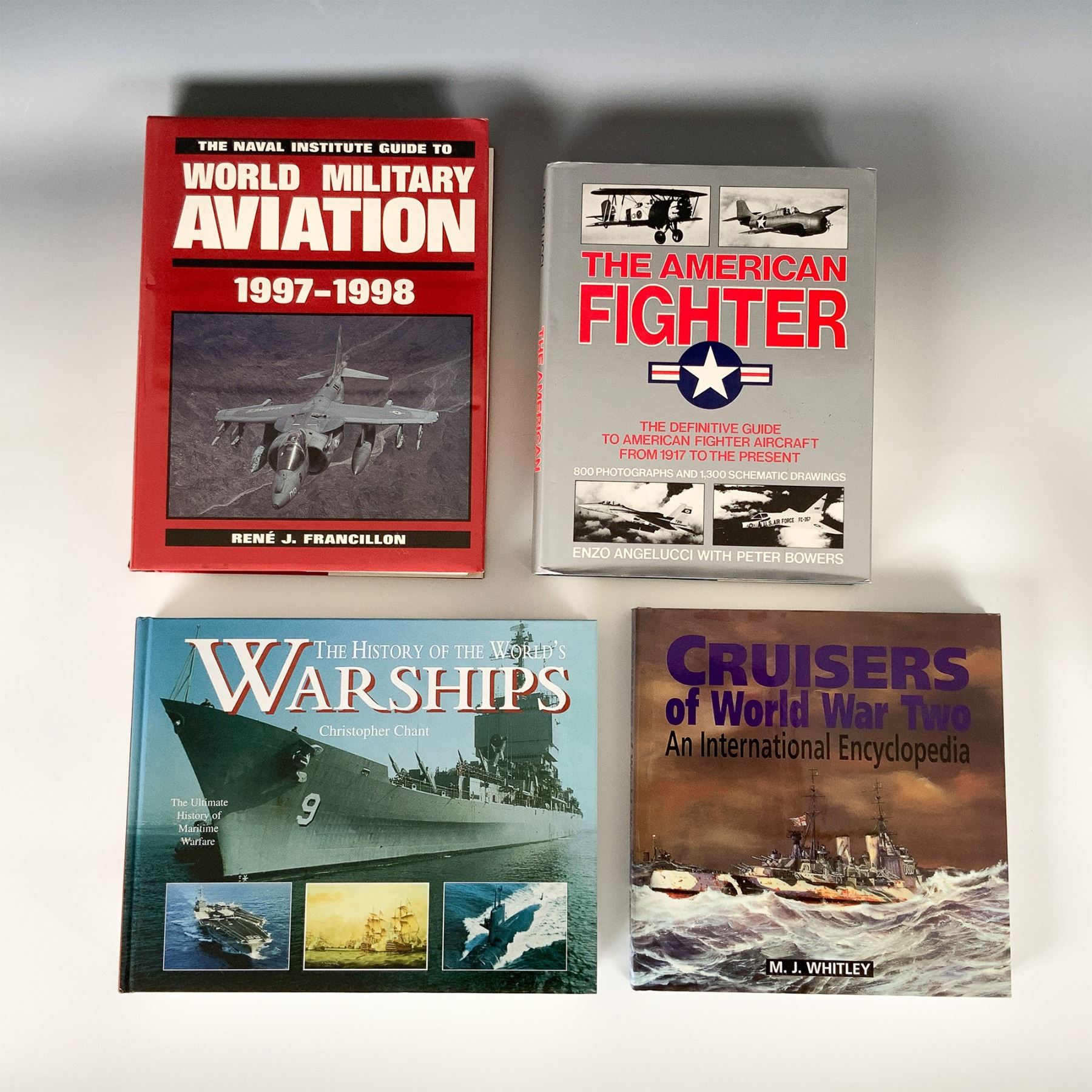 A collection of four hardcover books covering military and aviation history, warships, and fighter aircraft. This lot includes Cruisers of World War Two by M.J. Whitley, a comprehensive guide detailing the design, deployment, and combat history of cruisers used during World War II; The American Fighter by Enzo Angelucci and Peter Bowers, an in-depth reference on American fighter aircraft with technical specifications, design evolution, and historical significance; The Naval Institute Guide to World Military Aviation 1997-1998 by René J. Francillon, an annual publication from the Naval Institute Press covering global military aviation updates and developments; and The History of Warships by Christopher Chant, a historical exploration of naval warfare and warship evolution, published by Chartwell Books Inc. Each book is a valuable resource for military historians, aviation enthusiasts, and collectors. Largest book measures 12.25'H.