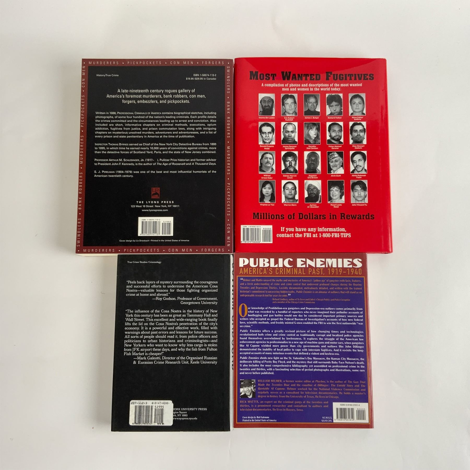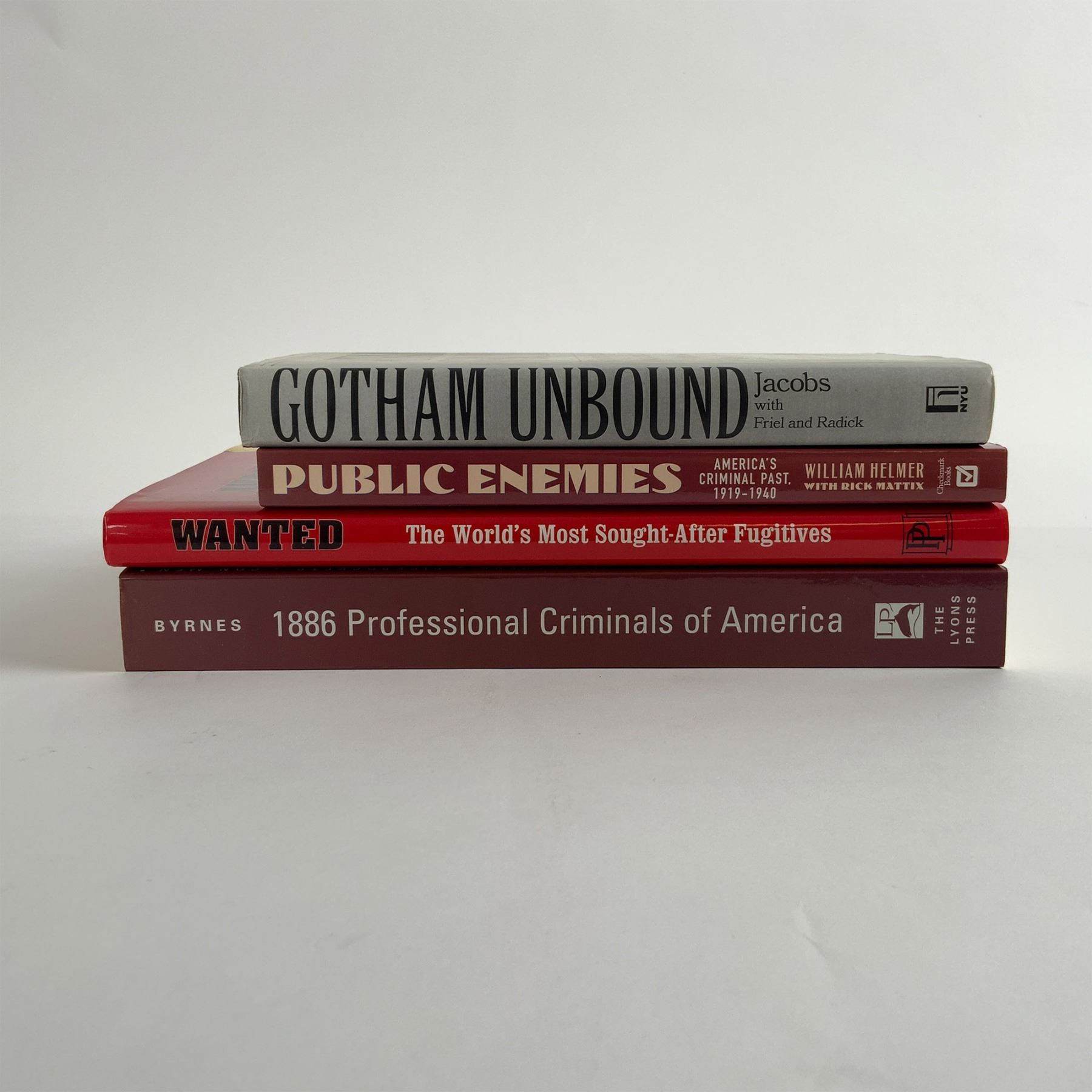This collection includes four books exploring crime, fugitives, and organized crime history in America. Gotham Unbound by James B. Jacobs with Coleen Friel and Robert Radick examines how New York City was liberated from the grip of organized crime. Public Enemies: America's Criminal Past, 1919-1940 by William Helmer with Rick Mattix delves into the history of some of the most notorious gangsters of the early 20th century. Wanted: The World's Most Sought-After Fugitives provides a compelling look at high-profile fugitives and their criminal backgrounds. 1886 Professional Criminals of America by Inspector Thomas Byrnes is a reprint of a historic law enforcement book profiling criminals of the late 19th century. Each book offers unique insight into crime and justice, making this a great addition for collectors or true crime enthusiasts. Largest book measures 11.25"H.