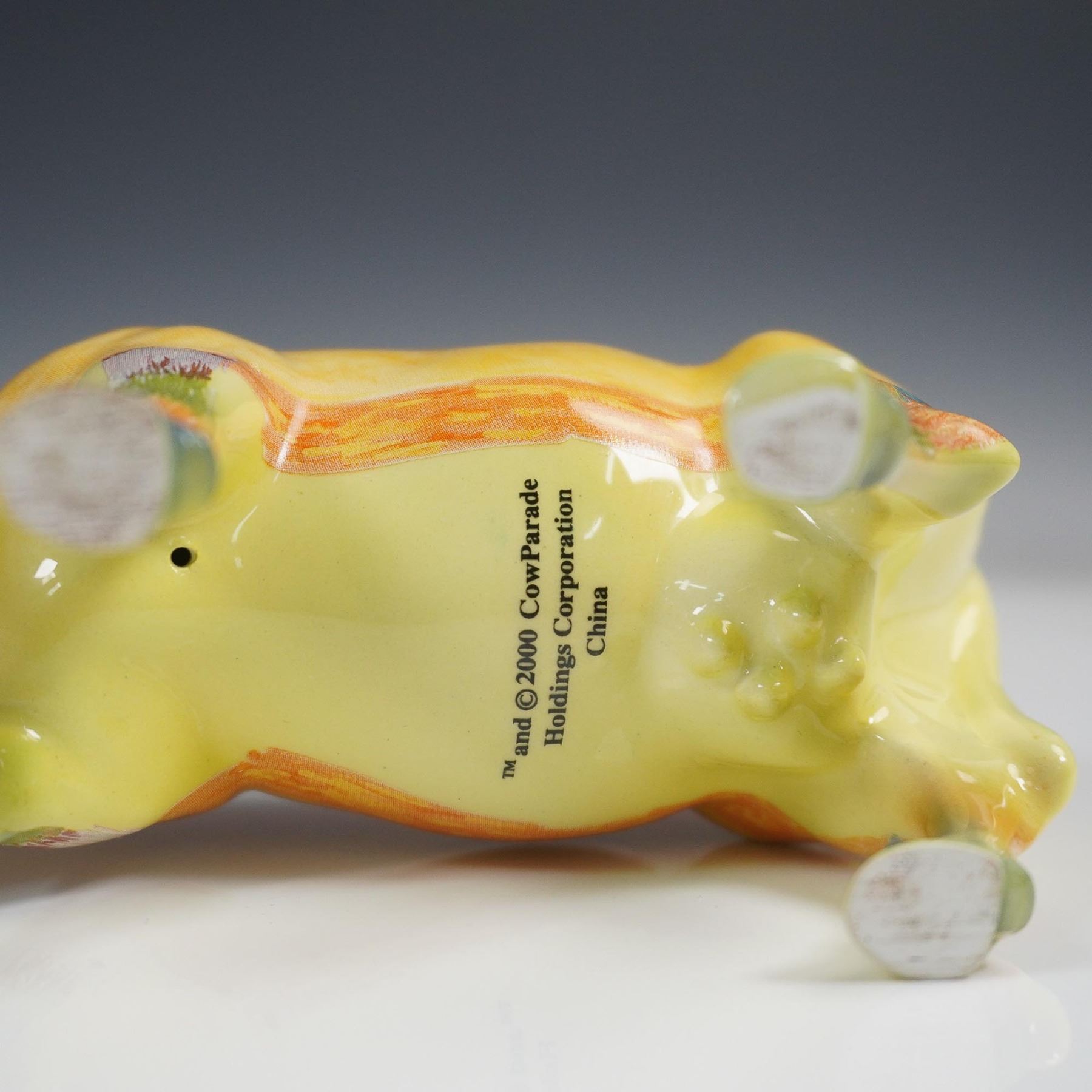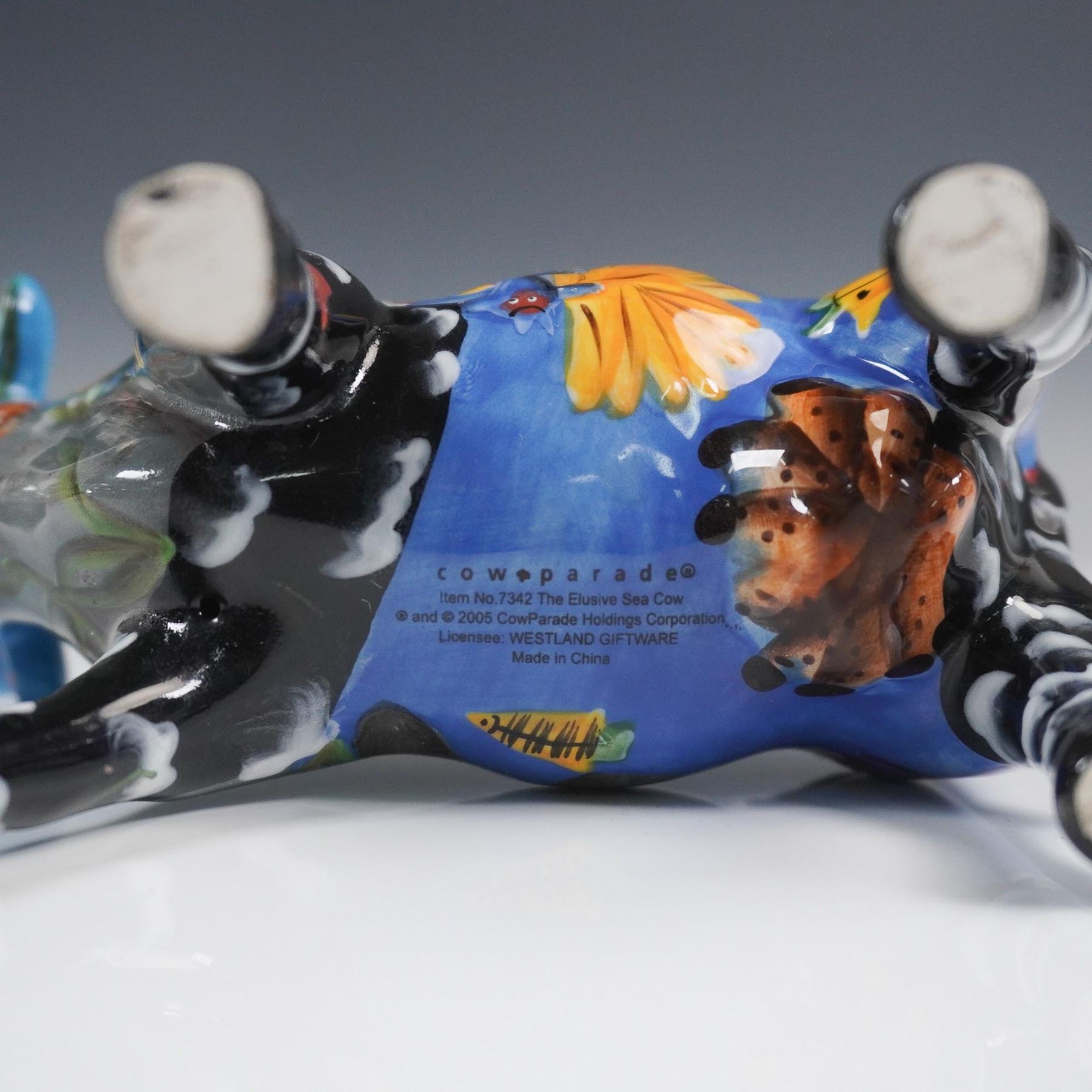 Set of four collectible CowParade ceramic figurines, each measuring approximately 6.25"L. Produced in the early 2000s by CowParade Holdings Corporation, these whimsical cows feature a variety of artistic designs including an undersea scene, impressionist landscape, pin-up figures, and pastoral countryside. Each cow is marked on the underside with the official CowParade logo and copyright information. These vibrant, humorous pieces are part of the globally celebrated CowParade public art initiative and make for charming additions to any modern art or figurine collection.