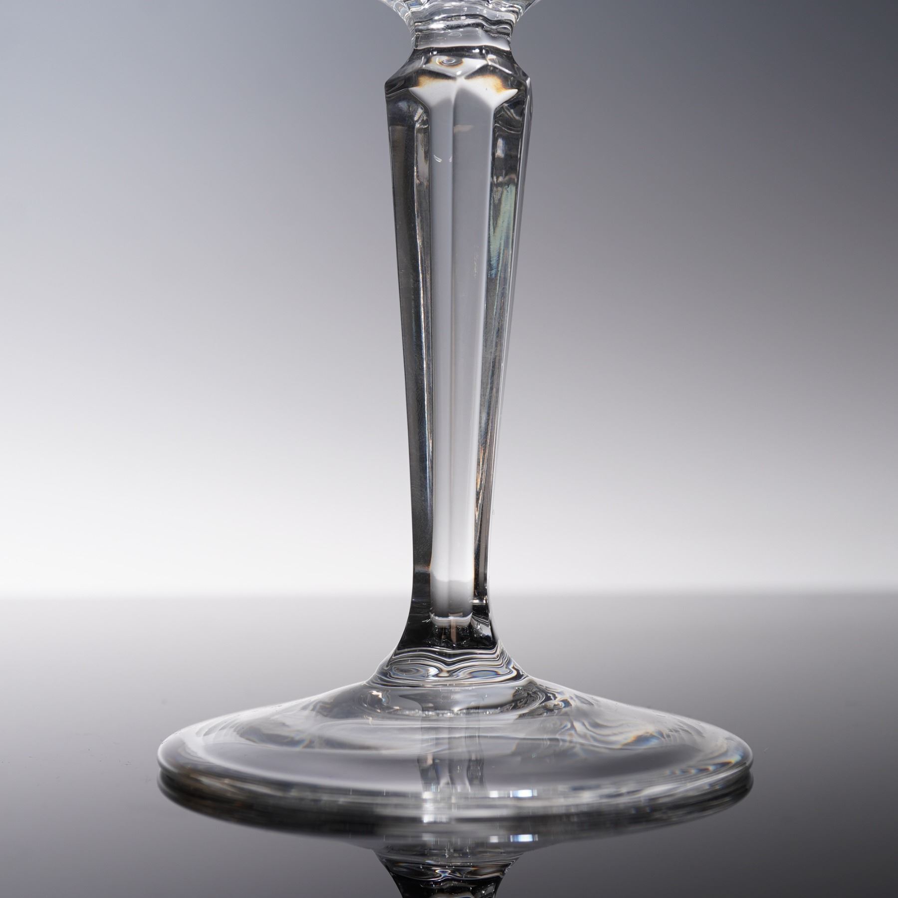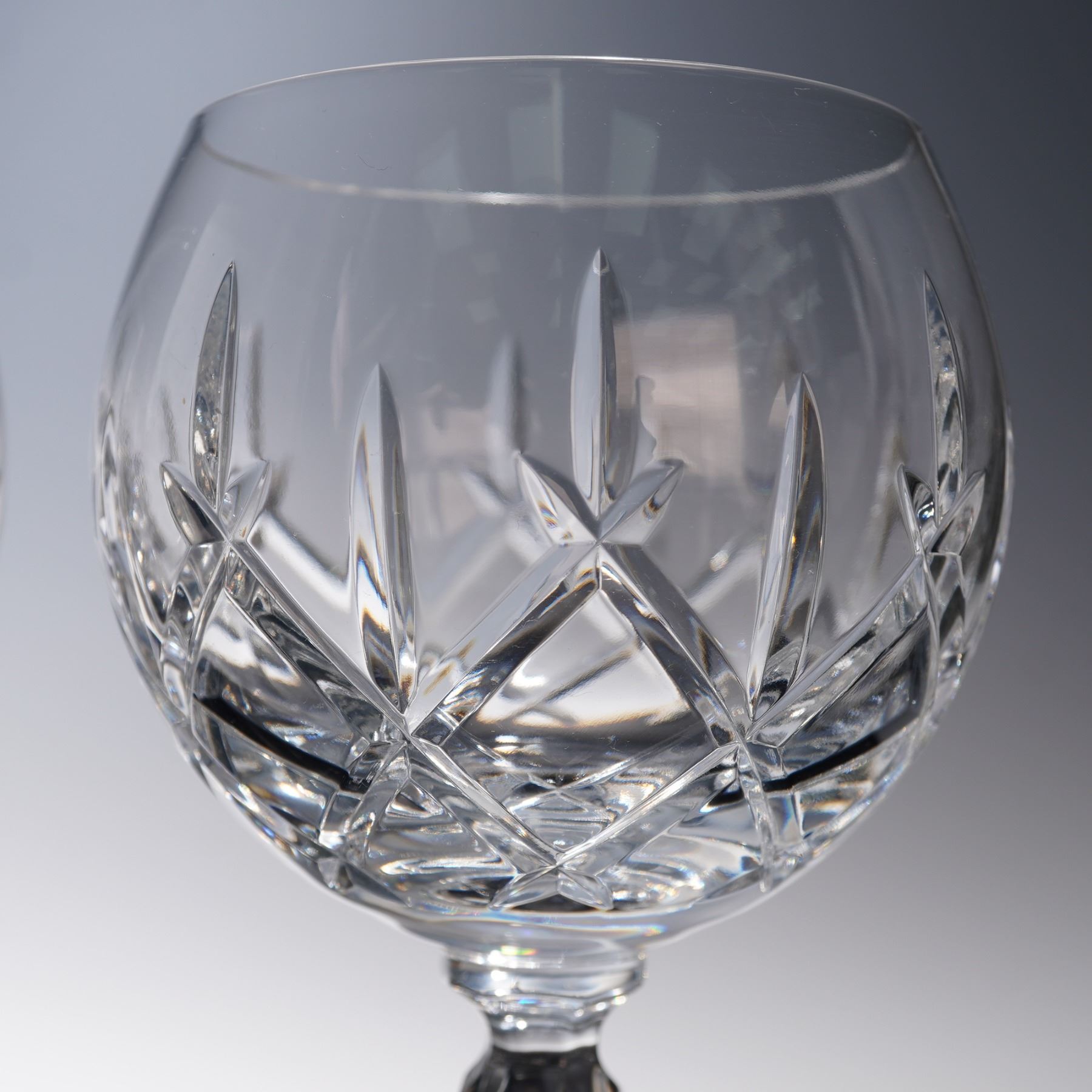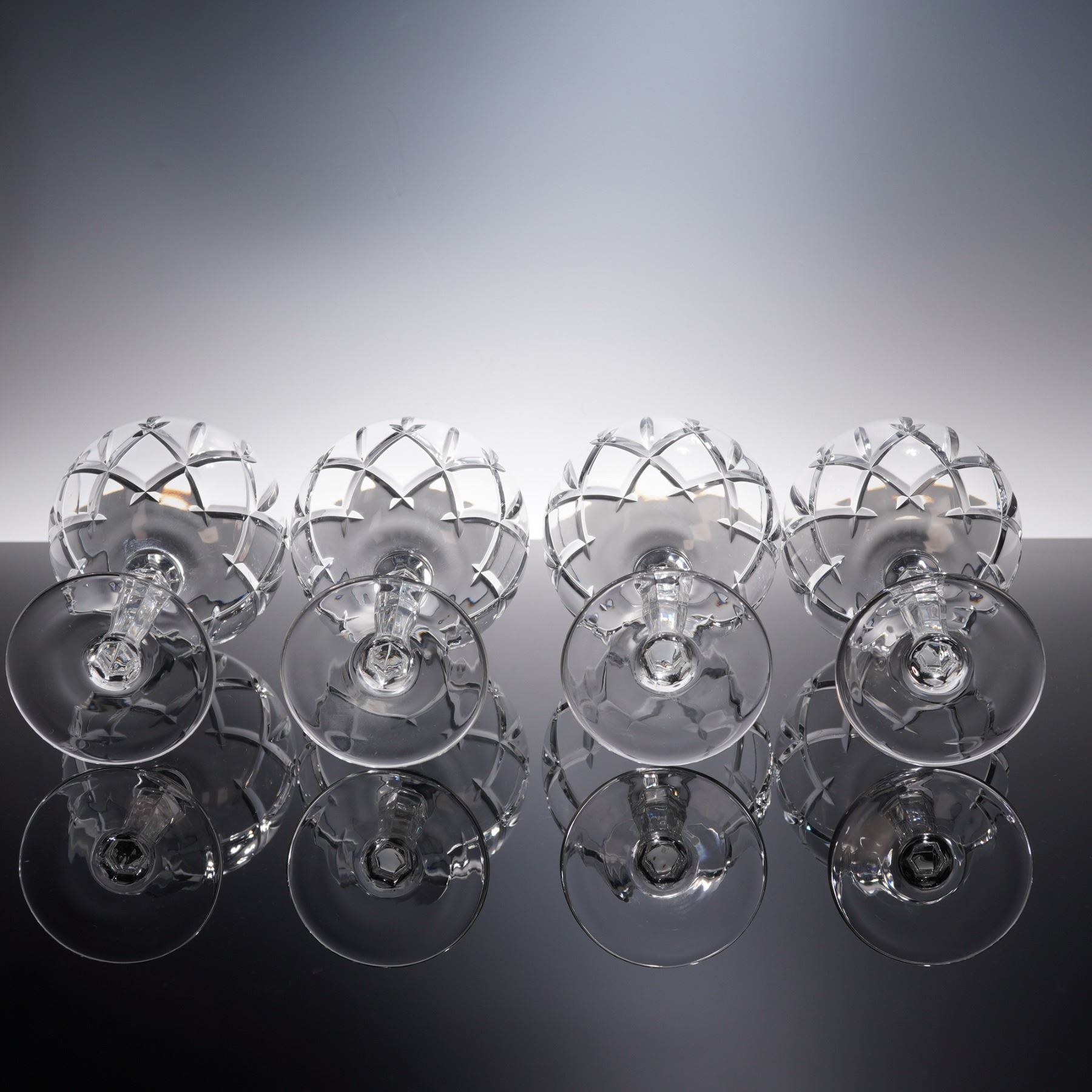 A set of four balloon wine glasses crafted in clear cut crystal with bold crosshatched and starburst patterns that reflect the light beautifully. Each glass features a faceted stem that adds balance and elegance, making them perfect for serving red wine or specialty cocktails.