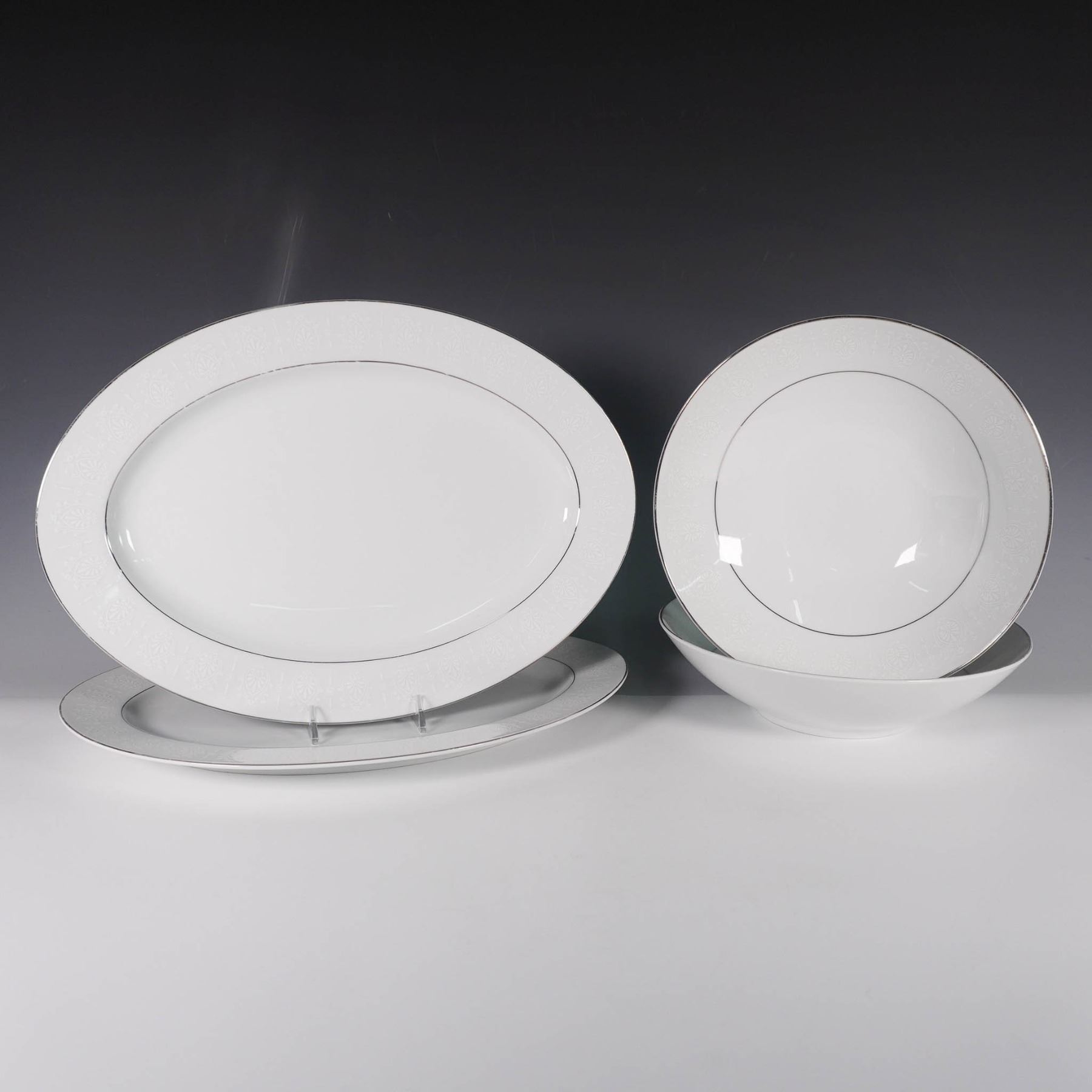 Crown Empire fine china tableware set in the Princess pattern, featuring white floral and fleur-de-lis decorations with metallic-silver trim. This collection includes two round serving bowls and two oval serving trays. The pattern showcases an embossed decorative border, complementing the overall design. Crown Empire backstamp. Round serving bowl: 9.5"W x 2.5"H. Oval serving tray: 14.25"L x 10.25"W x 1"H.