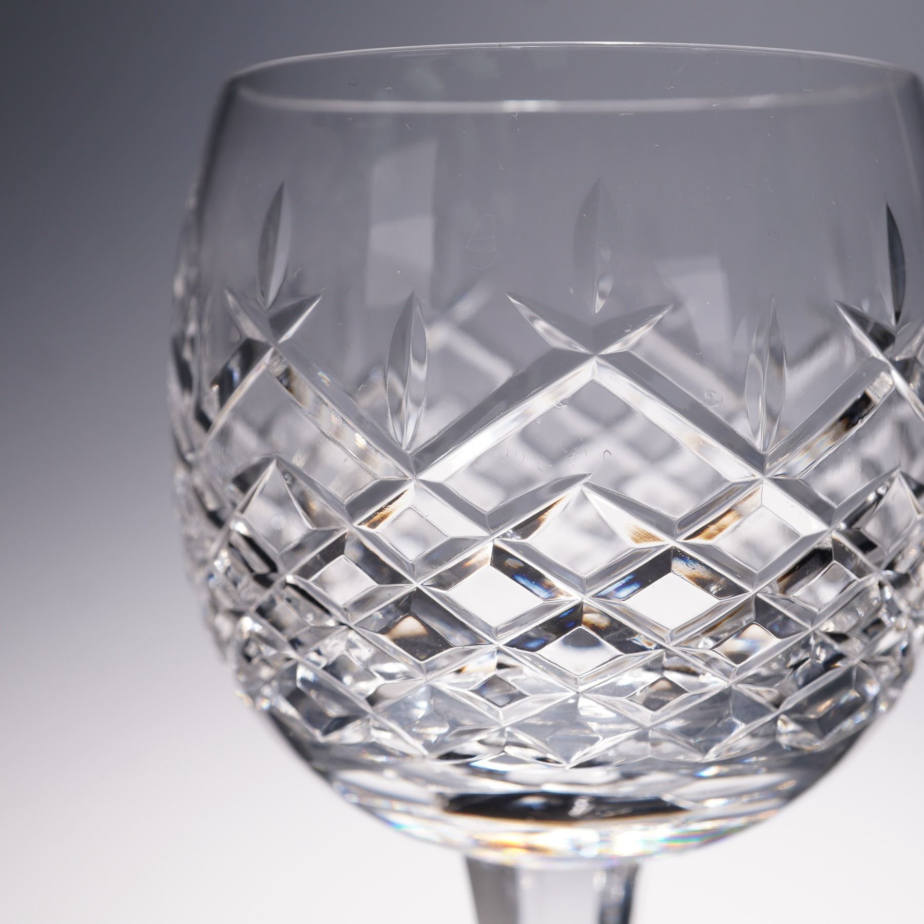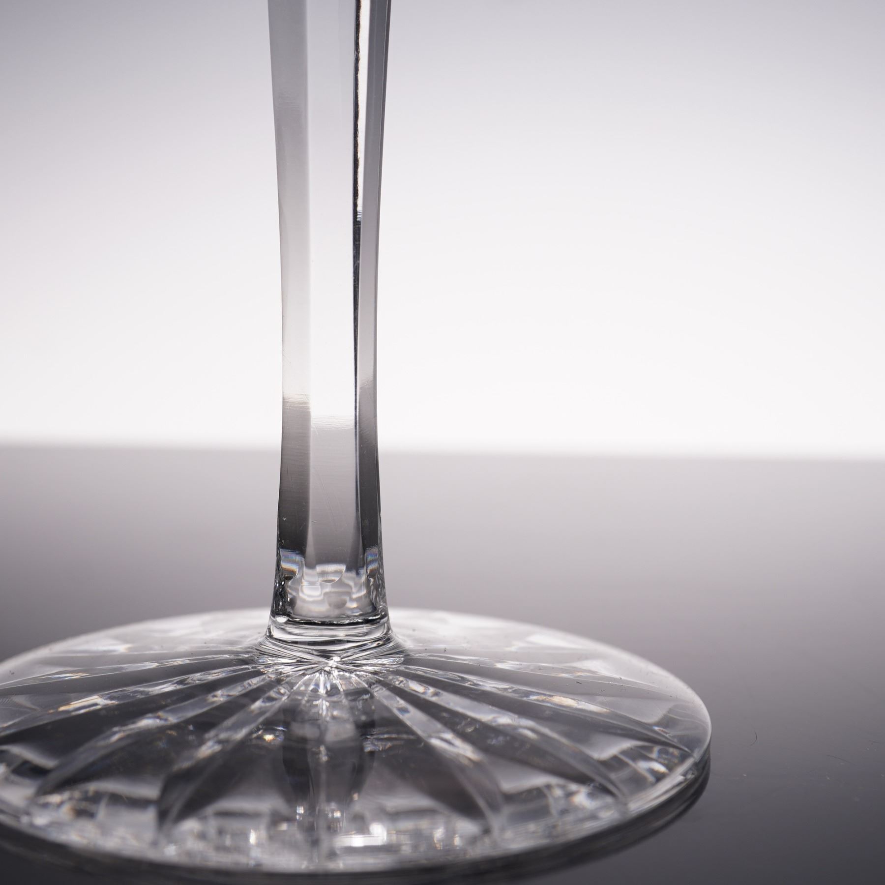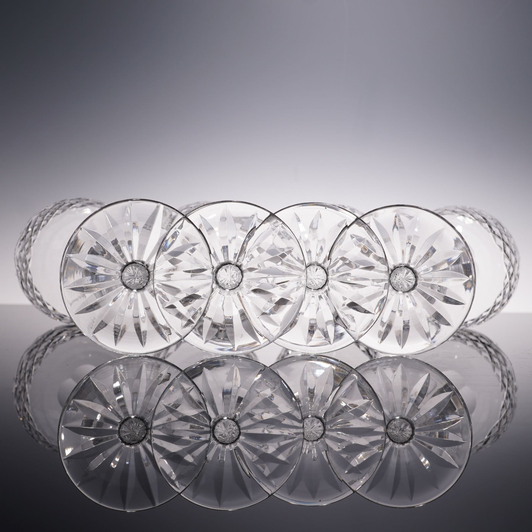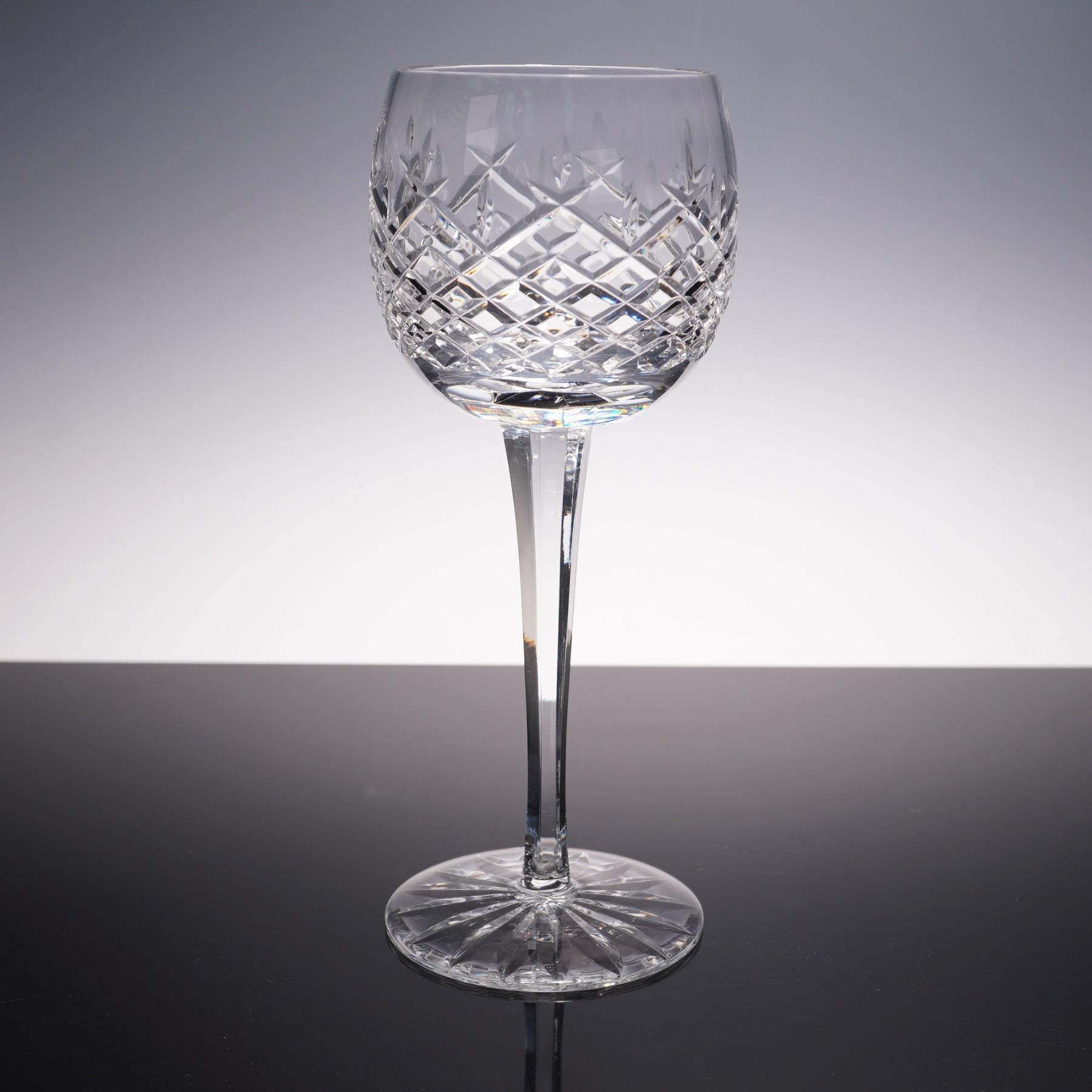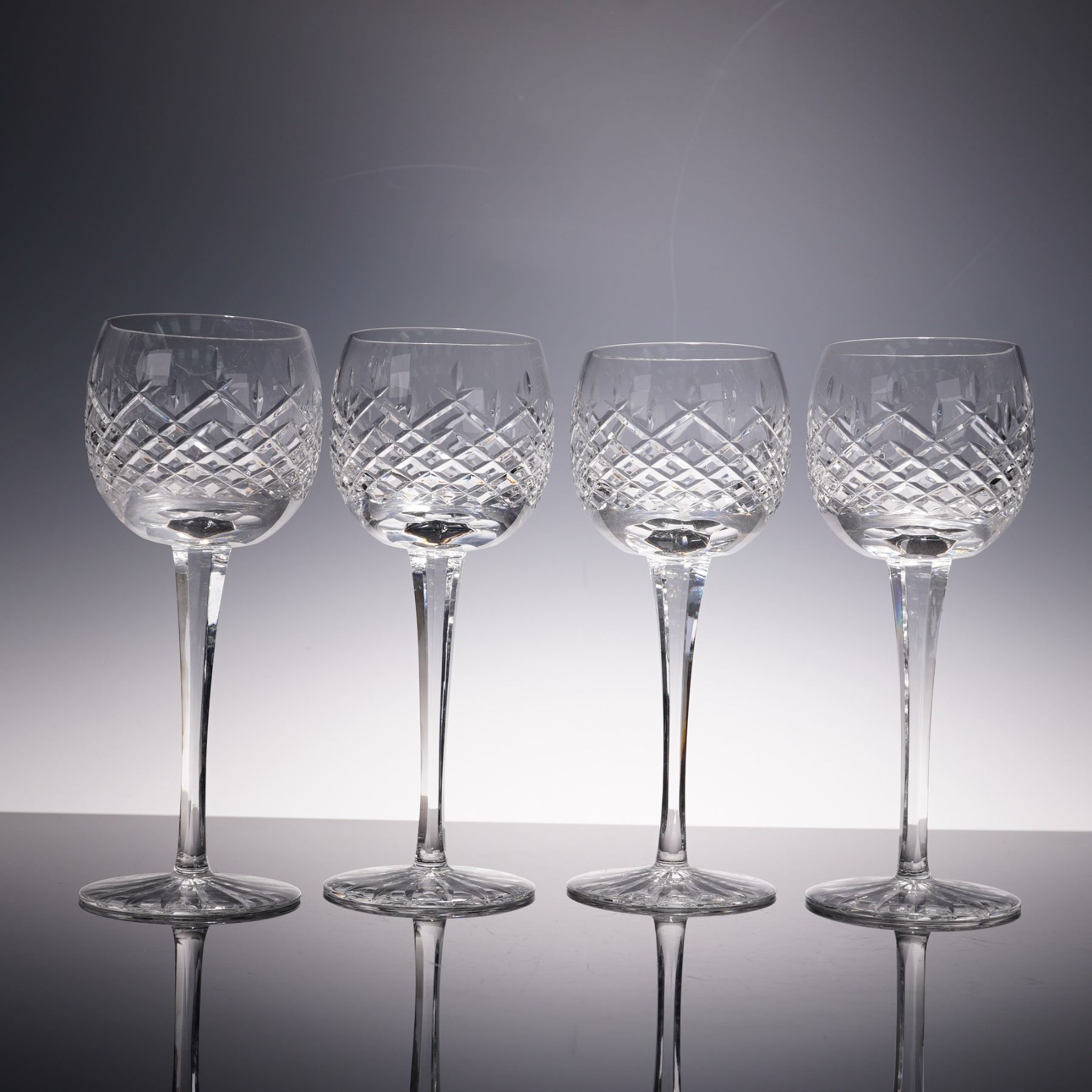 This set of four crystal claret wine glasses features a striking diamond cut pattern accented with vertical leaf motifs, creating a brilliant play of light with every angle. The elongated stems add grace and balance, making them ideal for both formal entertaining and everyday sophistication. A timeless addition to any collection of fine stemware.